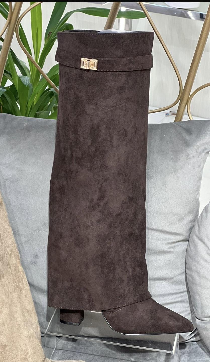 Bota con polaina de antelina en color choco y con detalle dorado en la parte superior de la bota.