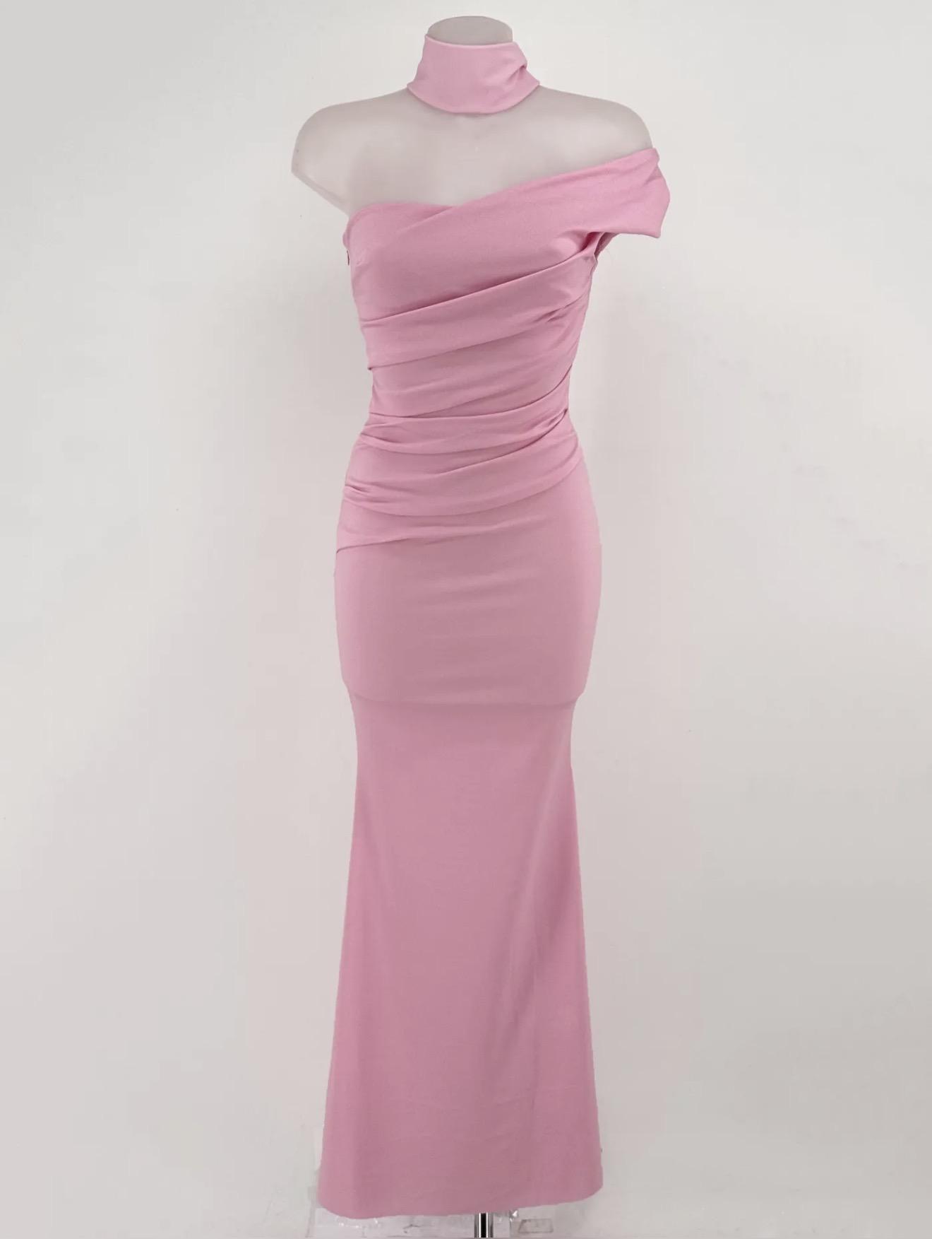 Vestido largo de fiesta con escote asimétrico, drapeado y con cinta para el cuello que sale desde la parte de atrás del brazo.
