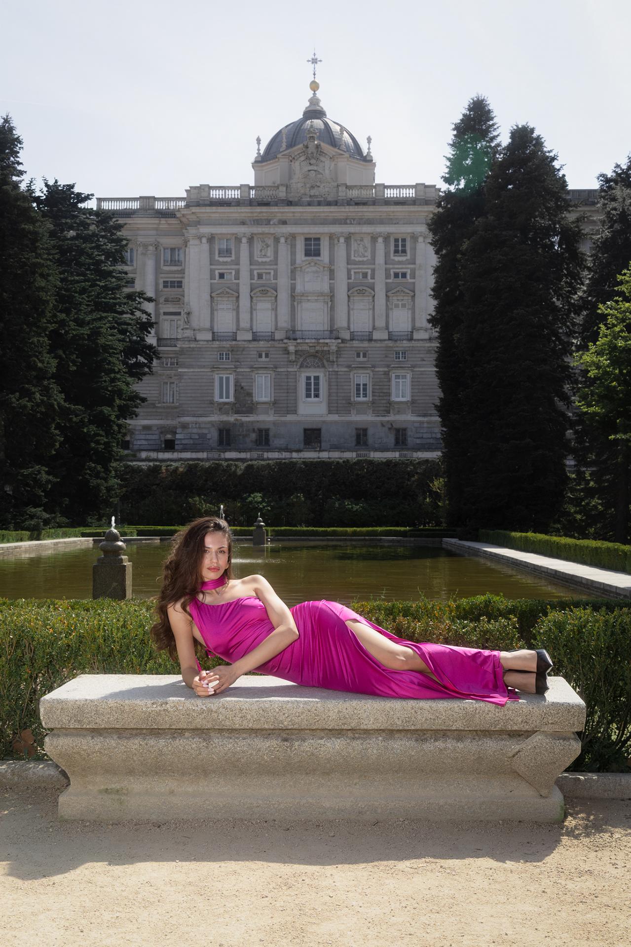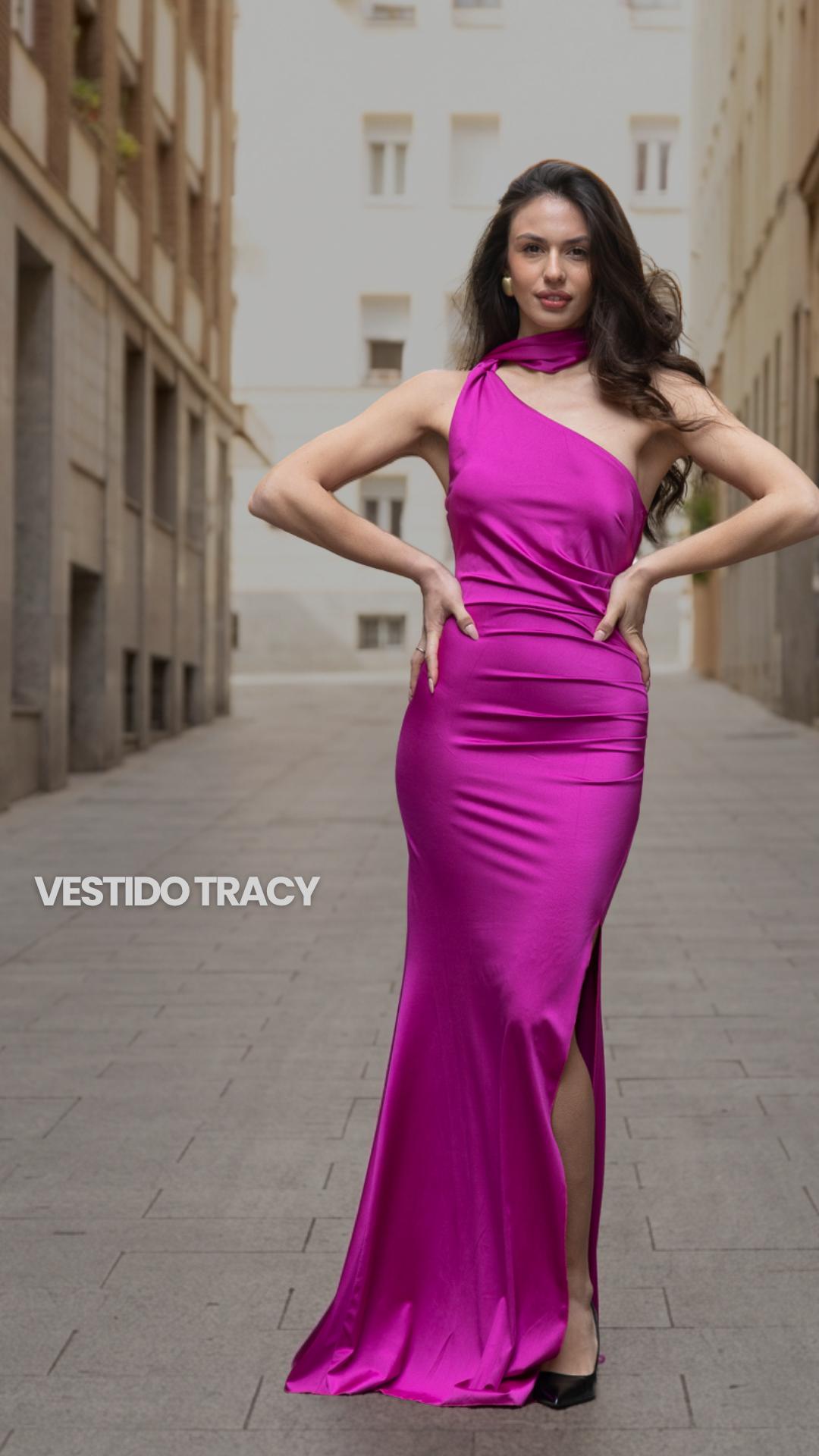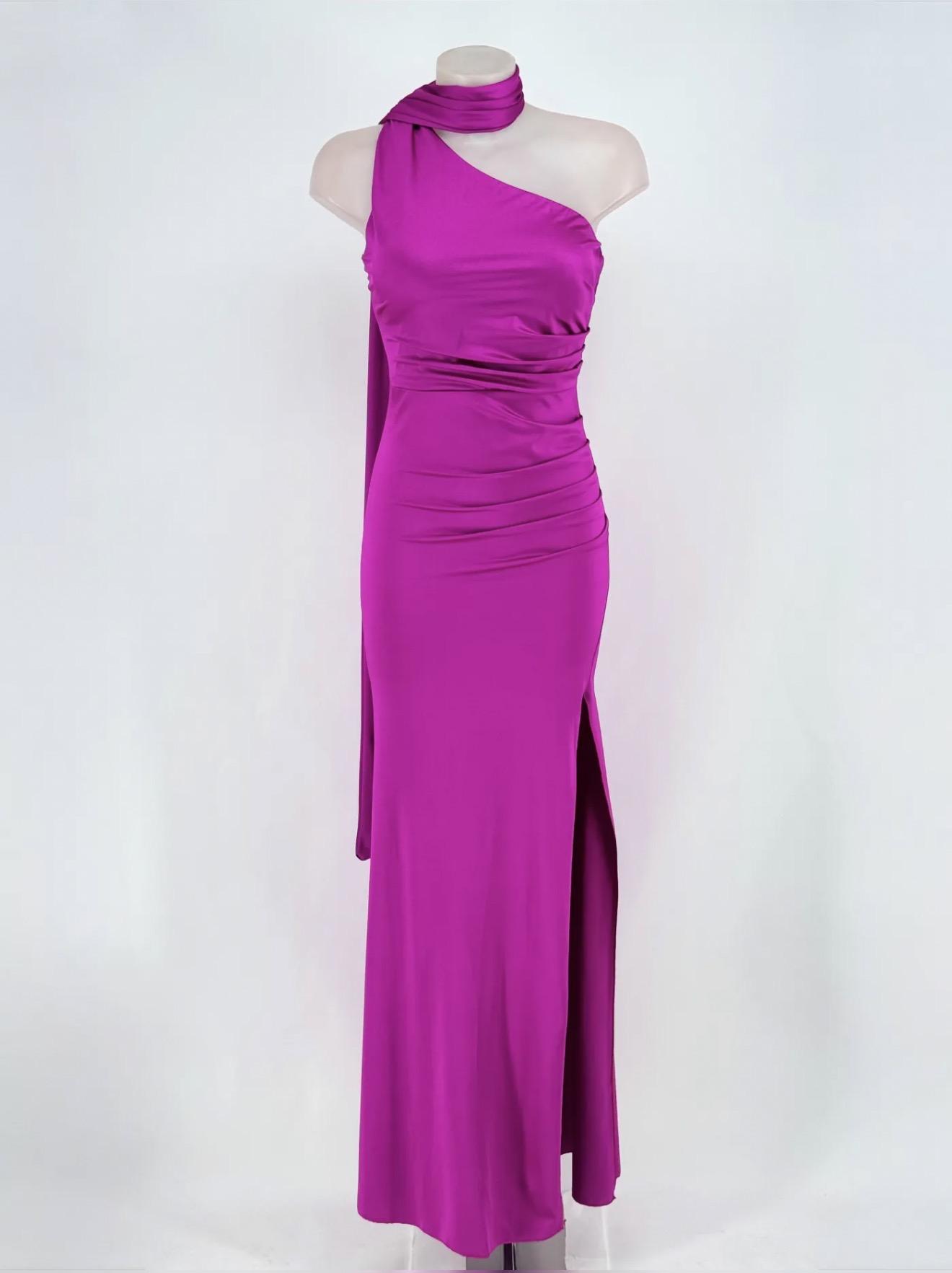 Vestido largo satinado con fruncido en la parte de los glúteos. Espalda libre y elegante escote Halter del que cuelga una banda unida.