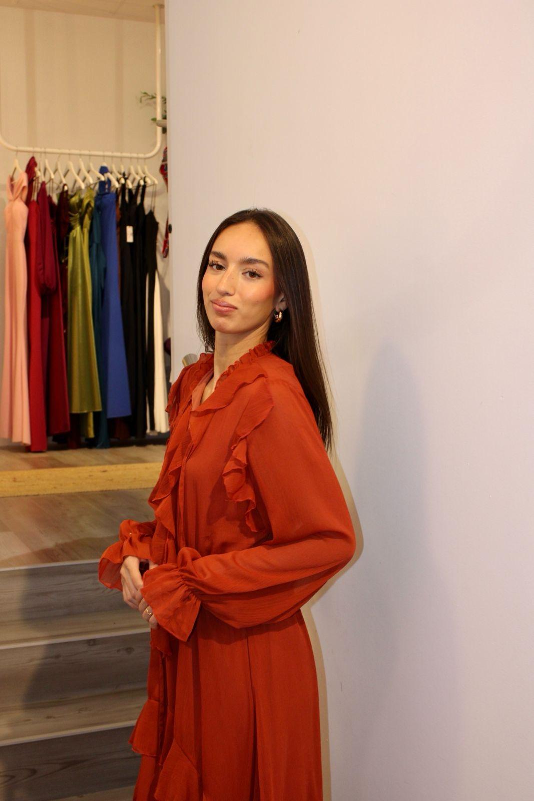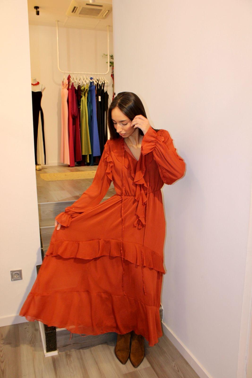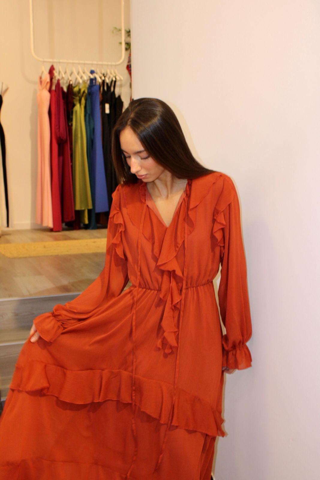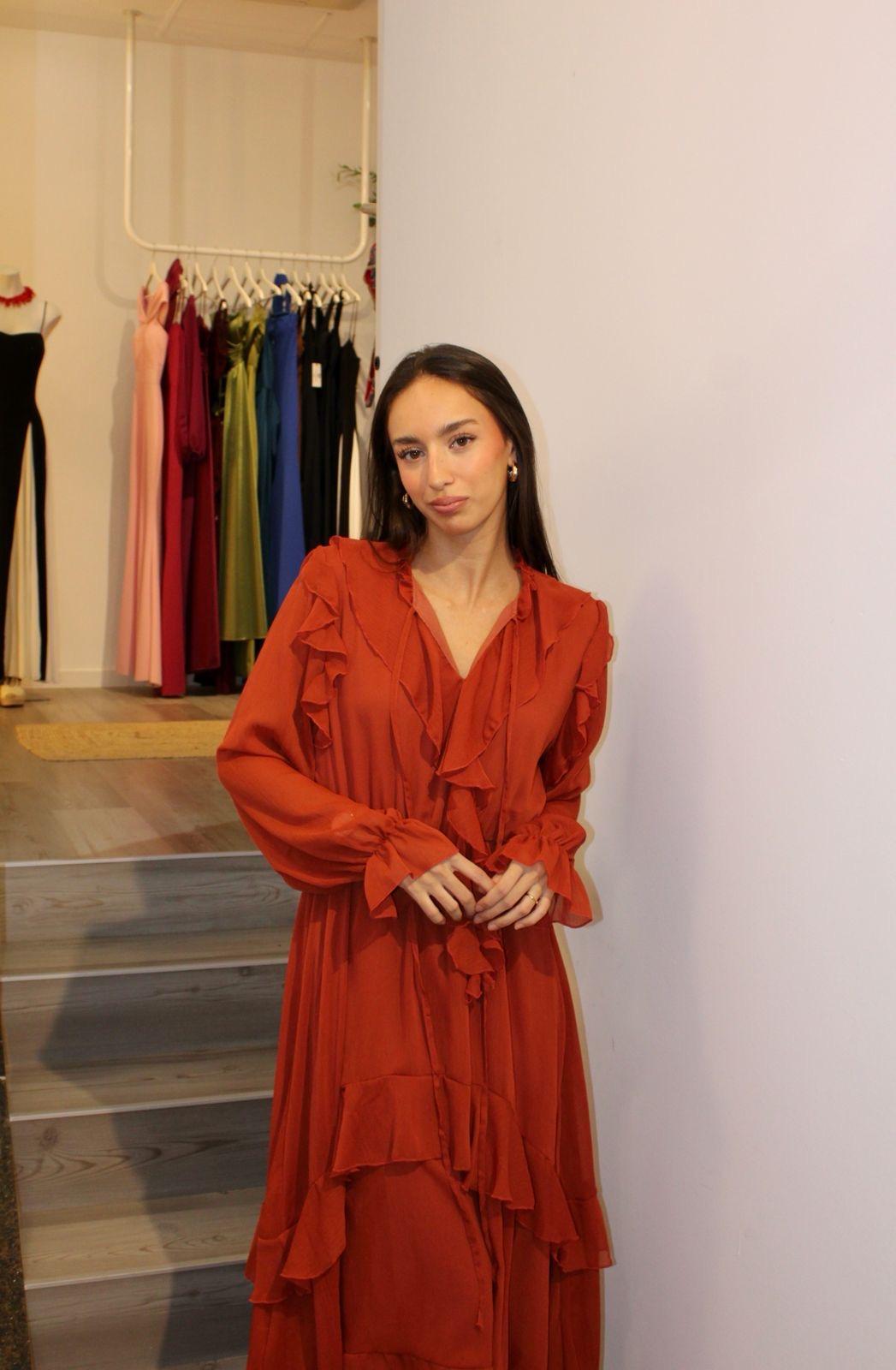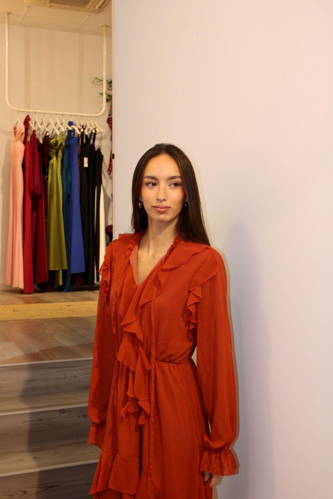 Vestido color teja de gasa, con espectaculares volantes tanto en su manga larga como a lo largo del vestido.