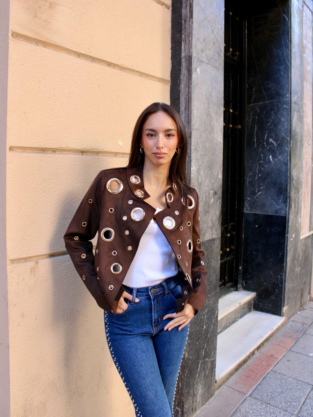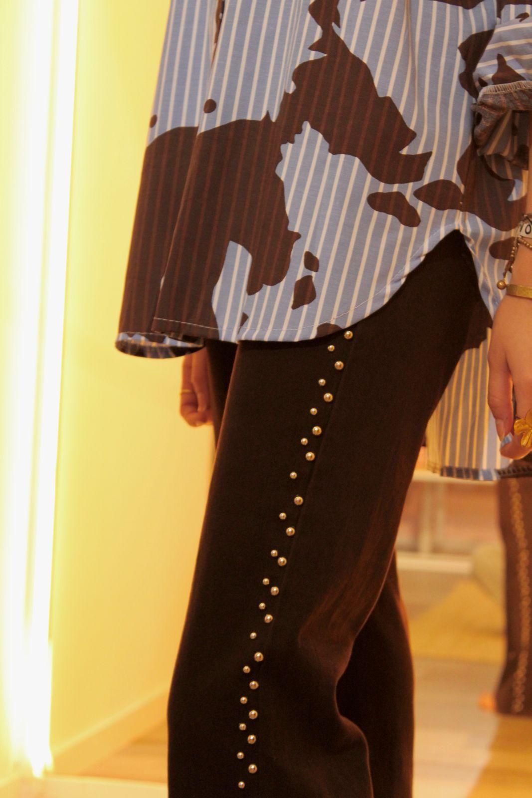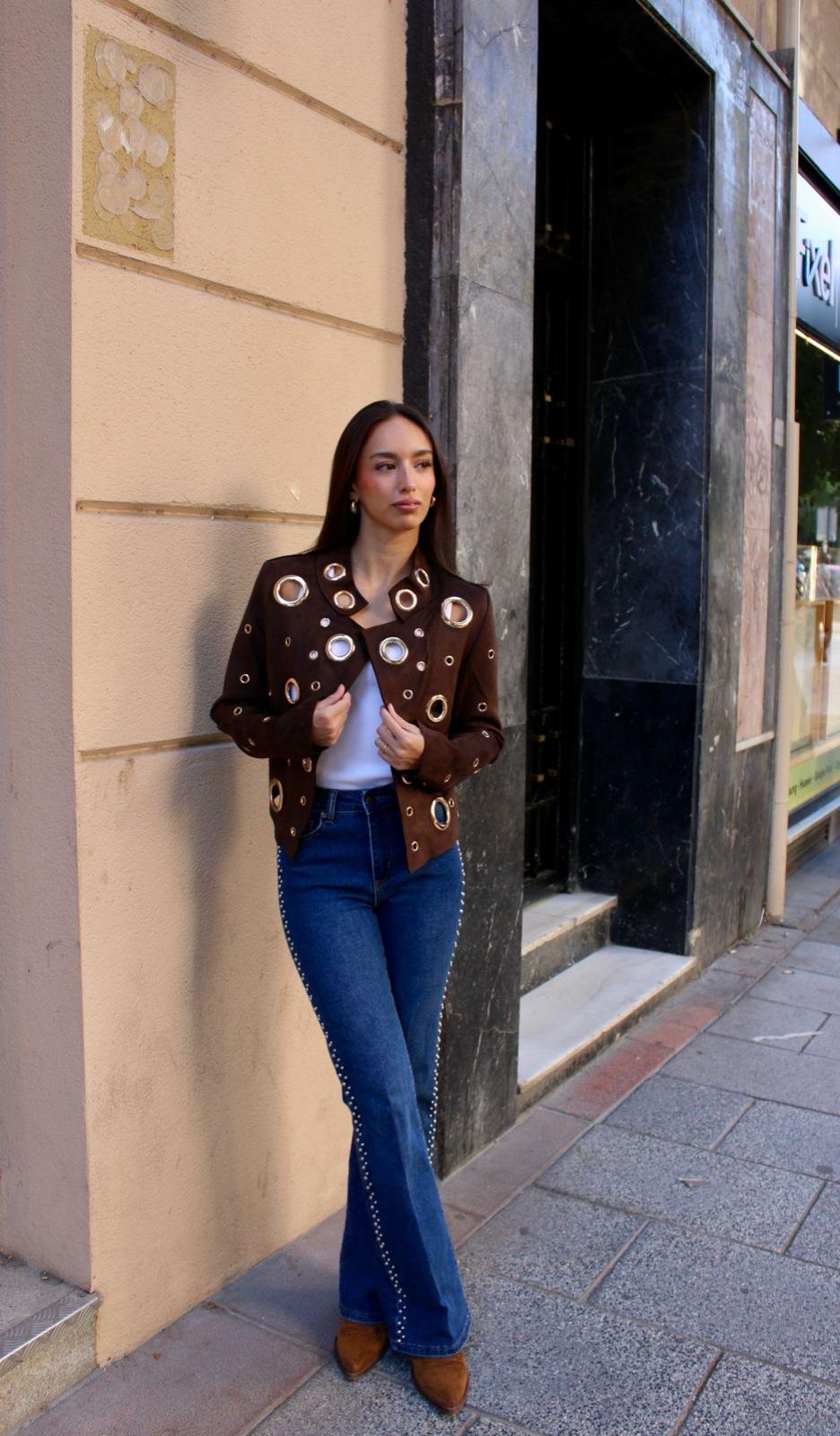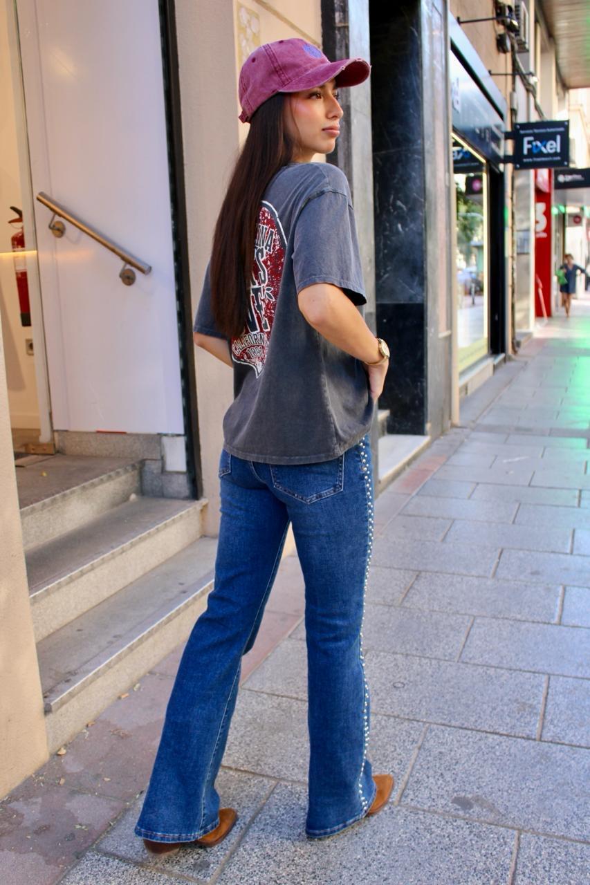 Denim recto con efecto campana y tachuelas.