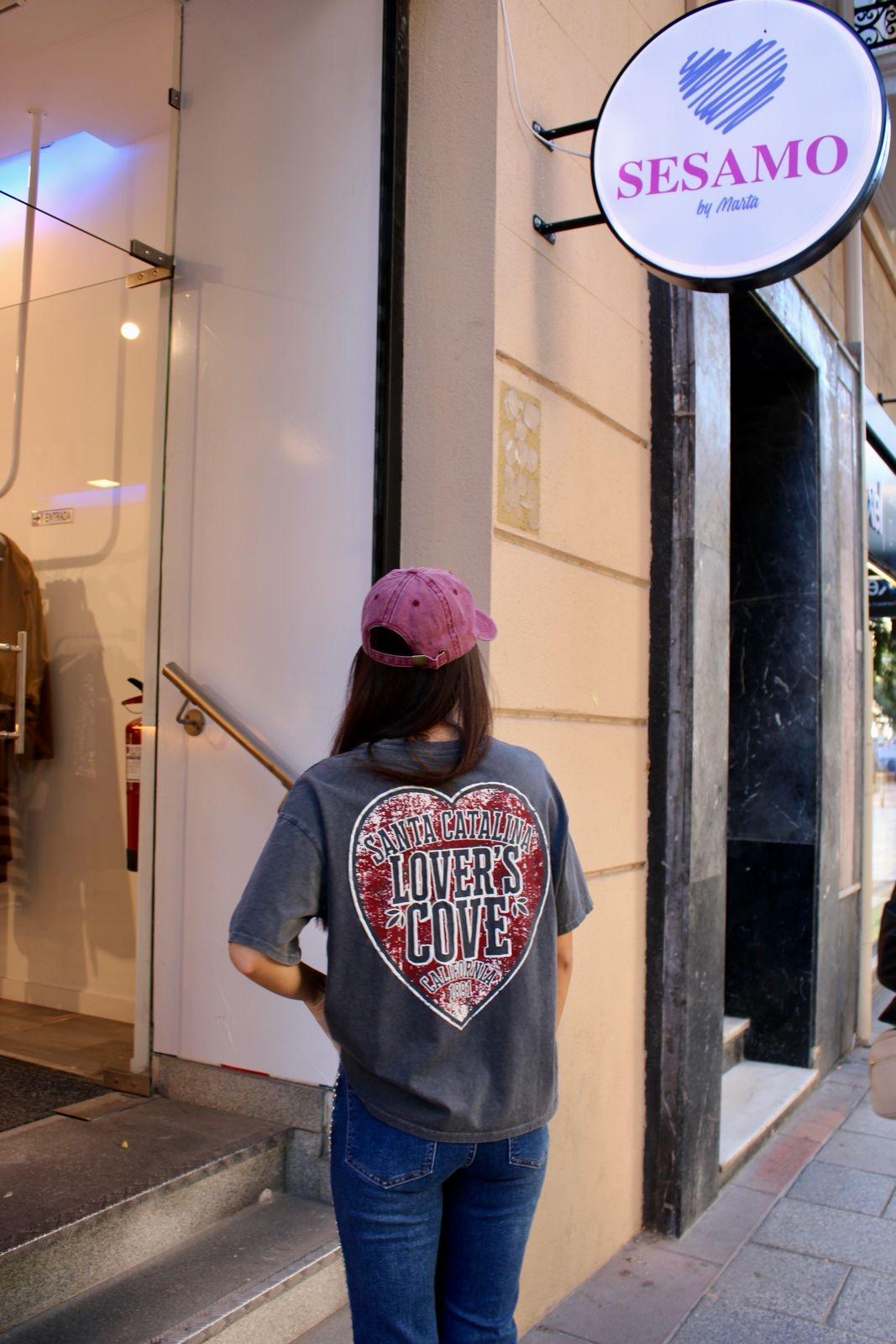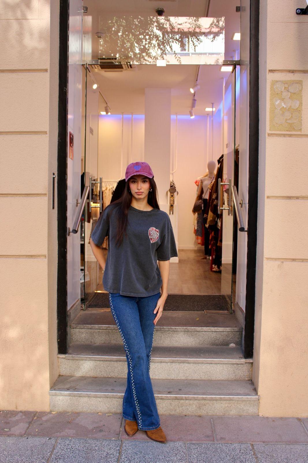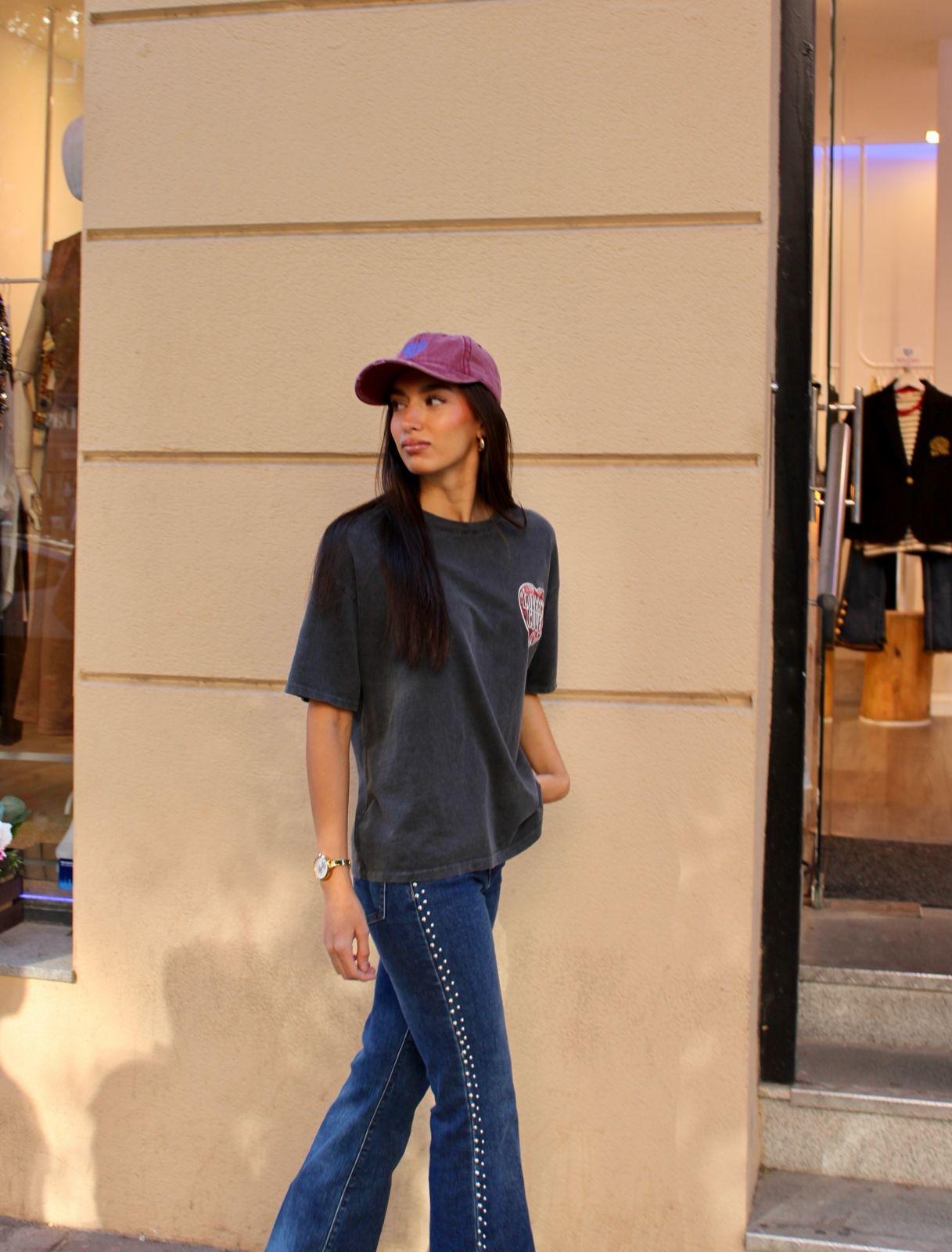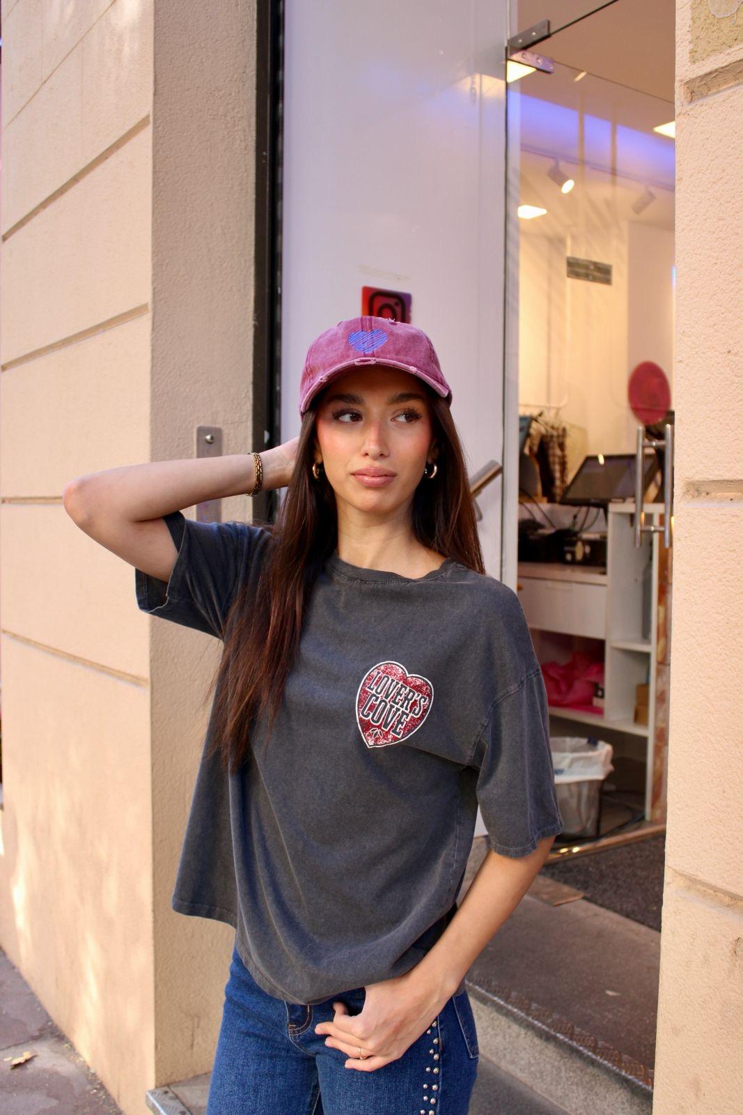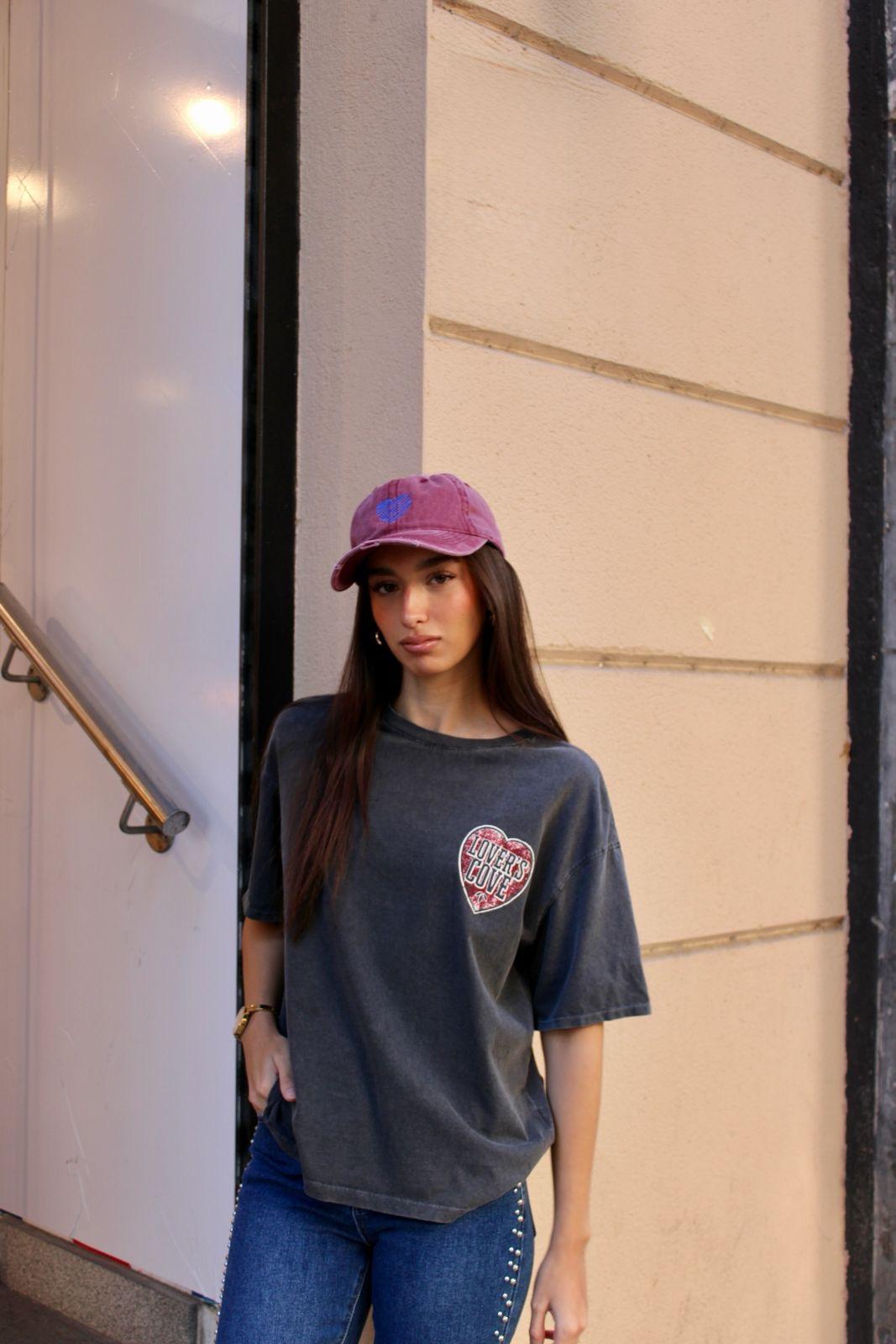 Camiseta lover de manga corta y color negra desgastada con dibujo en la espalda de corazon.