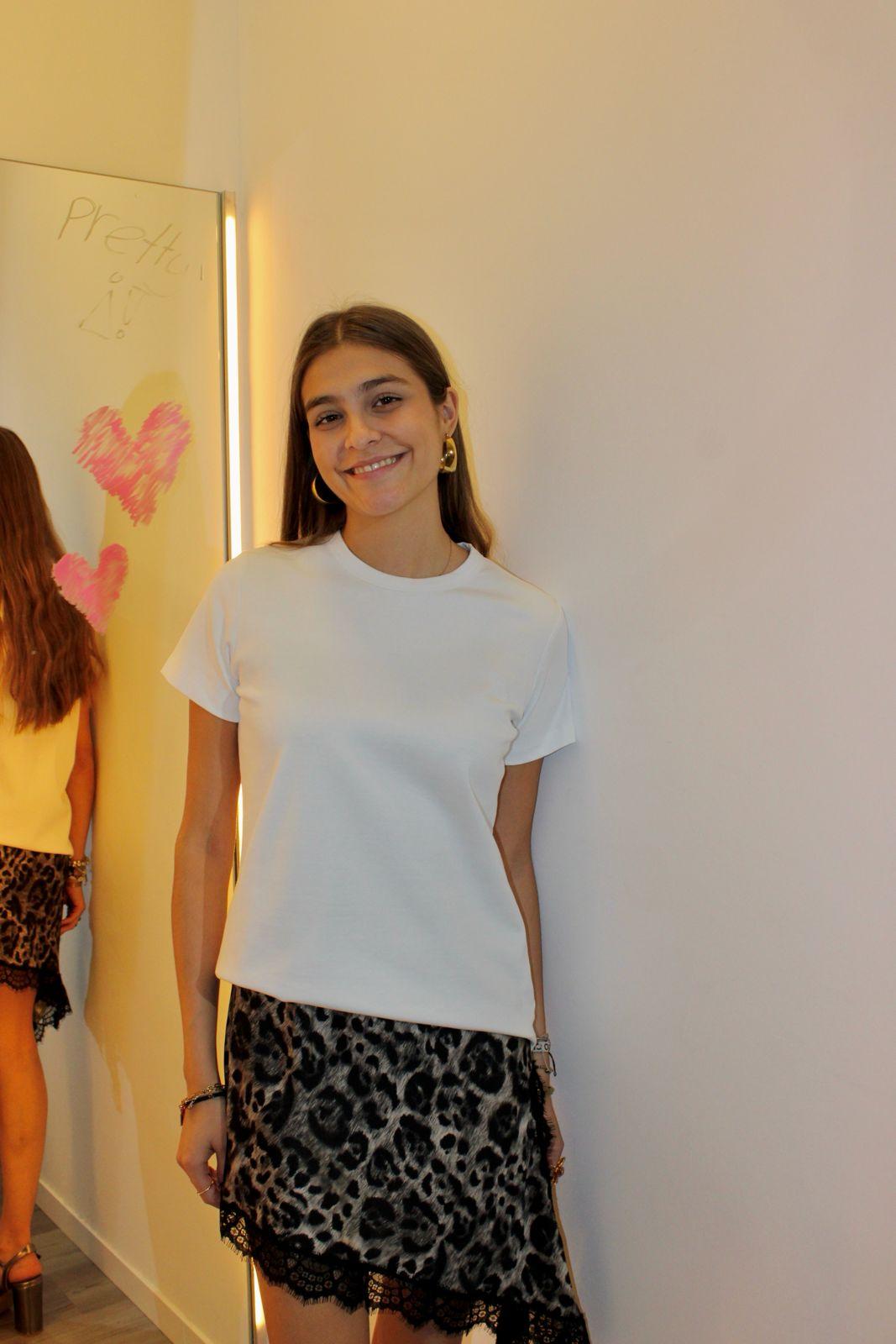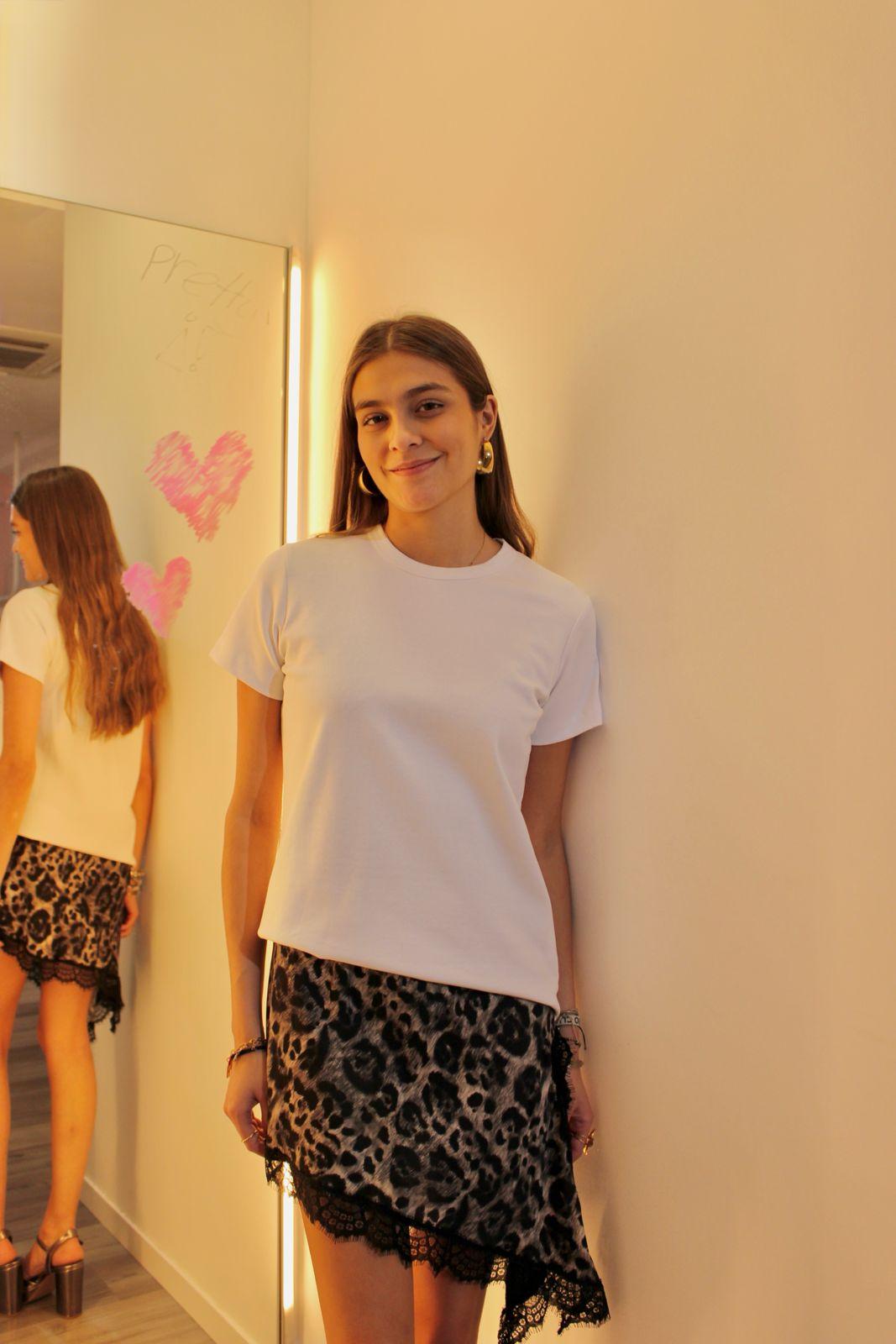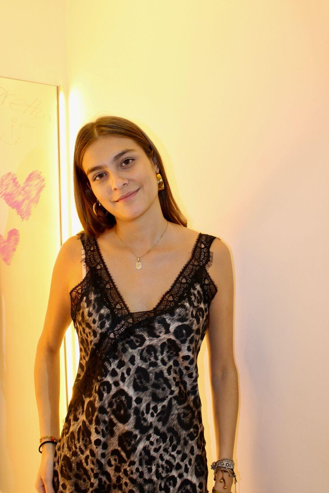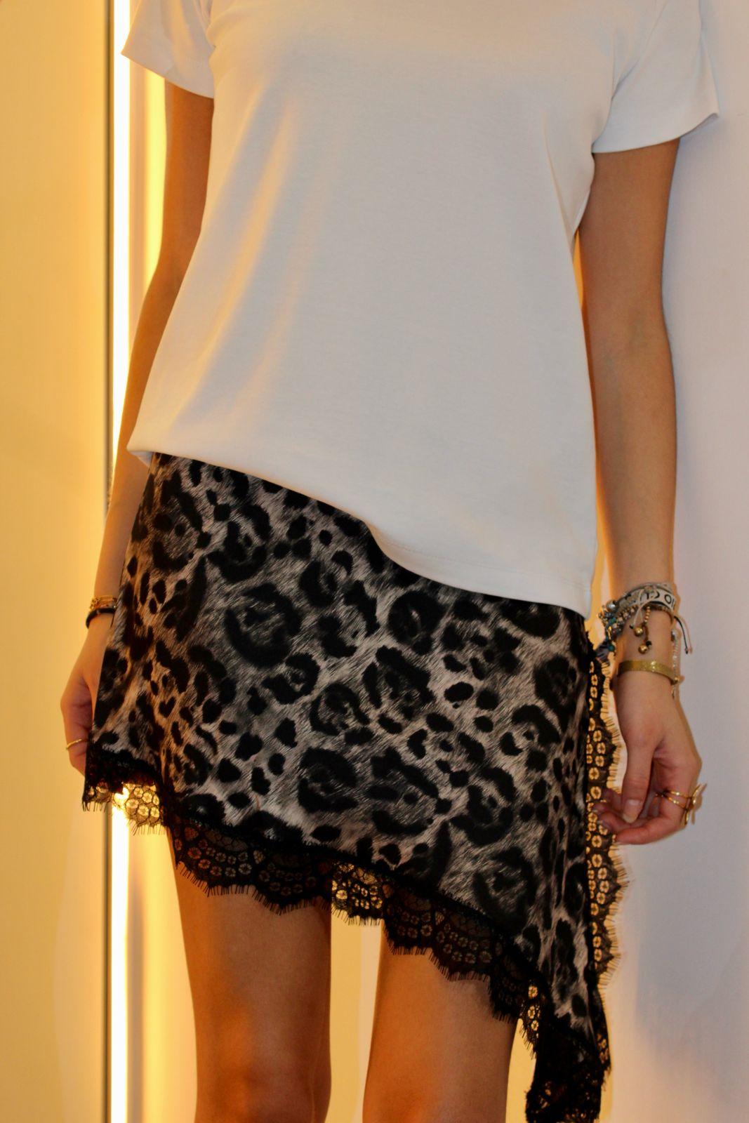 Vestido corto asimétrico lencero, con estampado de leopardo combunad de encaje en negro.