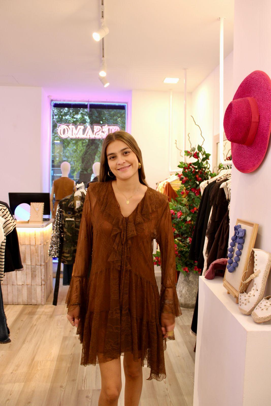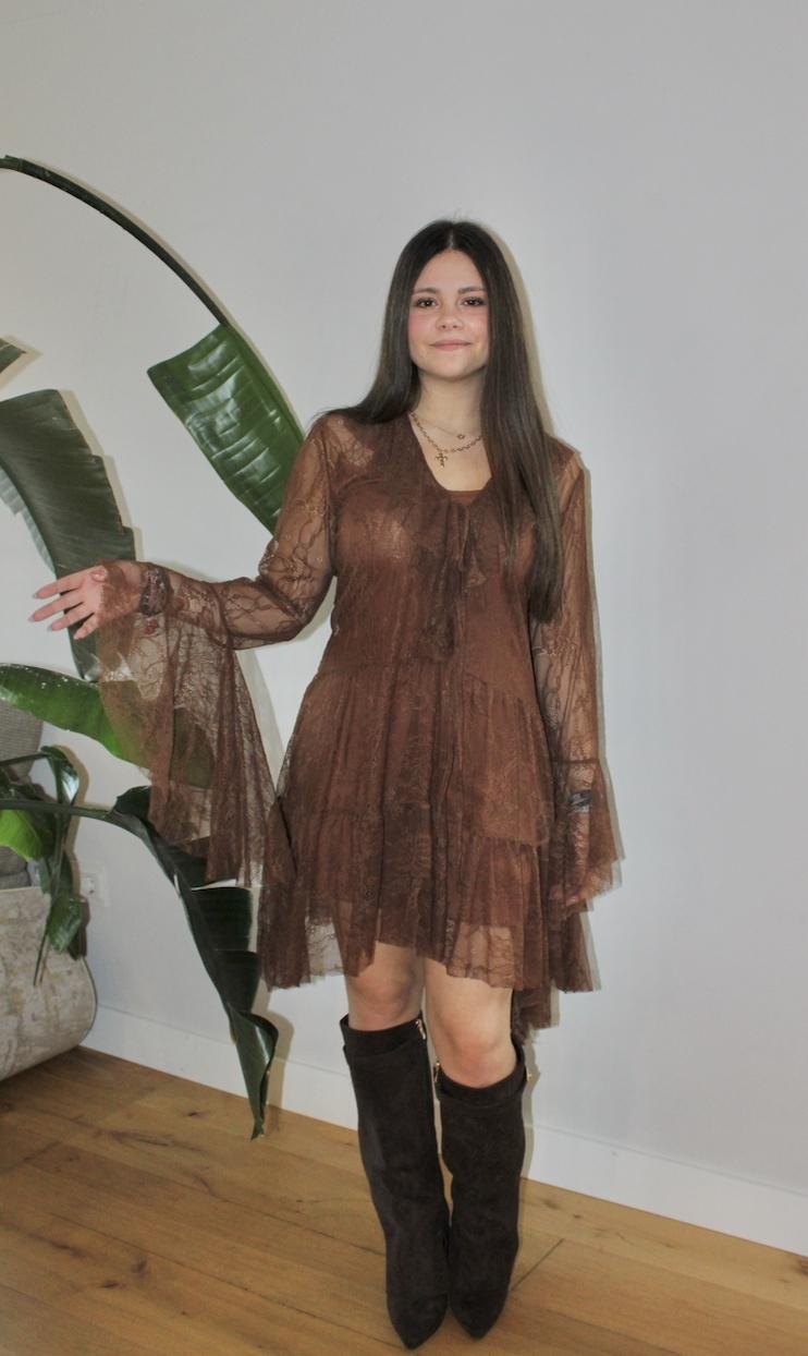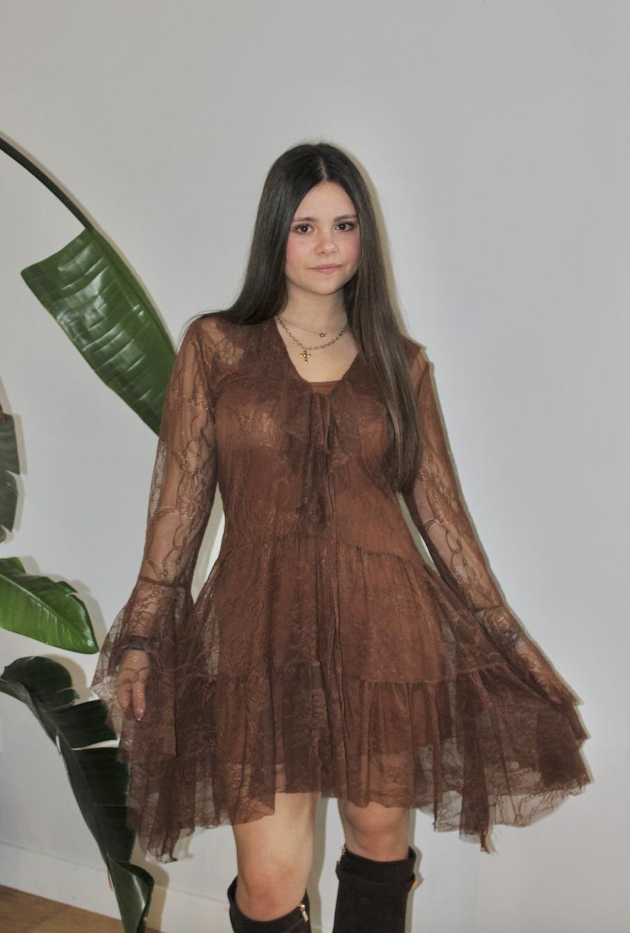 Vestido corto de encaje en color café, manguita larga que termina en volante, escote en V con volante y pequeño lazo para anudar. Lleva forro.