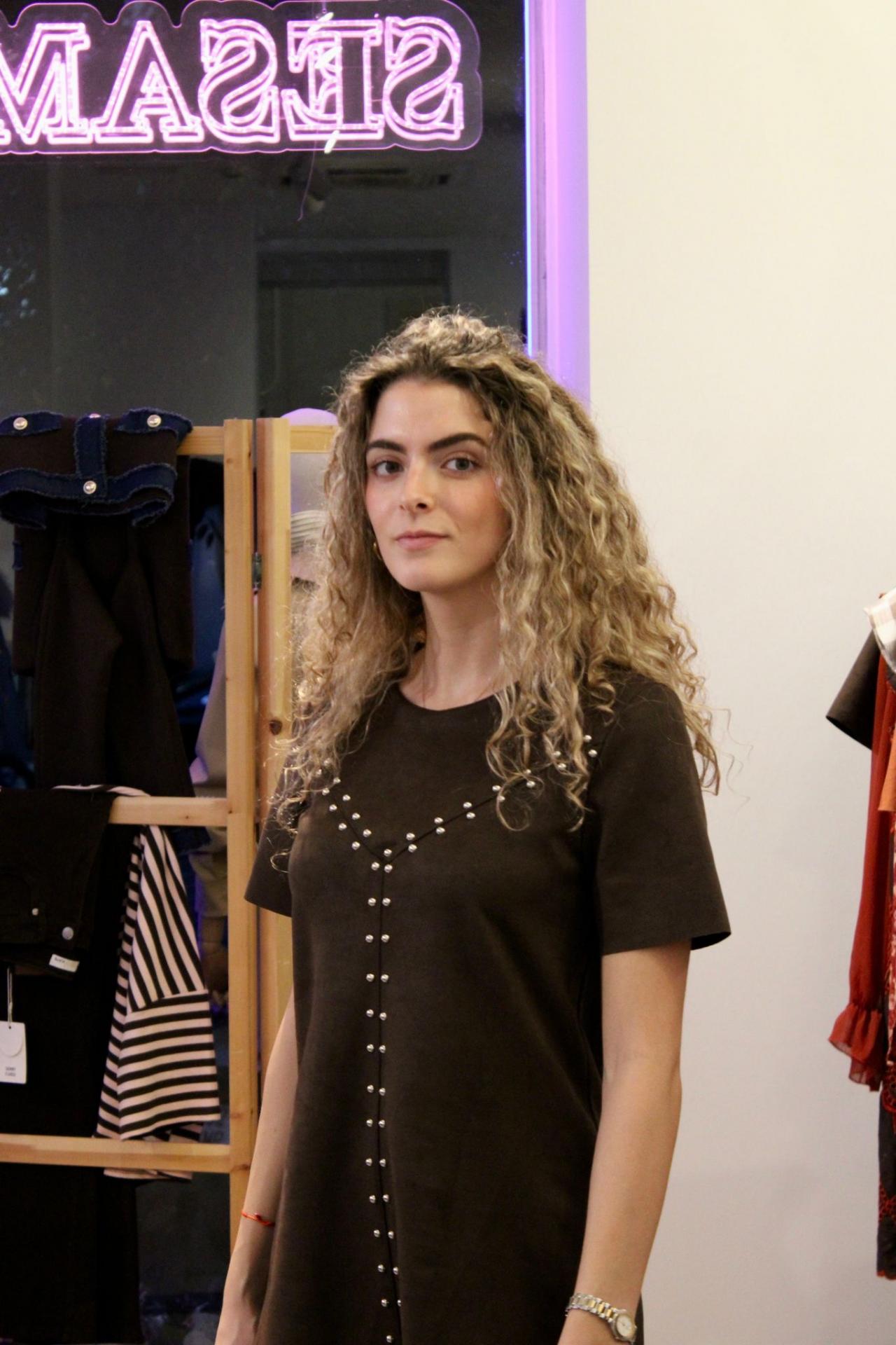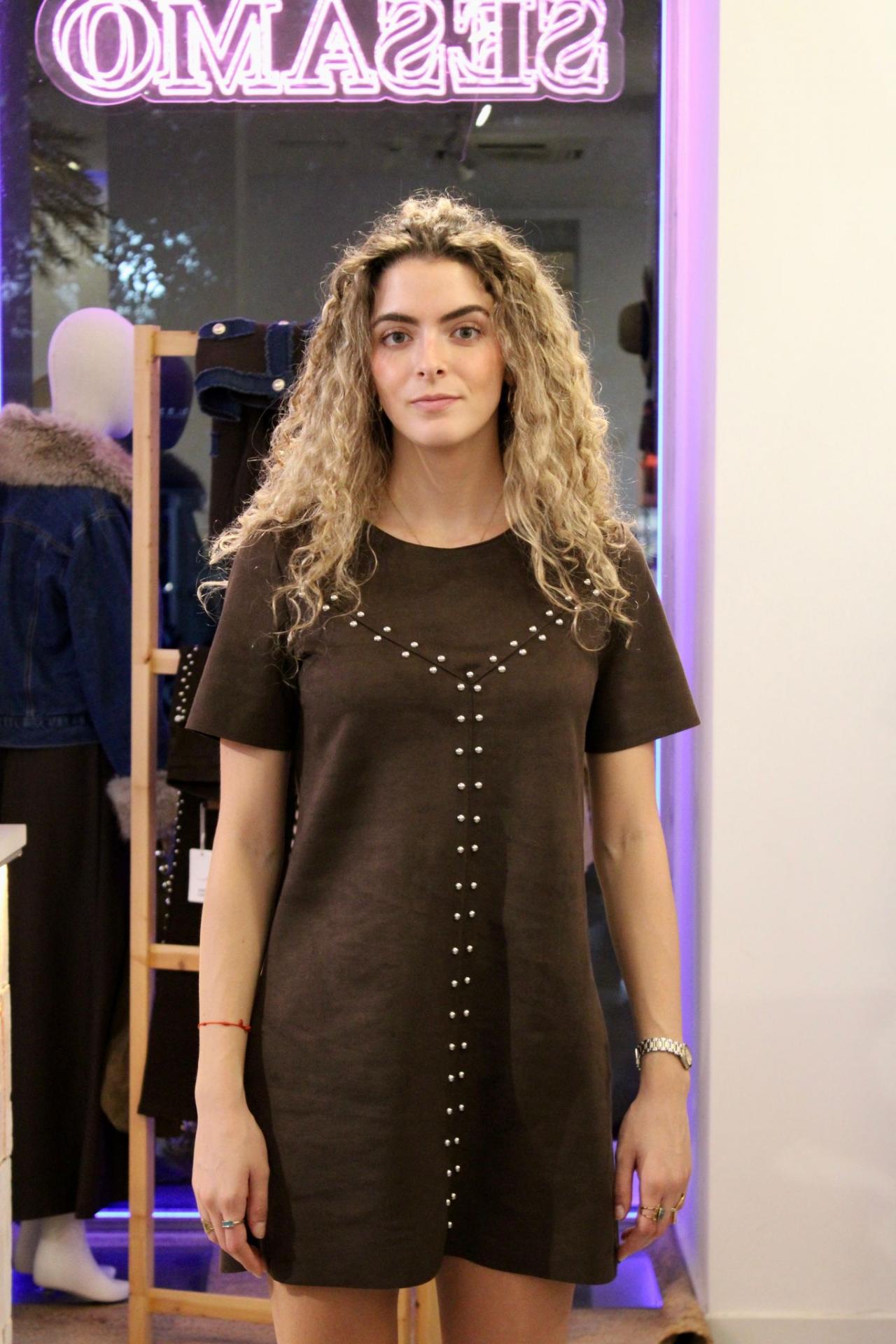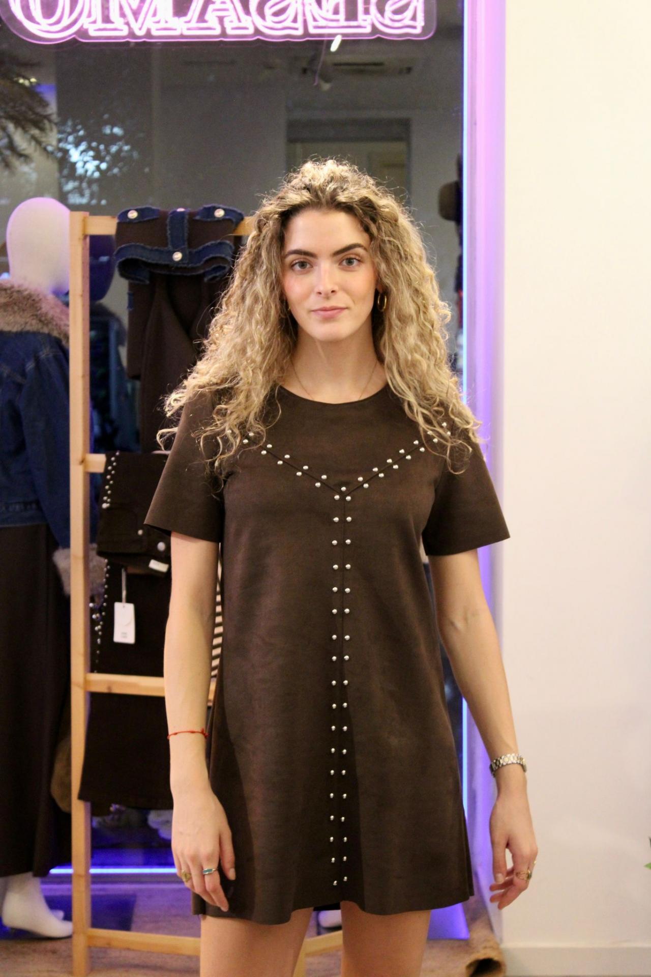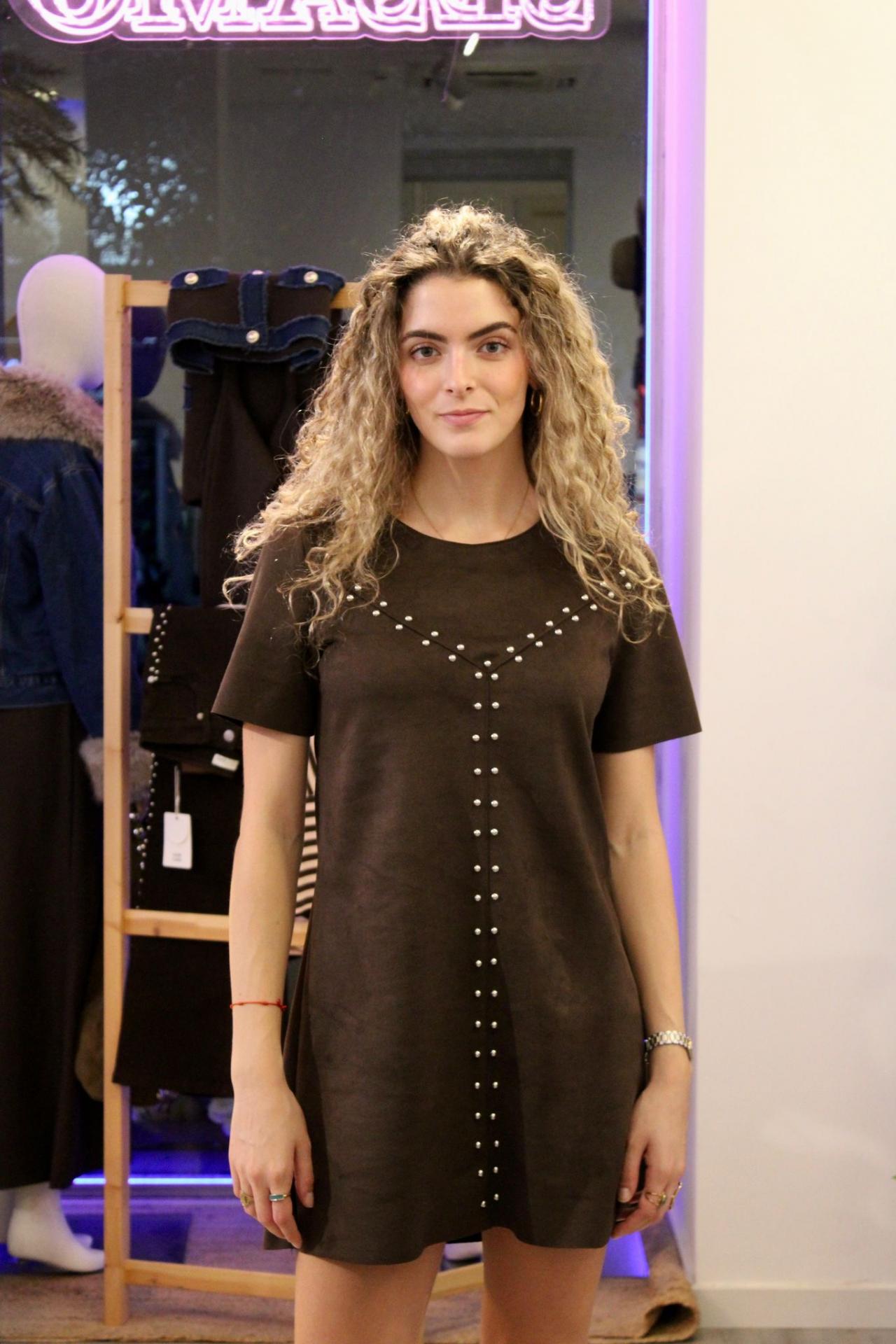 Espectacular vestido de ante corto y en manga corta. Con tachuelas color plata desde el pecho hasta el bajo.