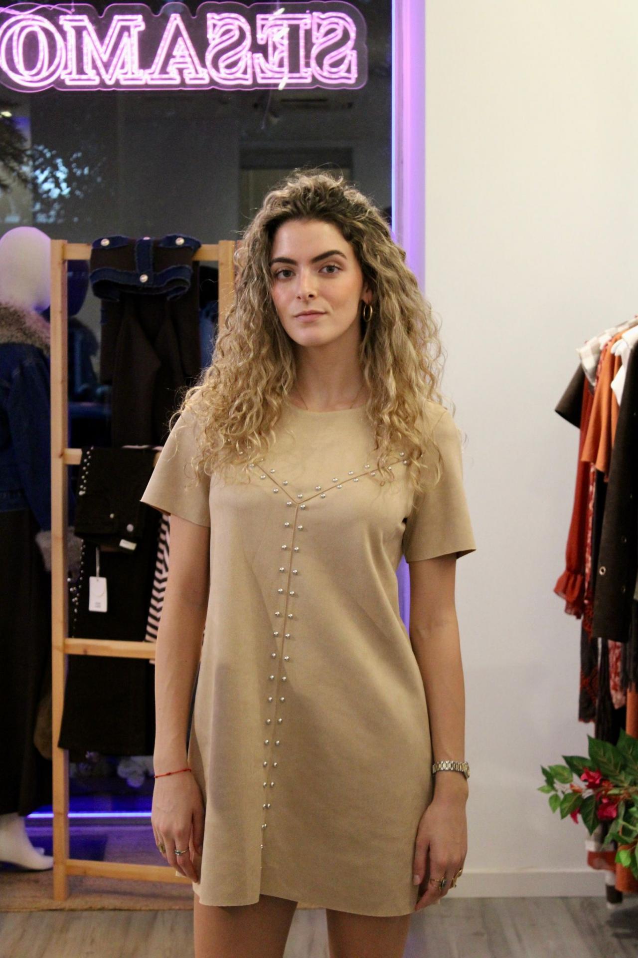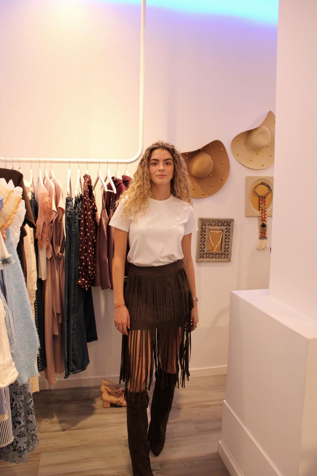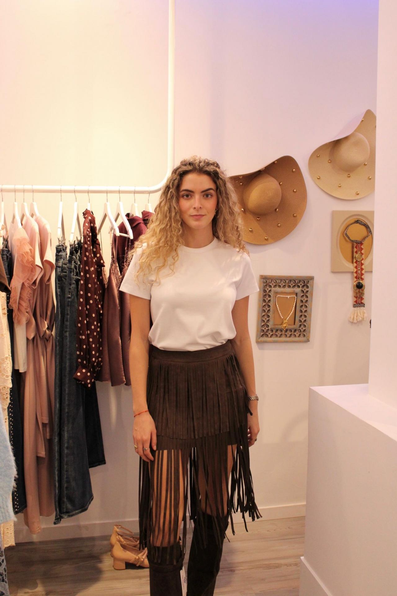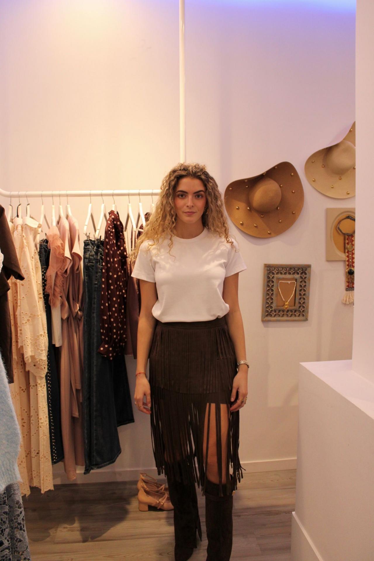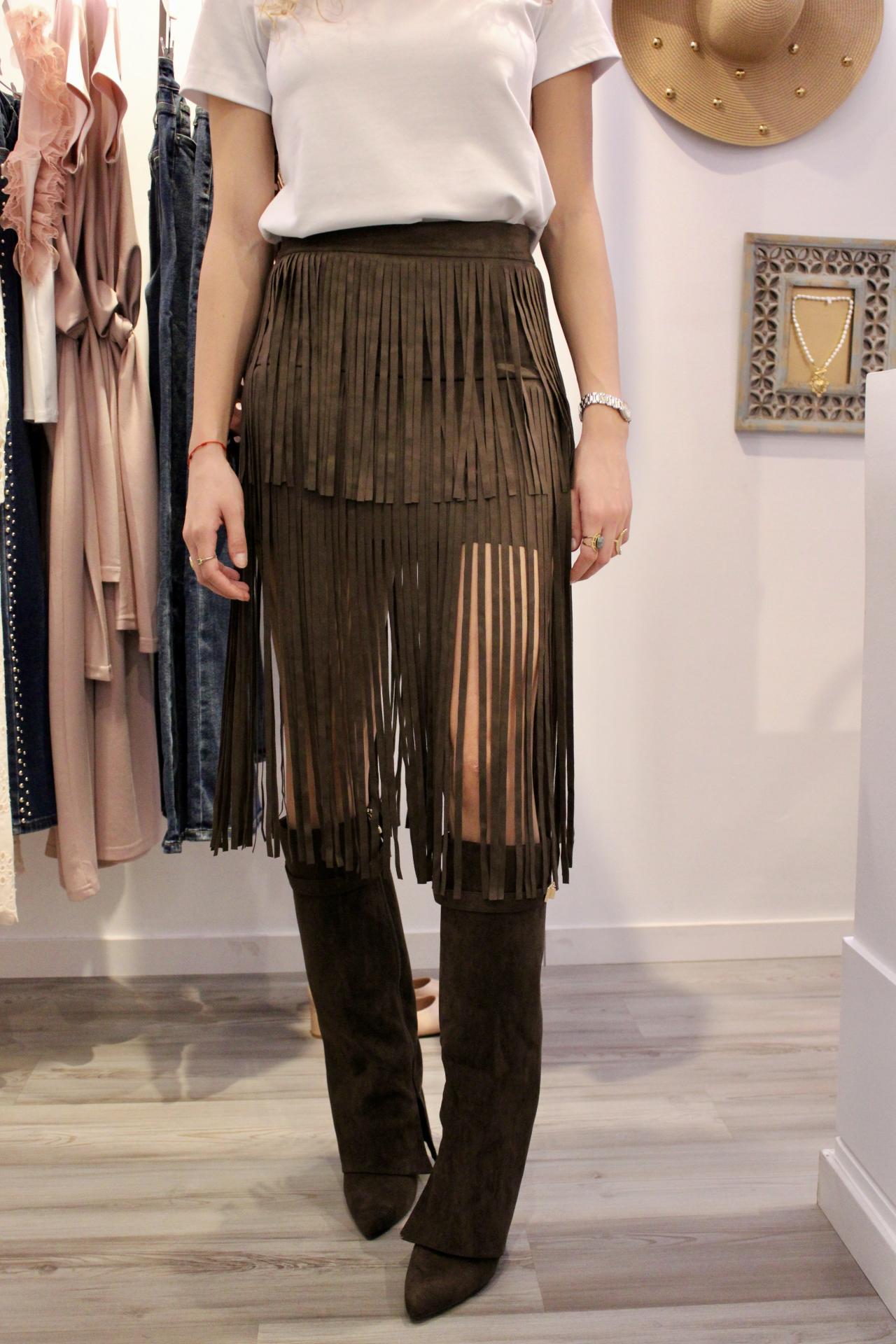 Espectacular falda corta de ante, en color chocolate. Con flecos largos.