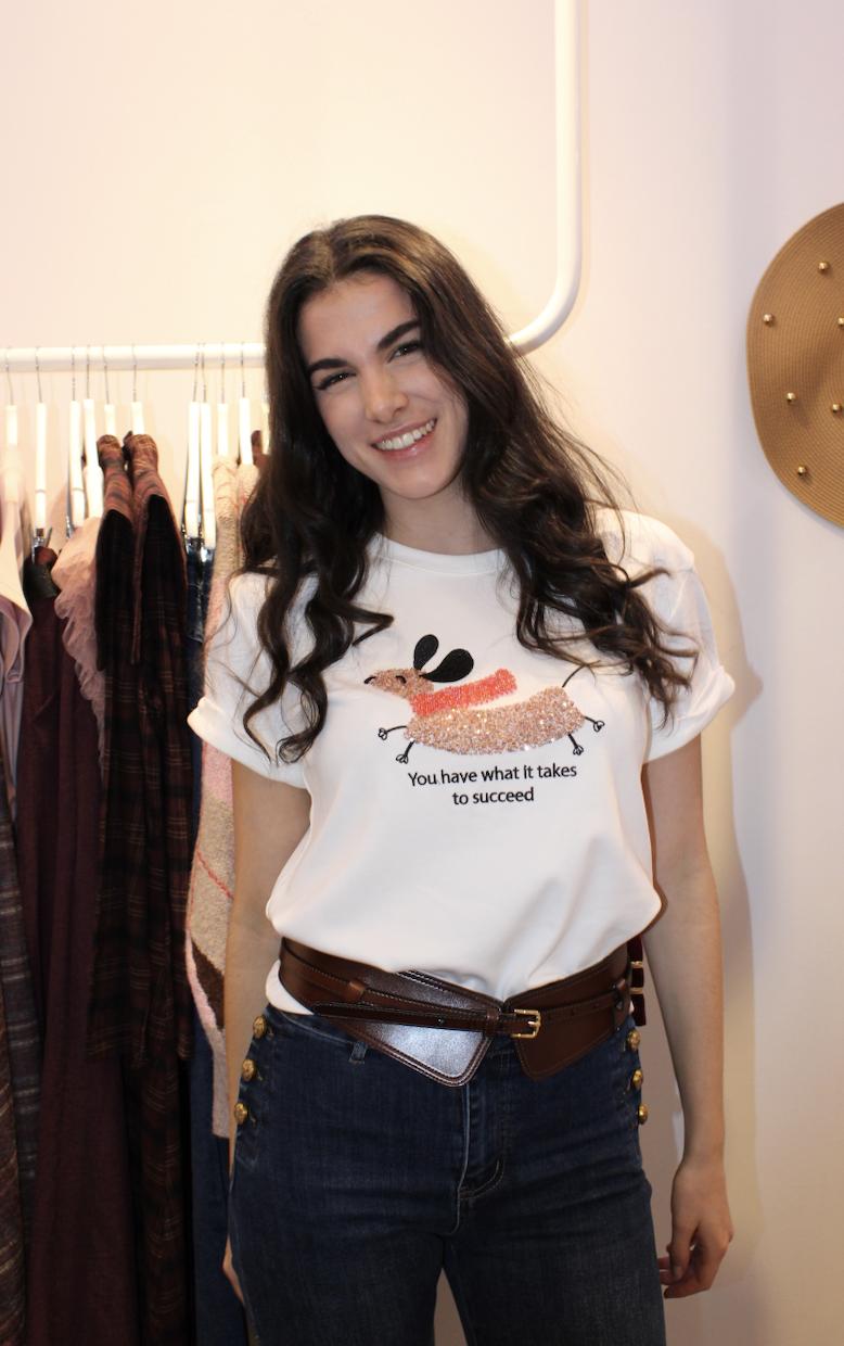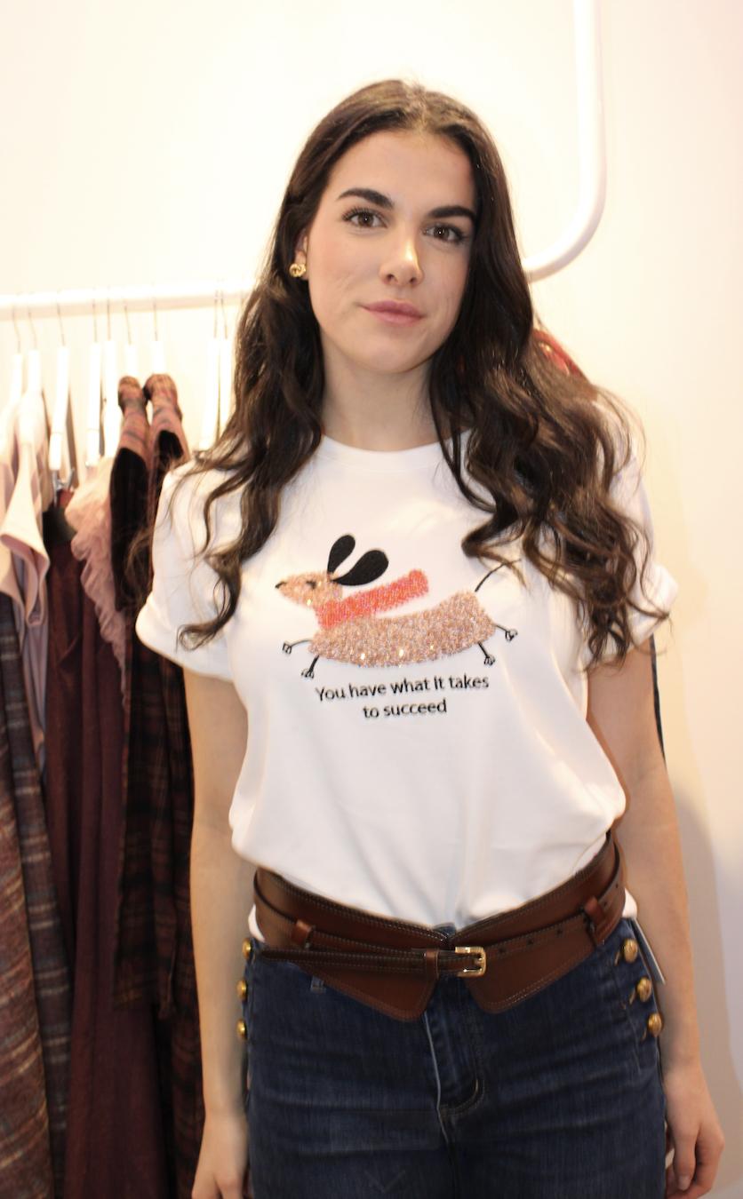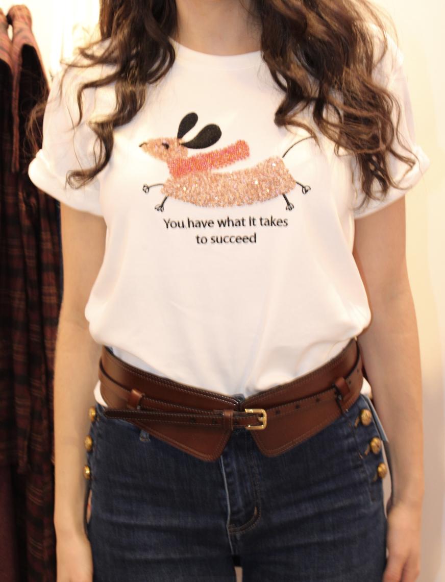 Camiseta de color blanco, con dibujo de un teckel y lentejuelas.