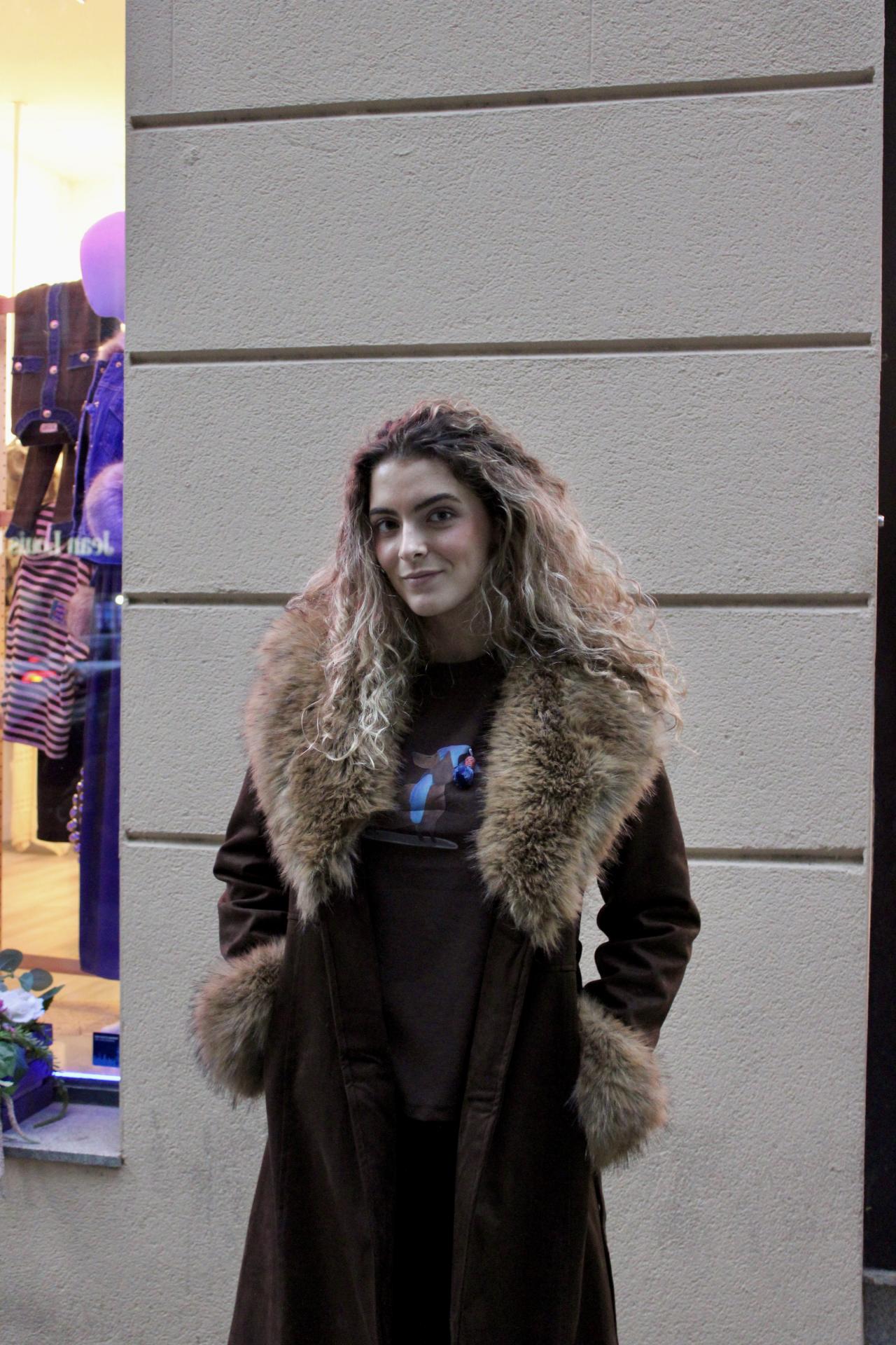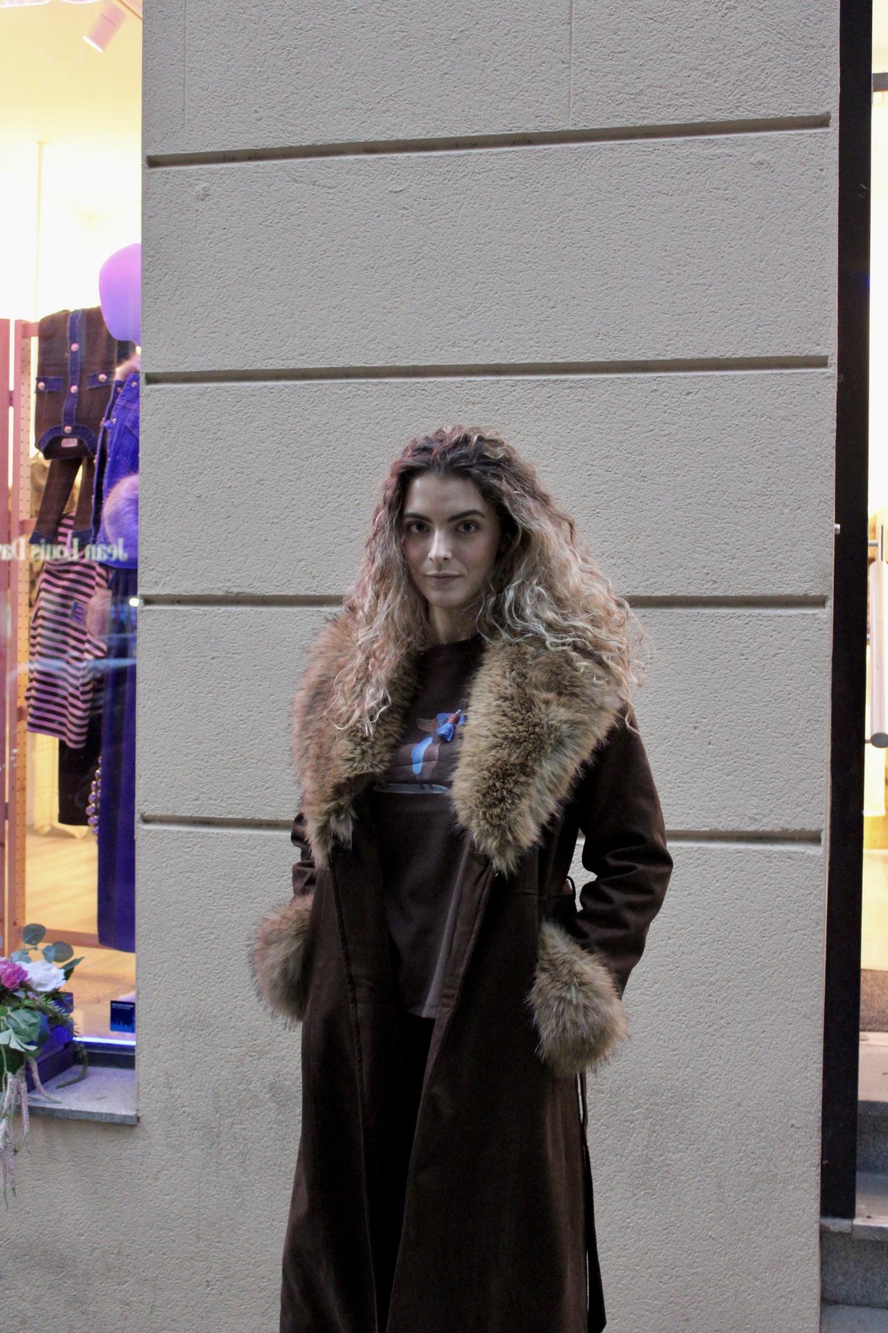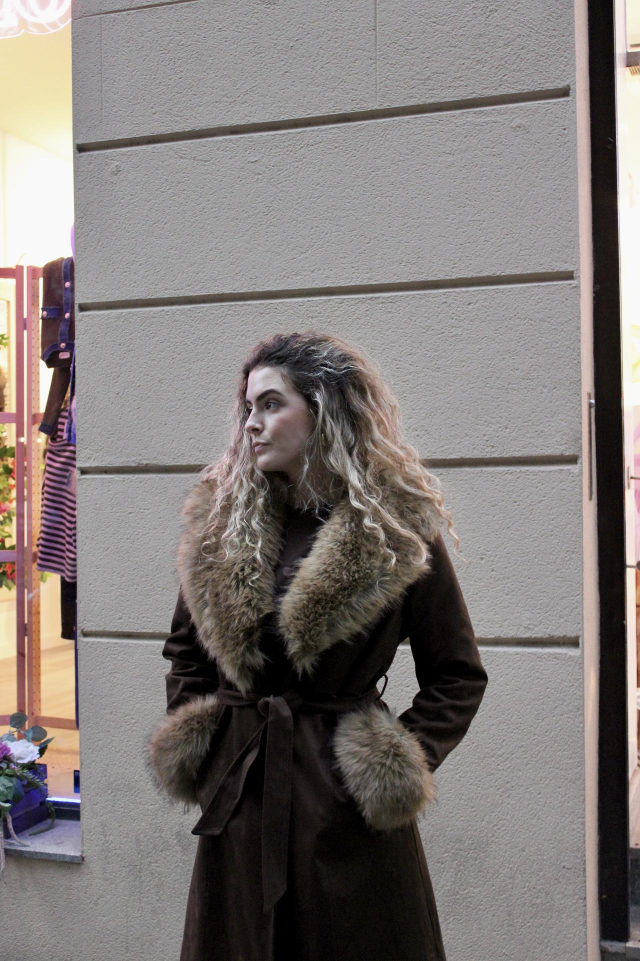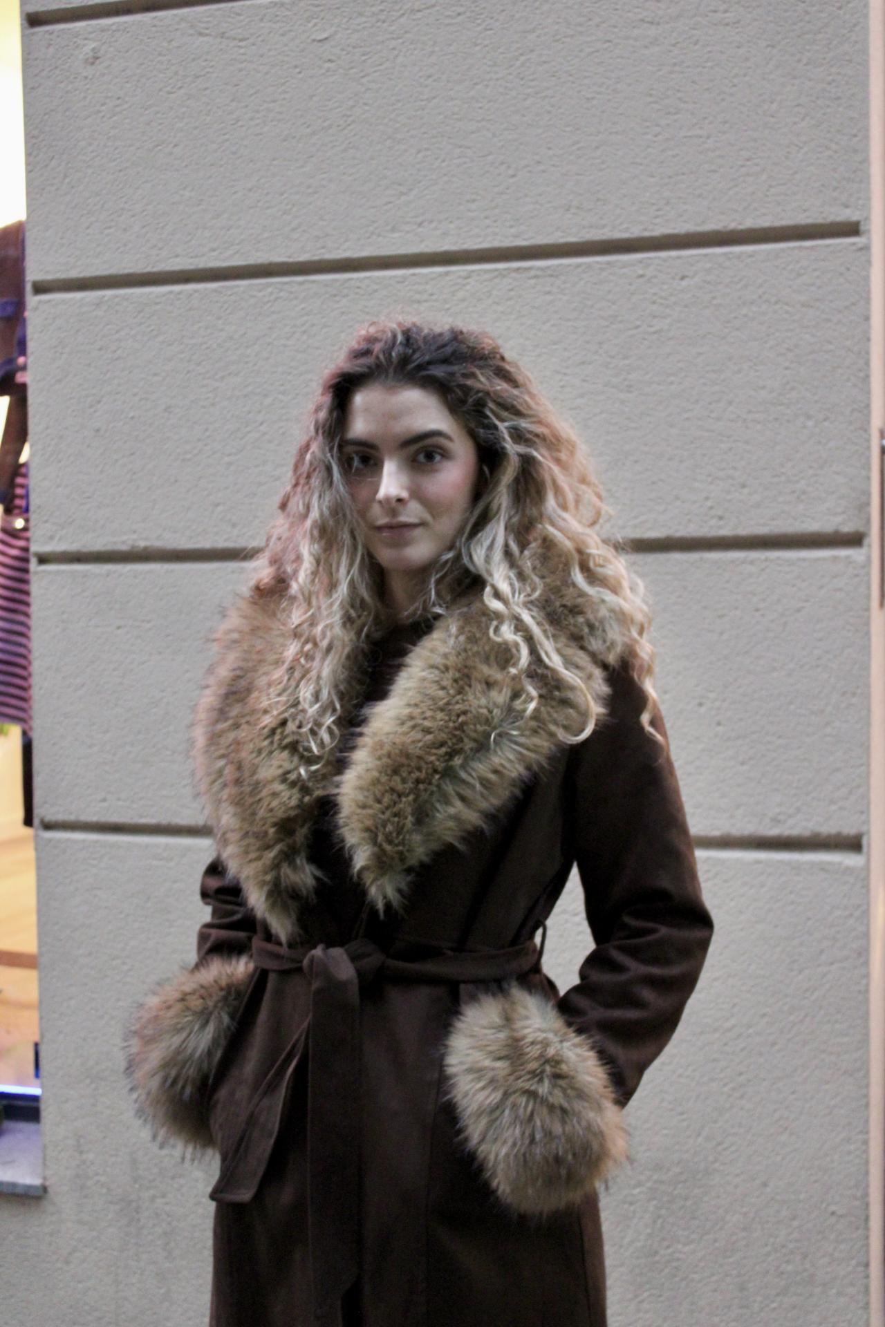 Espectacular abrigo de ante, largo en color chocolate .Con pelo tanto en las mangas como en el cuello y cinturon a juego.
