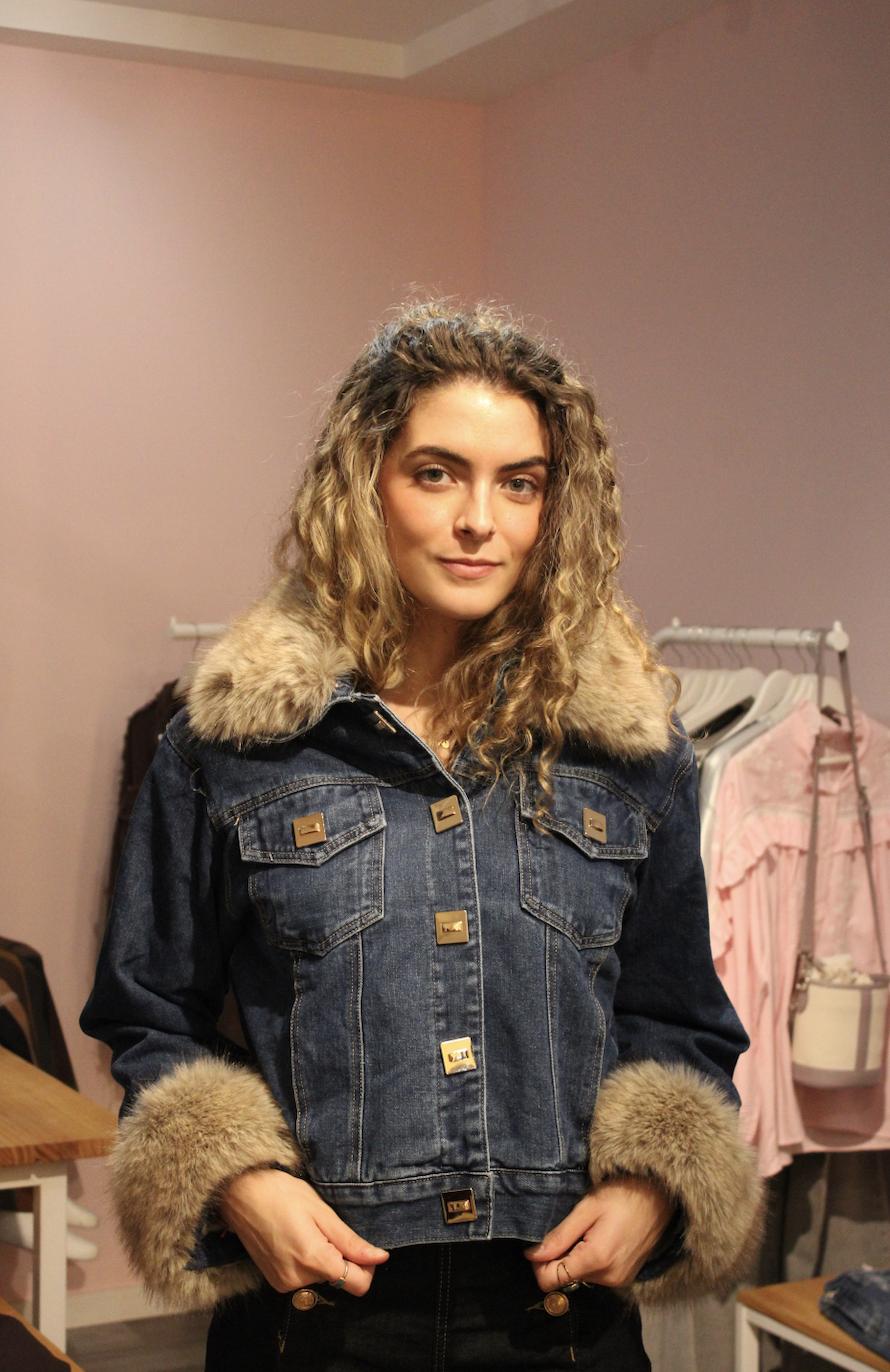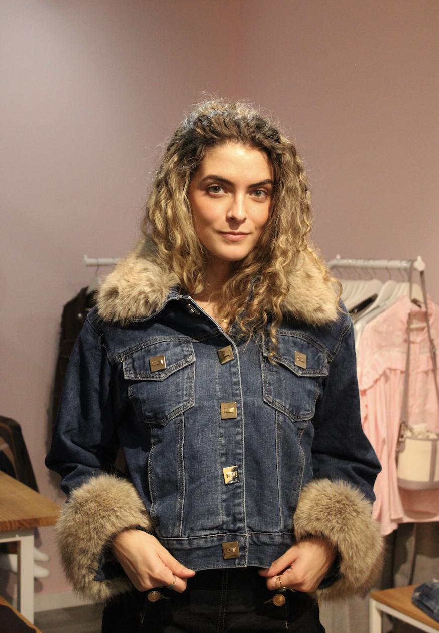 Chaqueta denim con pelo tanto en hombros como en las mangas.Botones dorados a juego.
