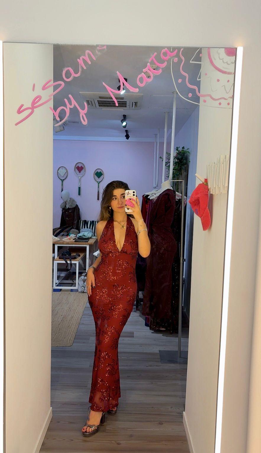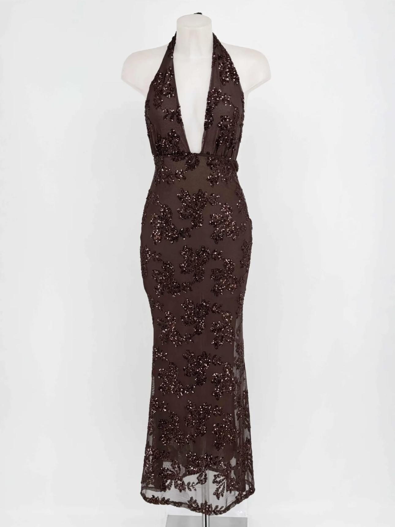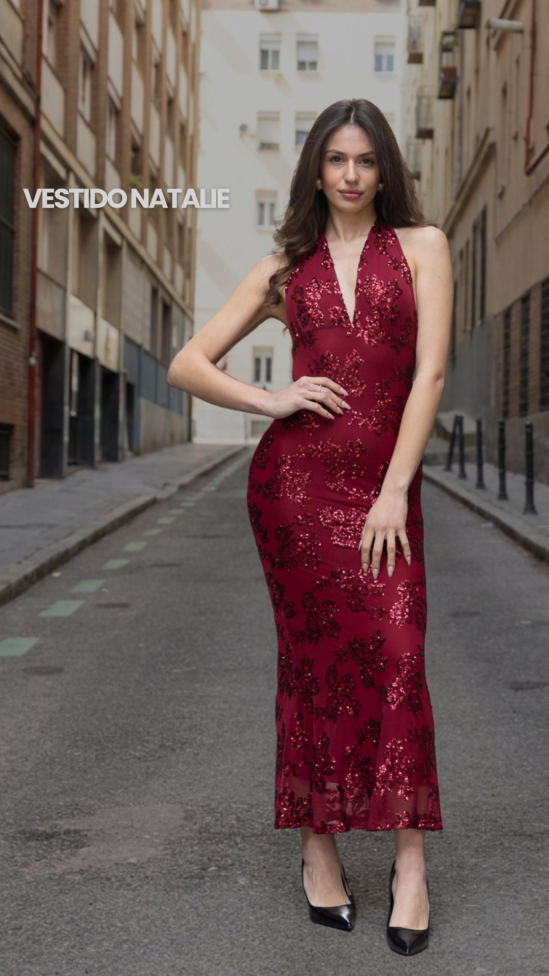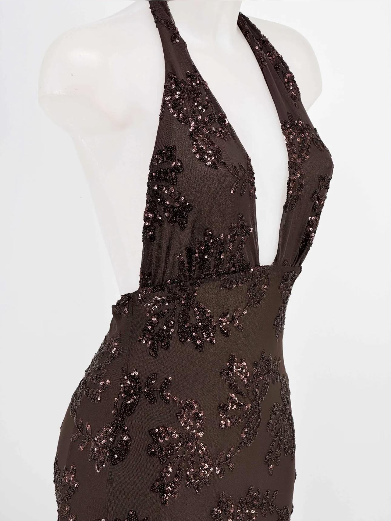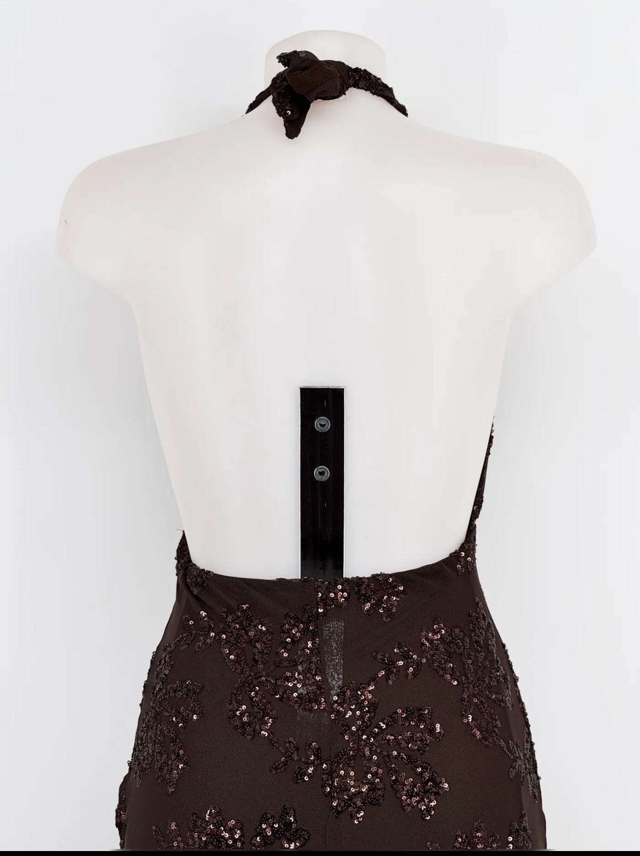 Espectacular vestido de fiesta largo con pedreria y anudado a la espalda.
