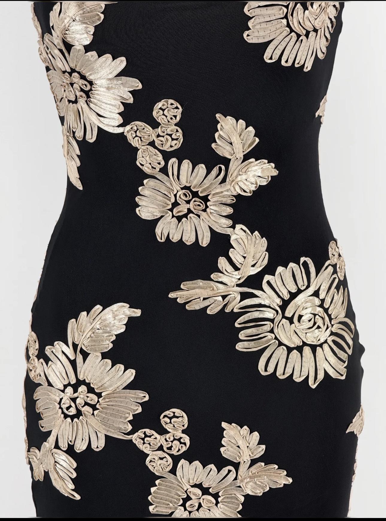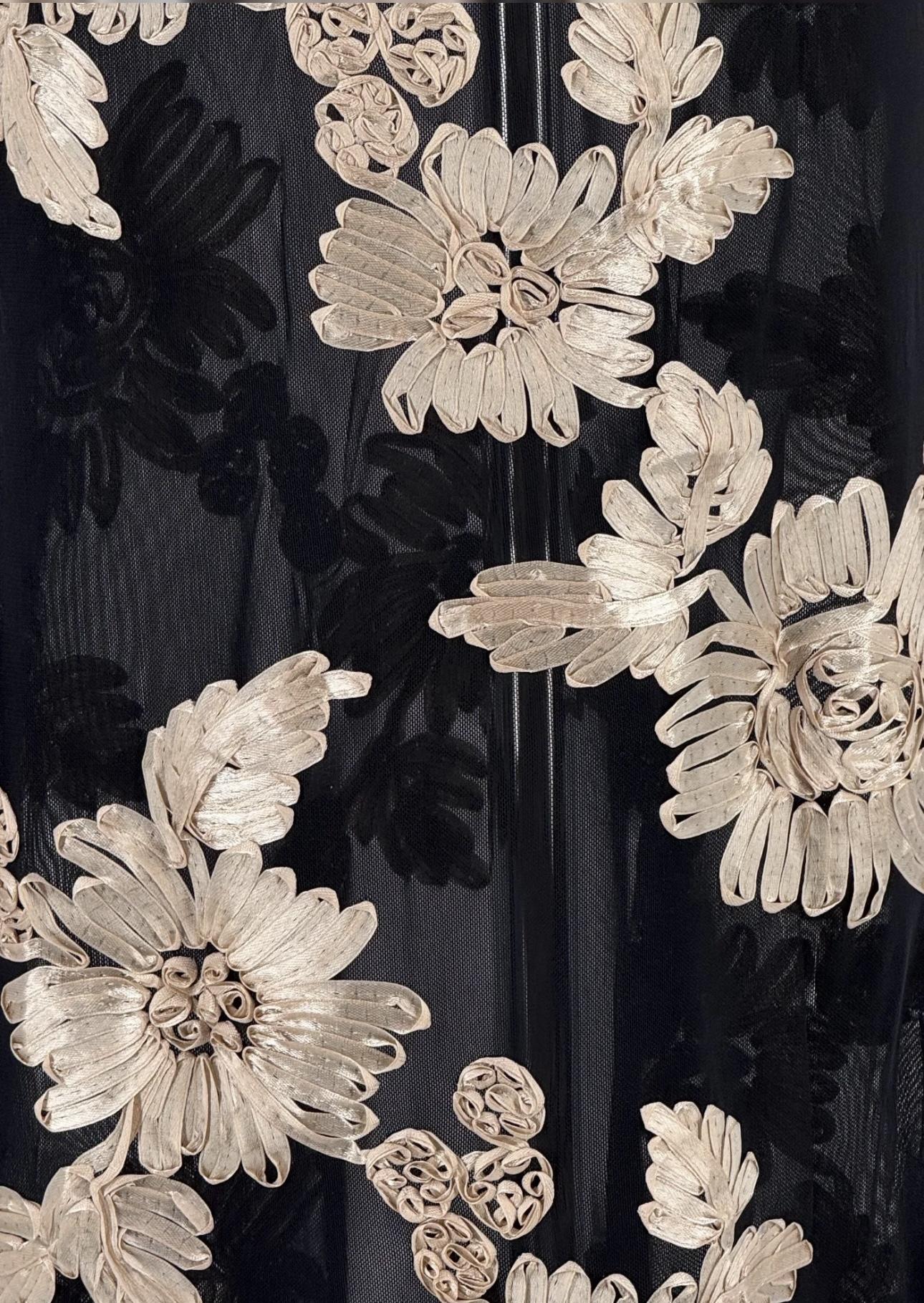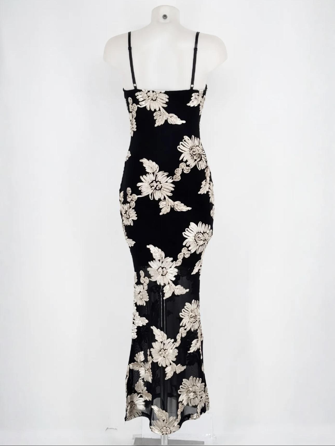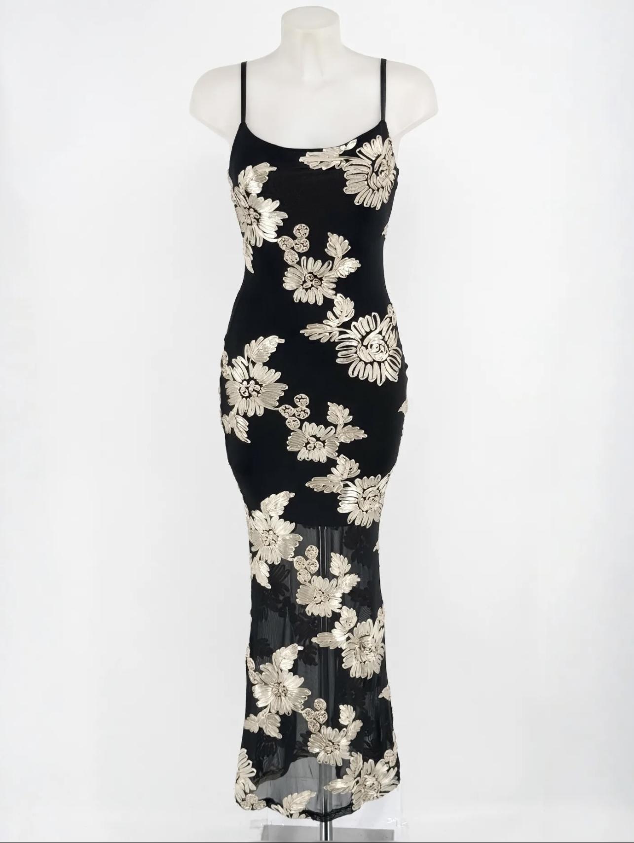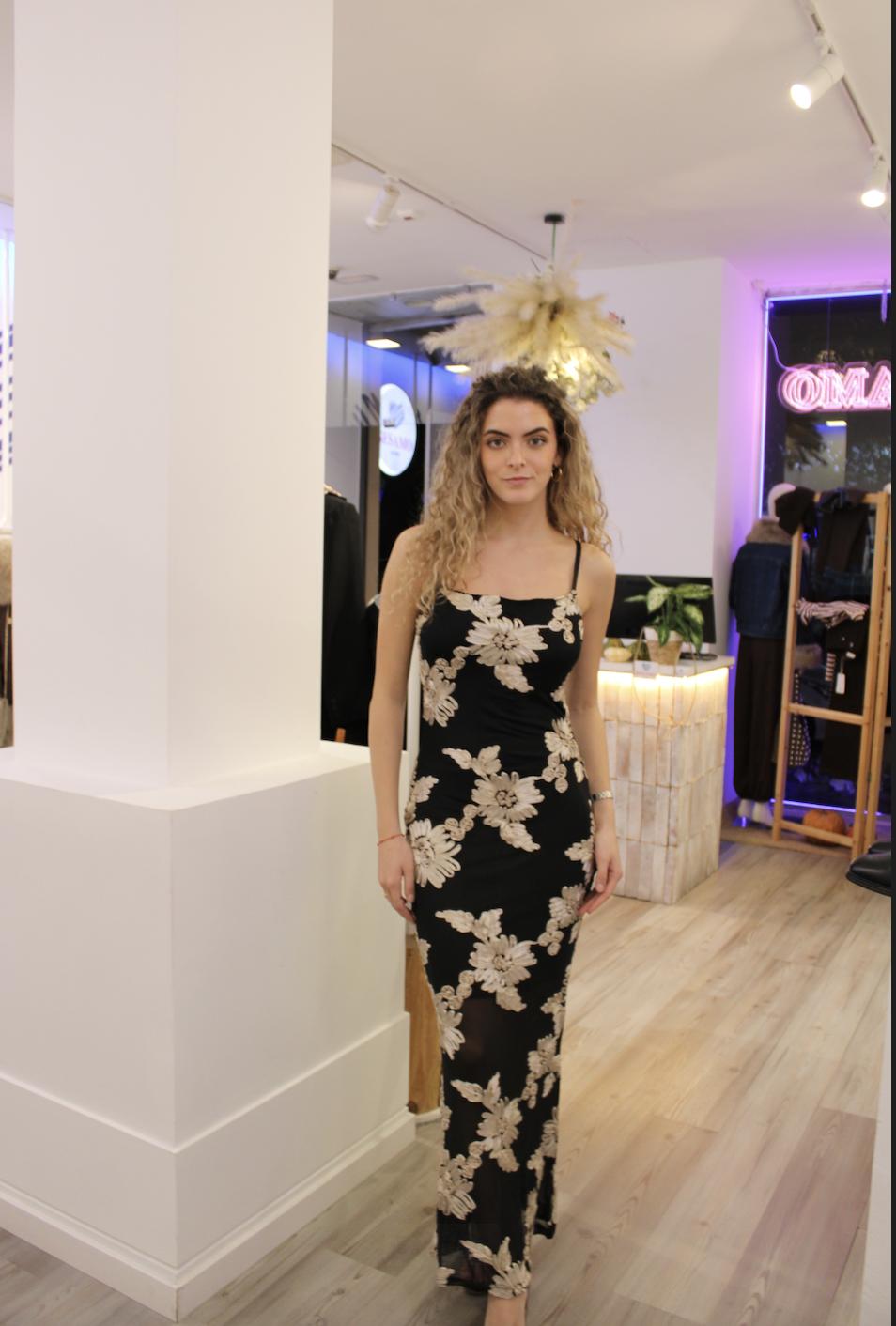 Espectacular vestido de fiesta largo, con tirantes,en negro con estampado de flores.