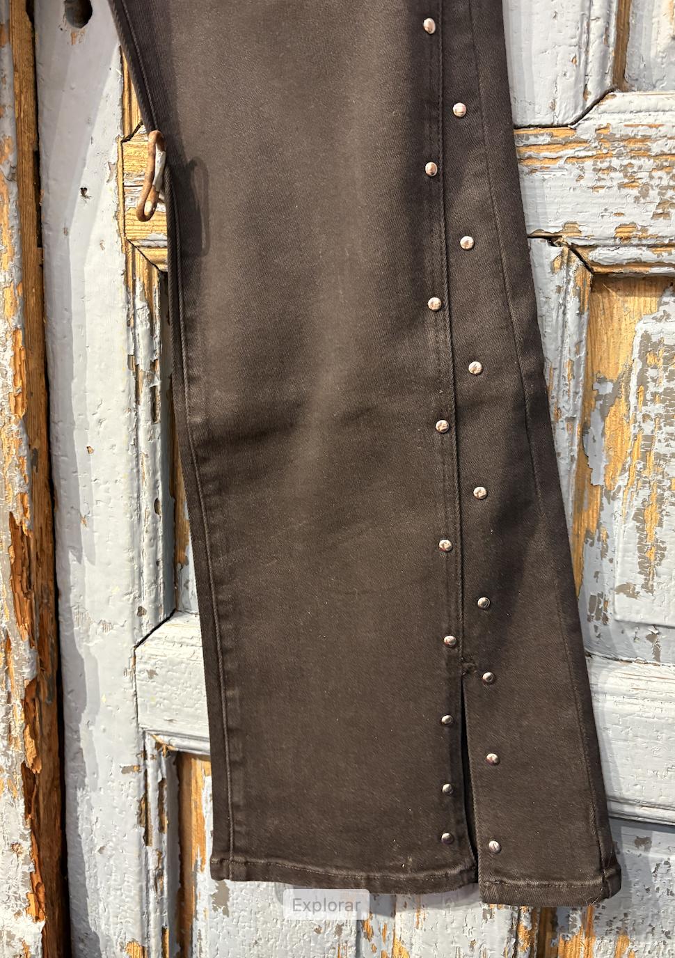 Denim recto en color negro, con tachuelas en los laterales y abertura en la parte de abajo.
