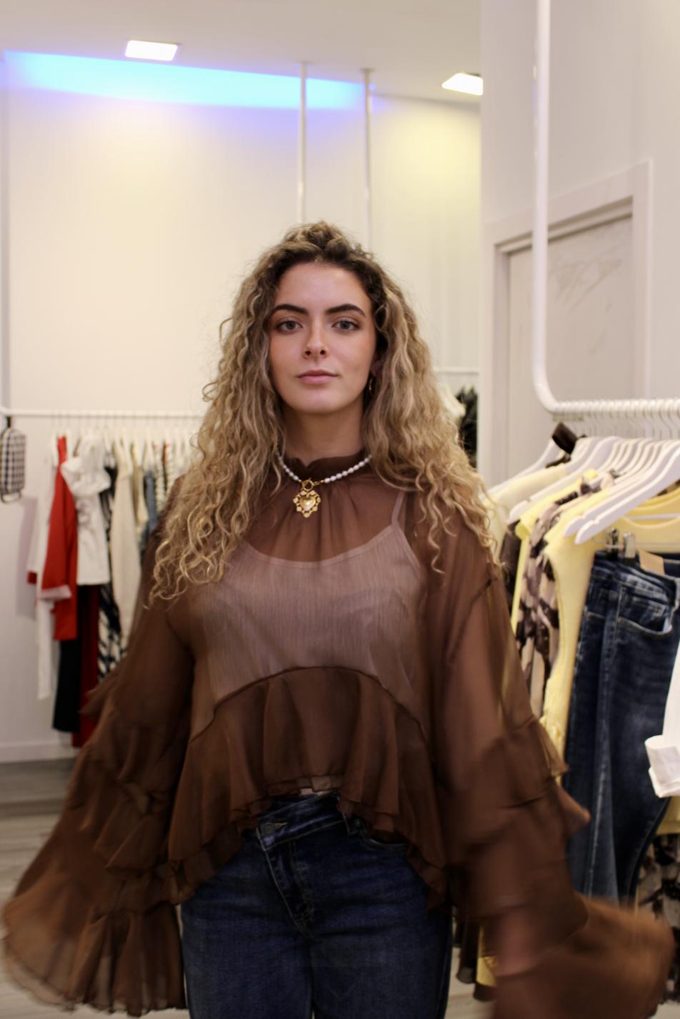 Espectacular blusa en color chocolate, con manga larga y volantes. Tiene una lazada al cuello.
