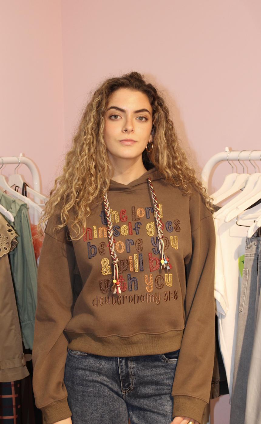 Sudadera en color marron. Con bordados de colores hechos a mano y cordones de colores.