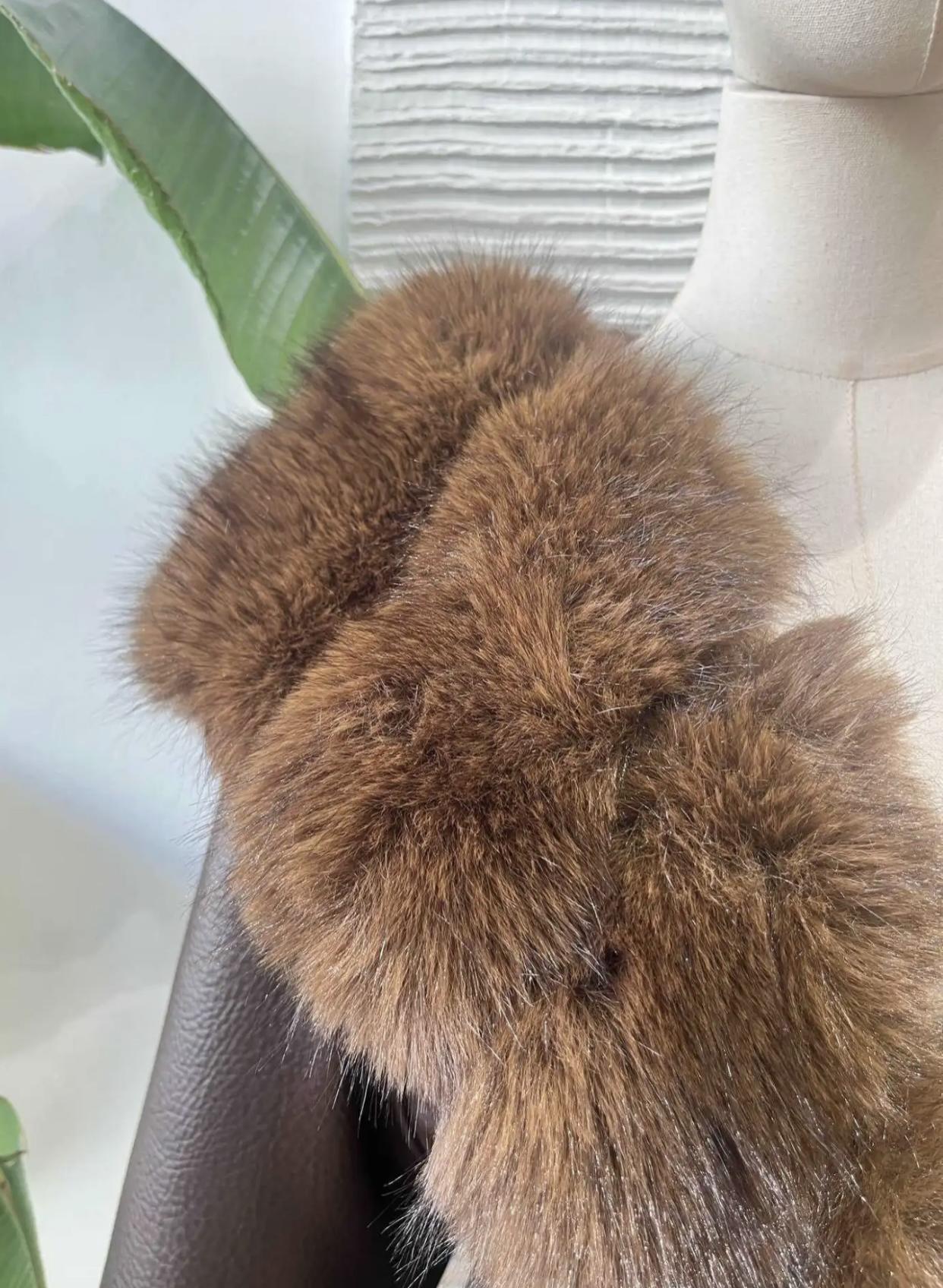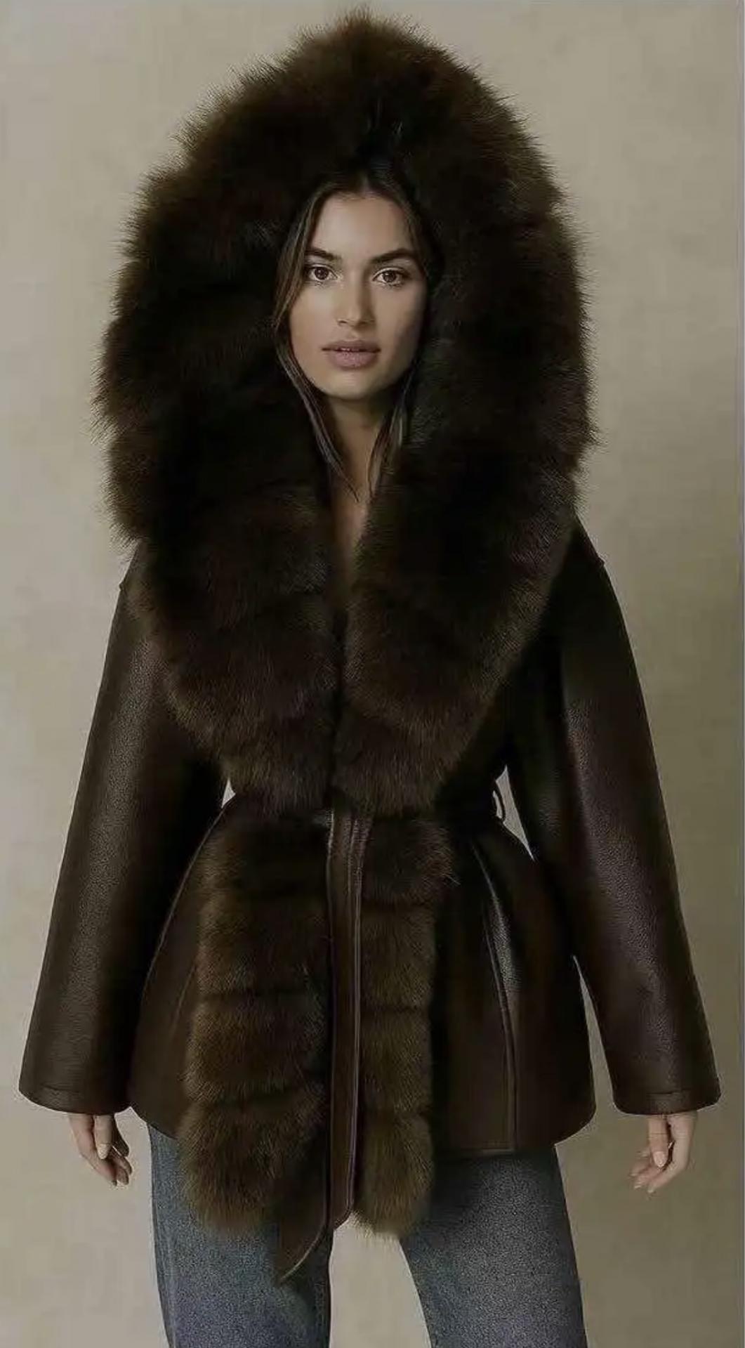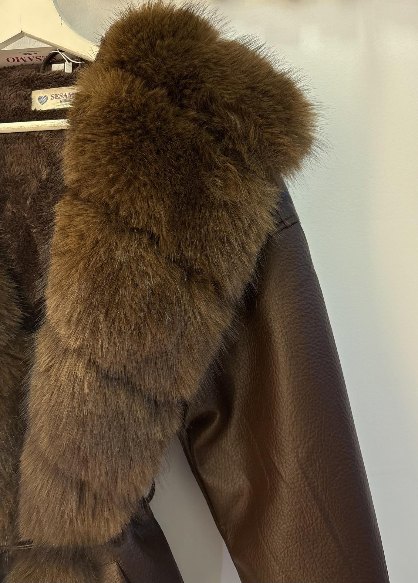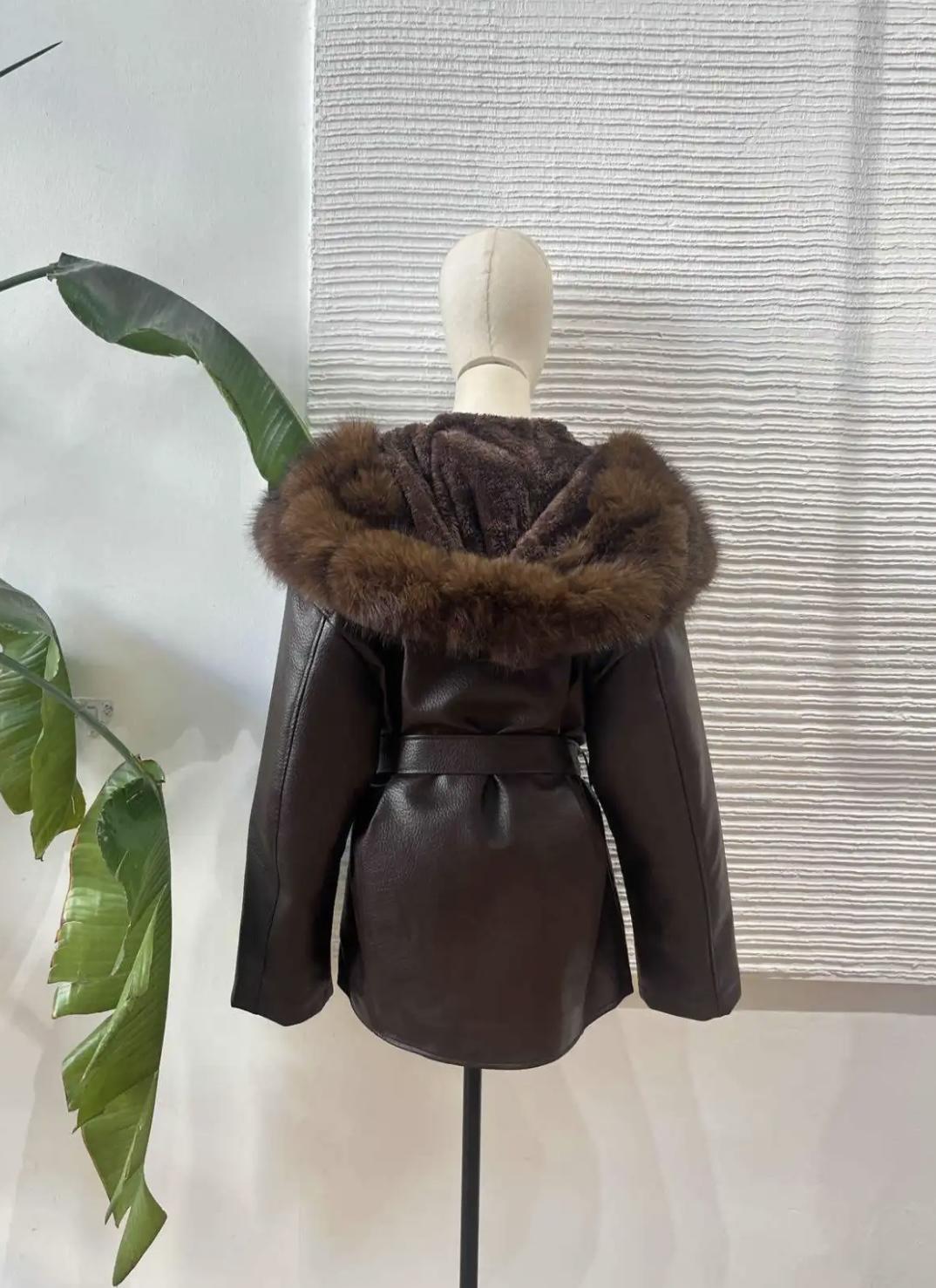 Espectacular chaqueton de color chocolate con cuello y capulla de pelo. Con forro recubierto de pelo y con cinturon a juego.