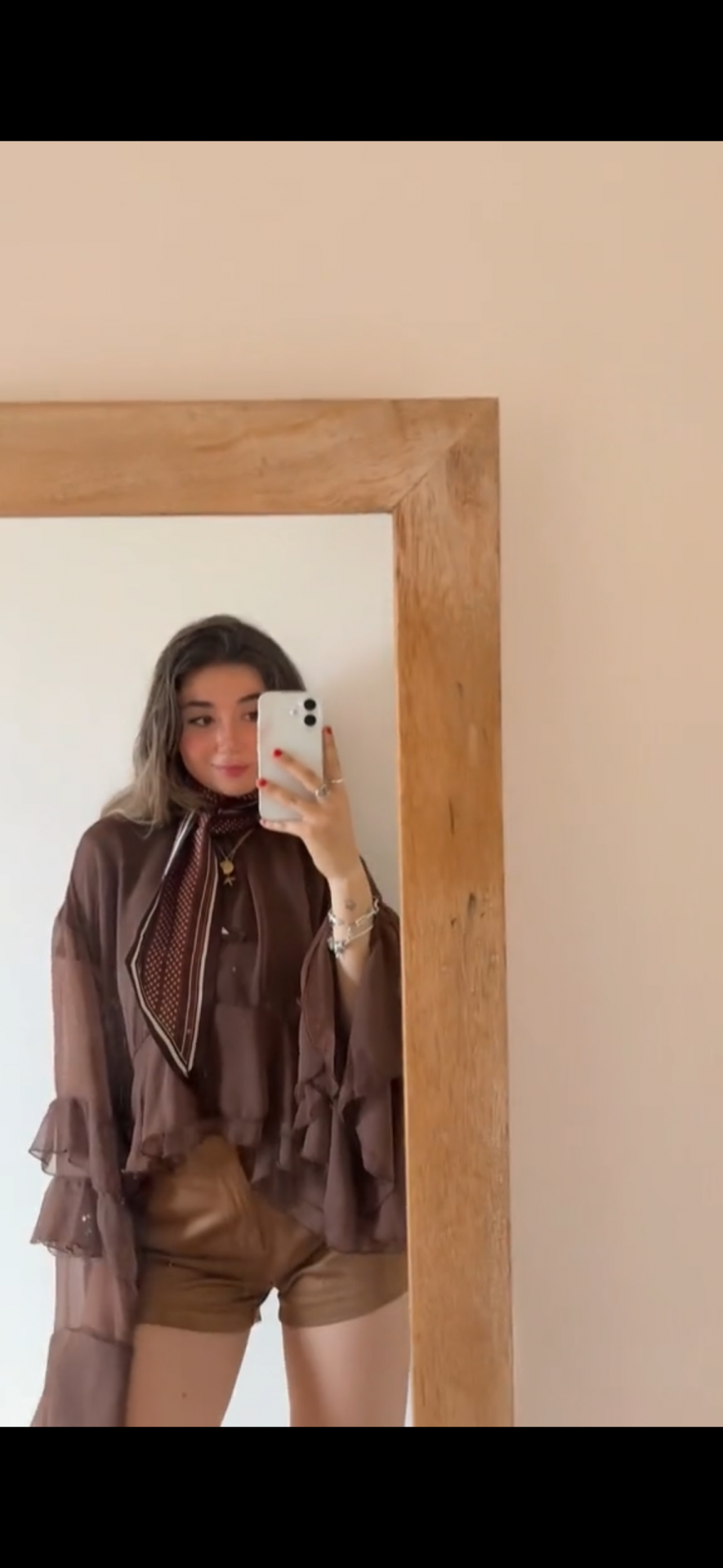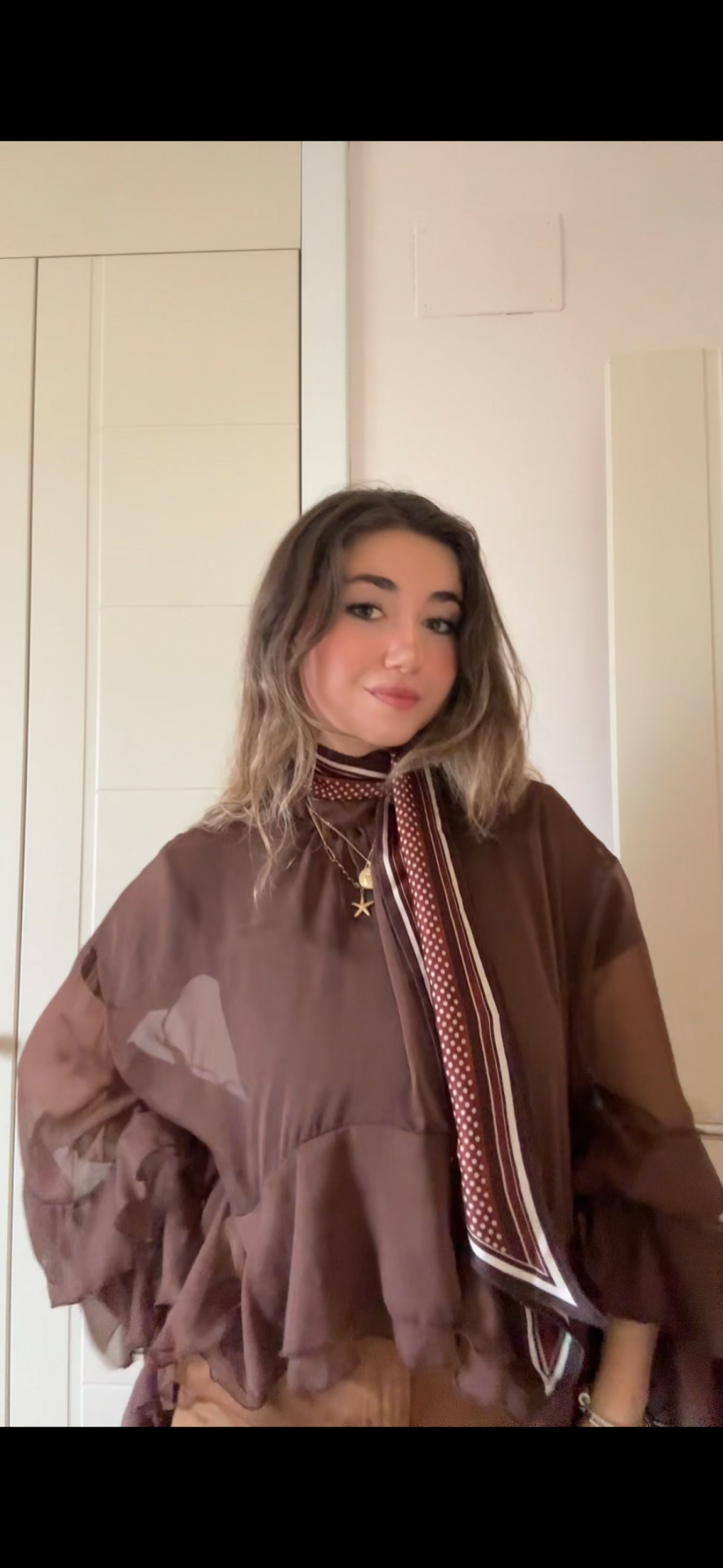 Pañuelo de seda en color chocolate con topos blancos y acabado en pico.