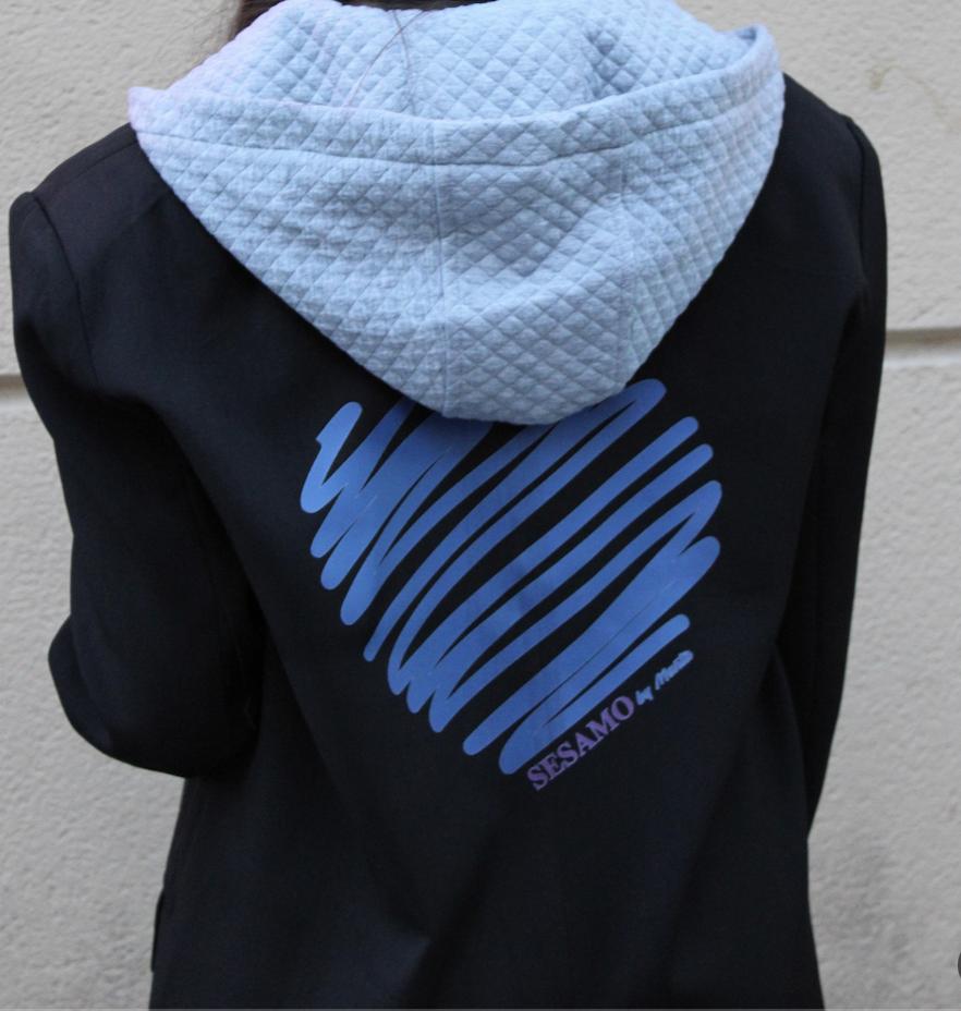 Espectacular blazer en negro con botones , combinada en el interior con chaqueta de color gris y capucha.