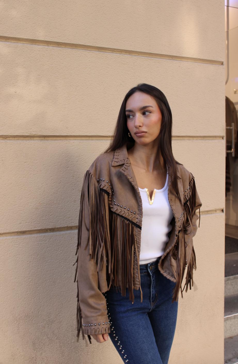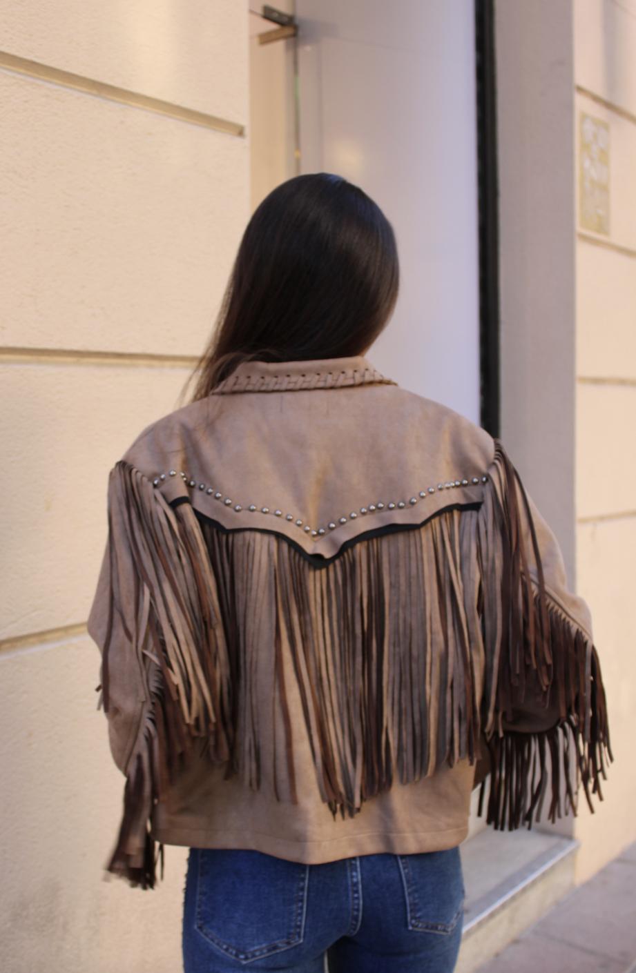 Chaqueta de ante con flecos en mangas y pecho. En color marron con tachuelas.