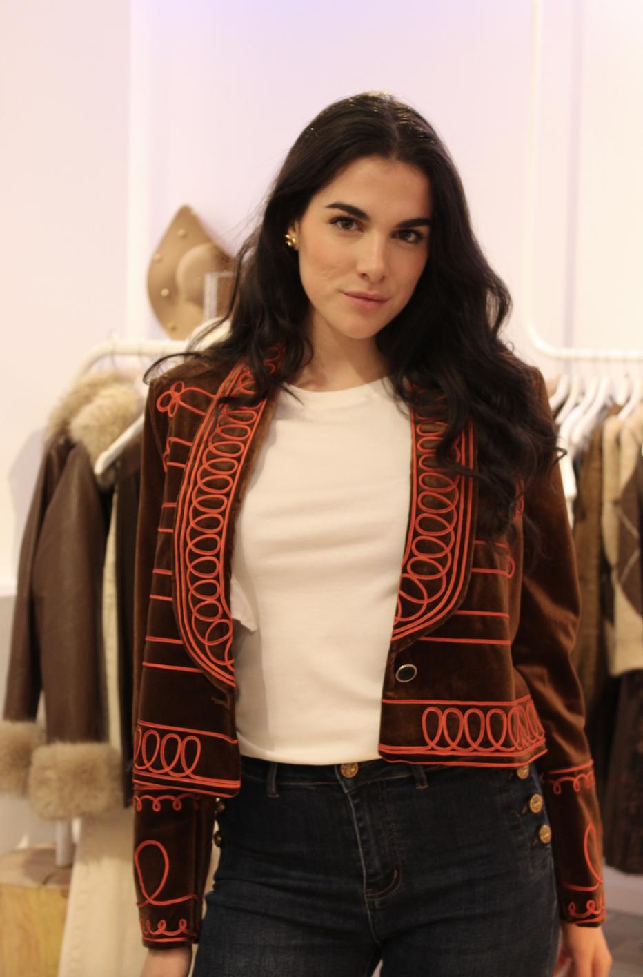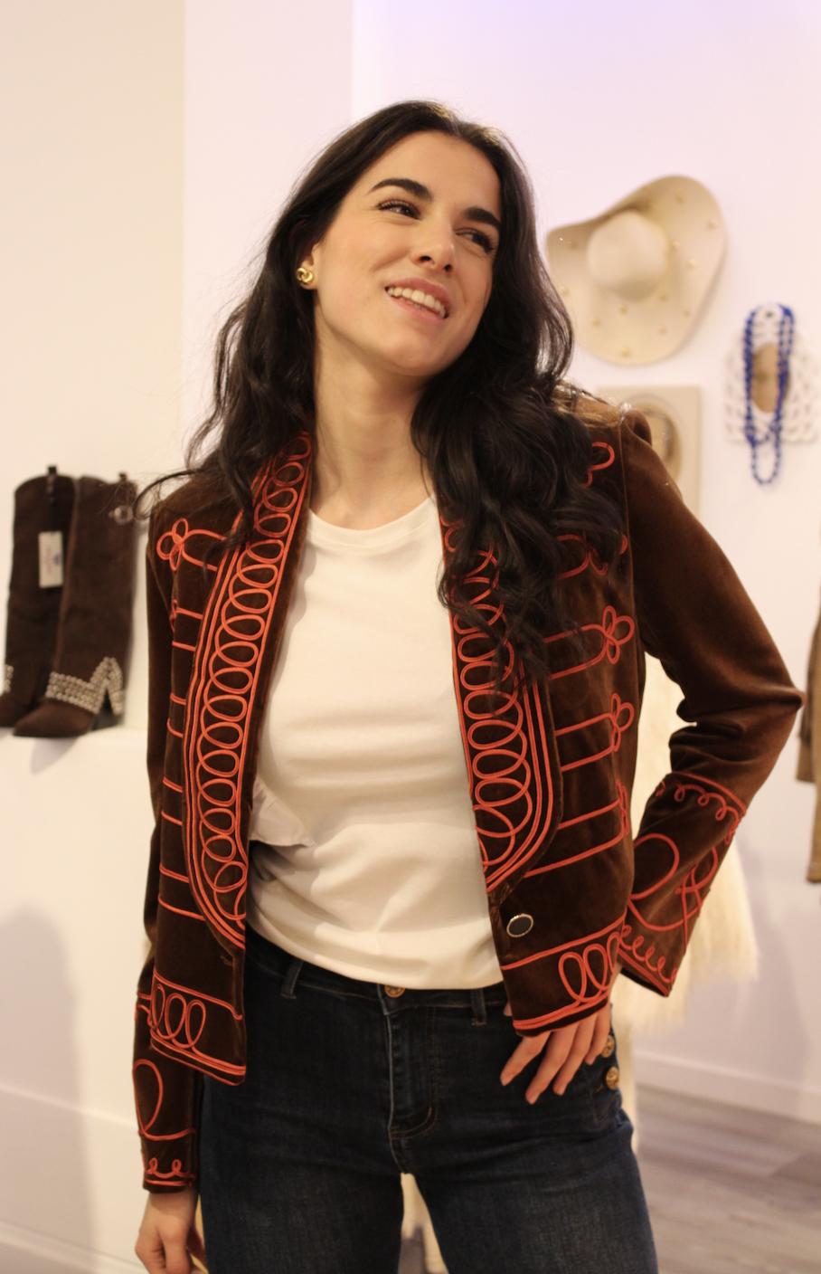 Chaqueta de terciopelo en color chocolate con bordados en color coral.