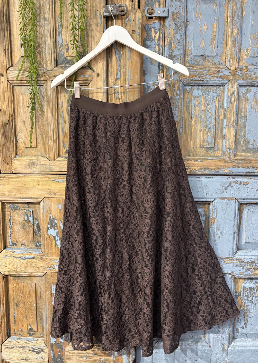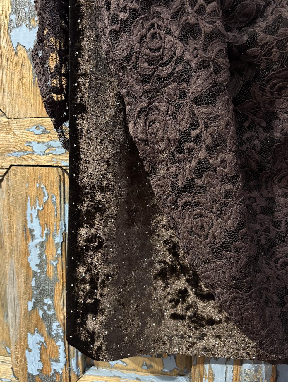 Falda de encaje de color chocolate, elastica en la cintura y con forro de terciopelo y pedreria.