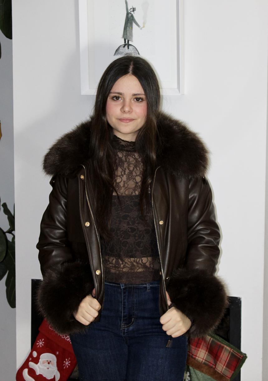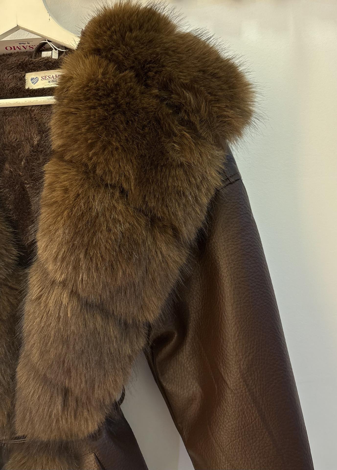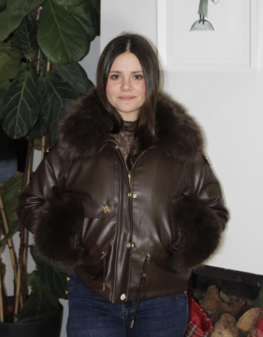 Chaqueta de ecopiel en color chocolate, con pelito super agradable en cuello y puños que se pueden quitar. Detalle de botones en dorado y zona de la cintura ajustable. Tiene bolsillos y va forrada de pelito por dentro.