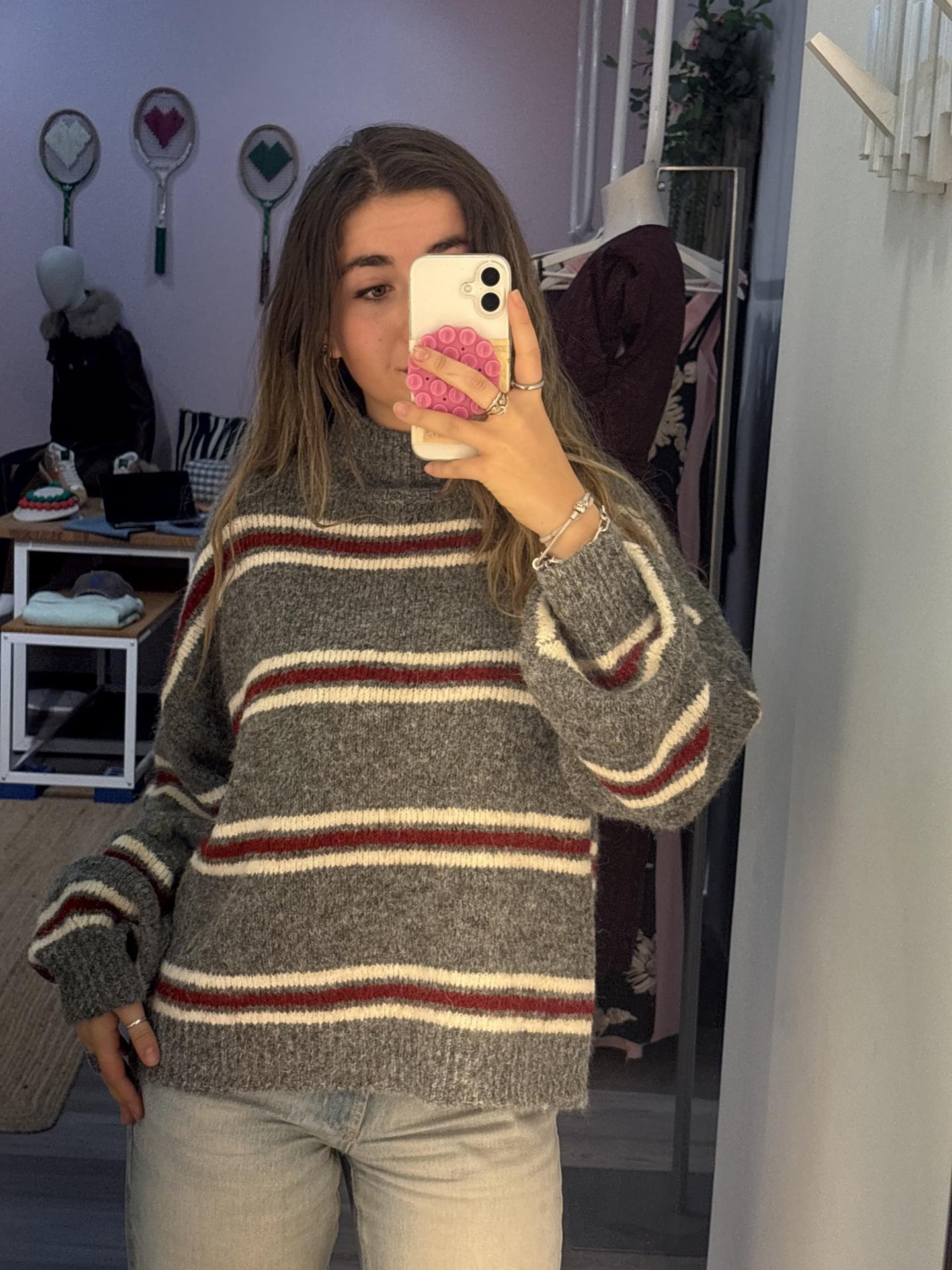 Jersey anchito en color gris con rayas burdeos, muy agradable al tacto y de cuello cerrado.