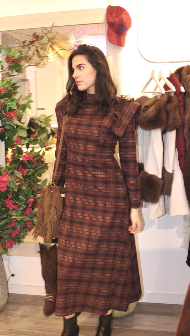 Vestido largo de cuadros en color burdeos, con solapa sobre los hombros y cuello cerradito. Se cierra a la espalda con cremallera invisible. Lleva forro.