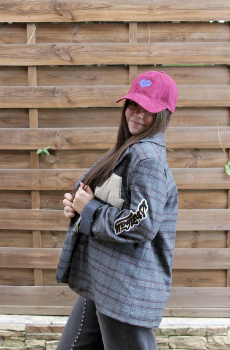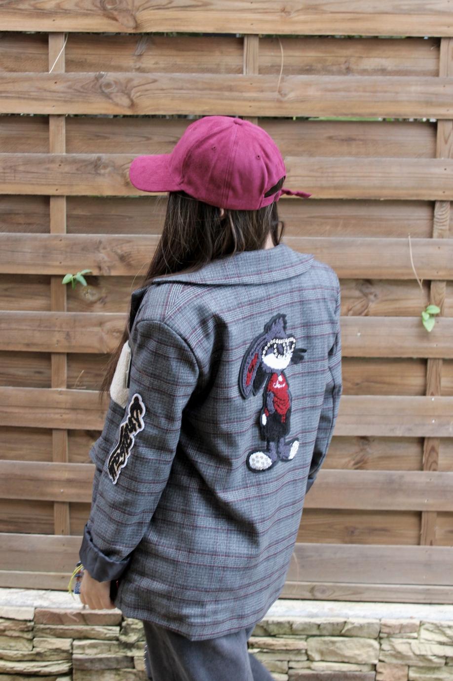 Original blazer gris de cuadros, con letras bordadas en la parte delantera y en la manga y a la espalda bordado de conejito combinado con strass. Tiene bolsillos.