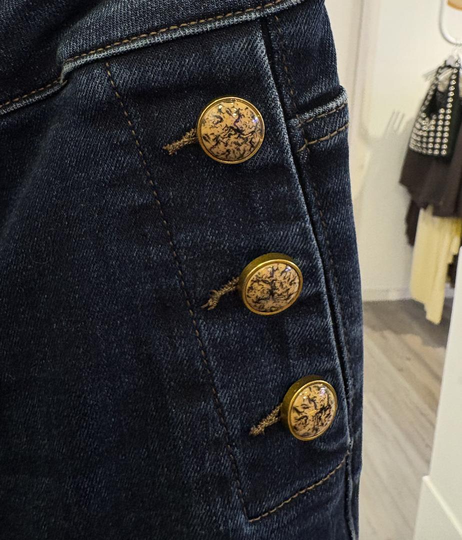Denim de corte recto ligeramente acampanado, con botones en los dos lados a la altura de la cadera y bolsillos traseros.