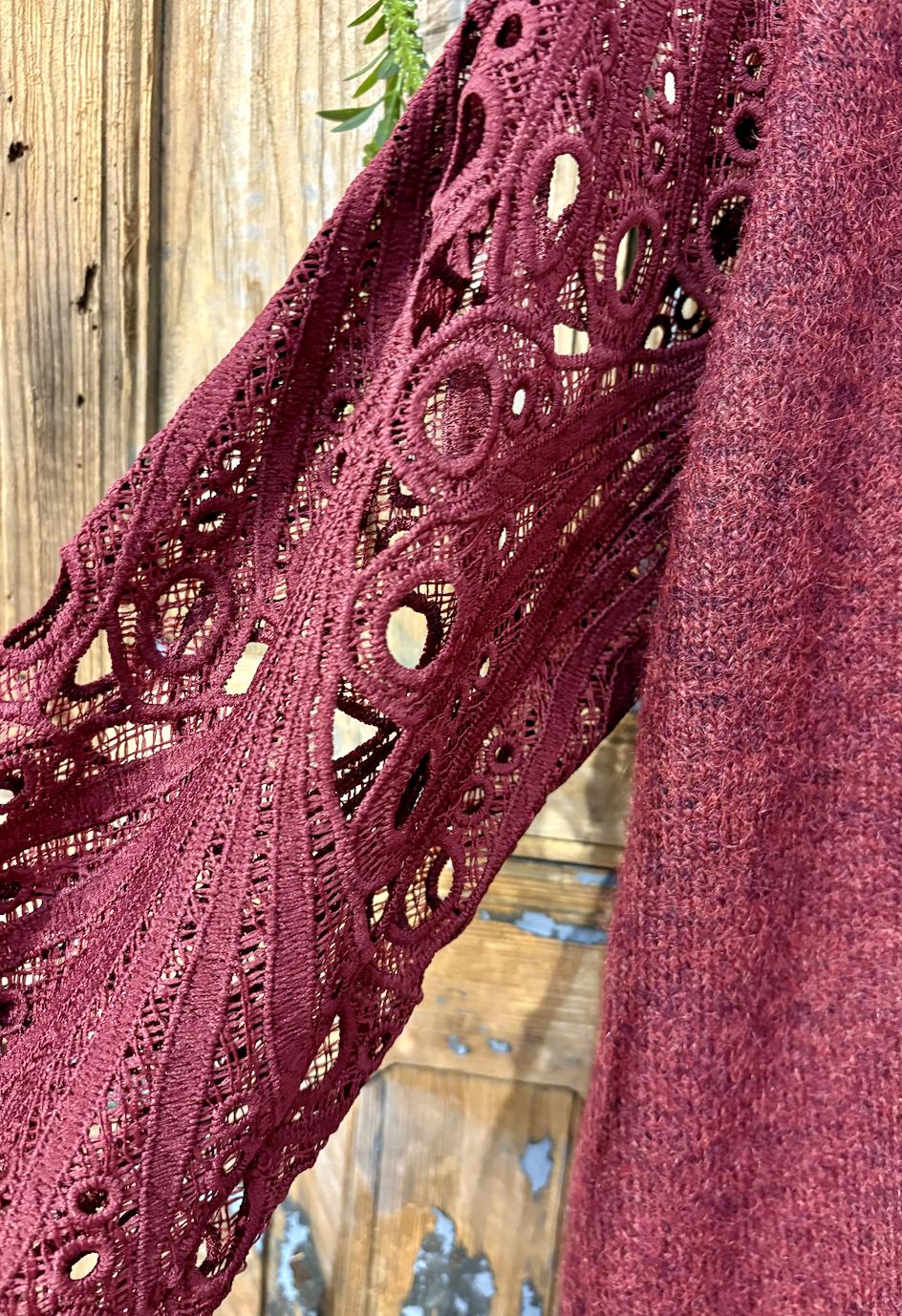 Jersey de lana disponible en choco y burdeos, con un diseño especial que combina cuerpo tejido en lana suave y mangas de encaje Una prenda cálida, cómoda y con un toque artesanal perfecto para tus looks de otoño e invierno.