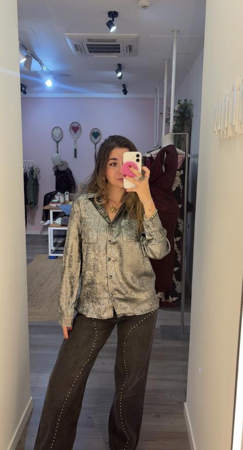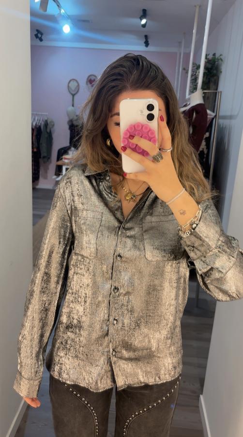 Camisa satinada de efecto metalizado en tono gris humo. Presenta un acabado luminoso con textura suave, cierre delantero con botones y dos bolsillos frontales que aportan estilo y funcionalidad. Su diseño fluido y ligero la convierte en una prenda versátil, perfecta para looks de fiesta o estilismos más formales.