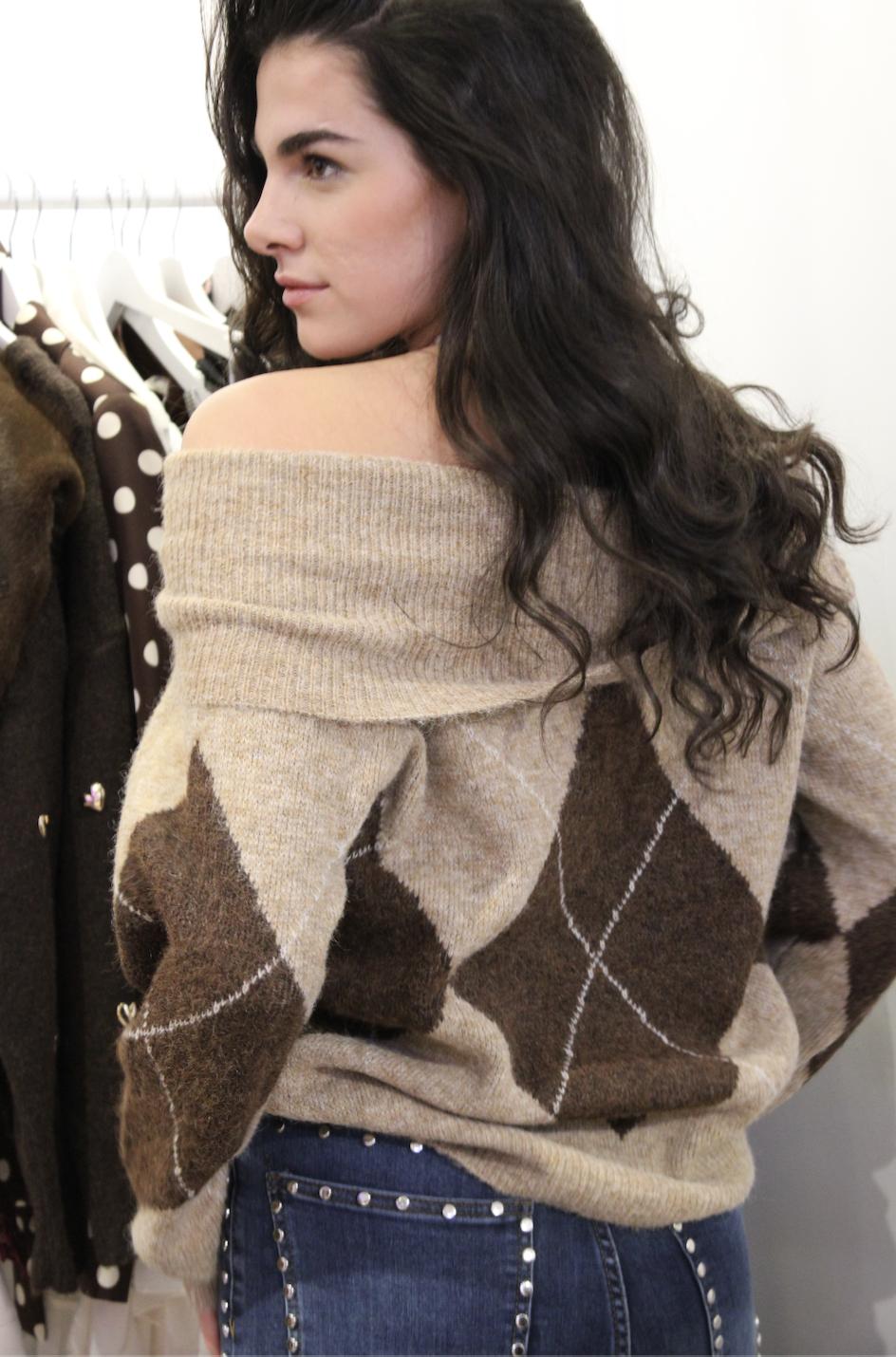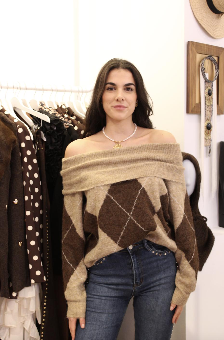 Jersey Bardot con diseño de rombos, suave y cómodo, perfecto para looks femeninos y actuales. Su escote caído realza los hombros y aporta un toque elegante. Disponible en dos colores: choco y beige, ambos fáciles de combinar y pensados para el día a día.