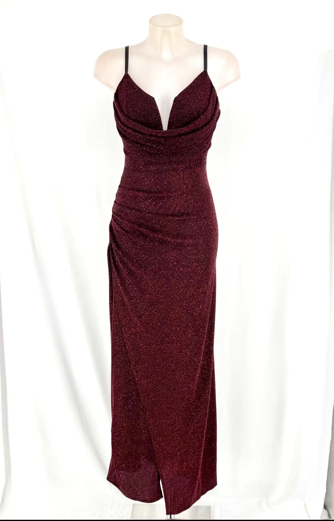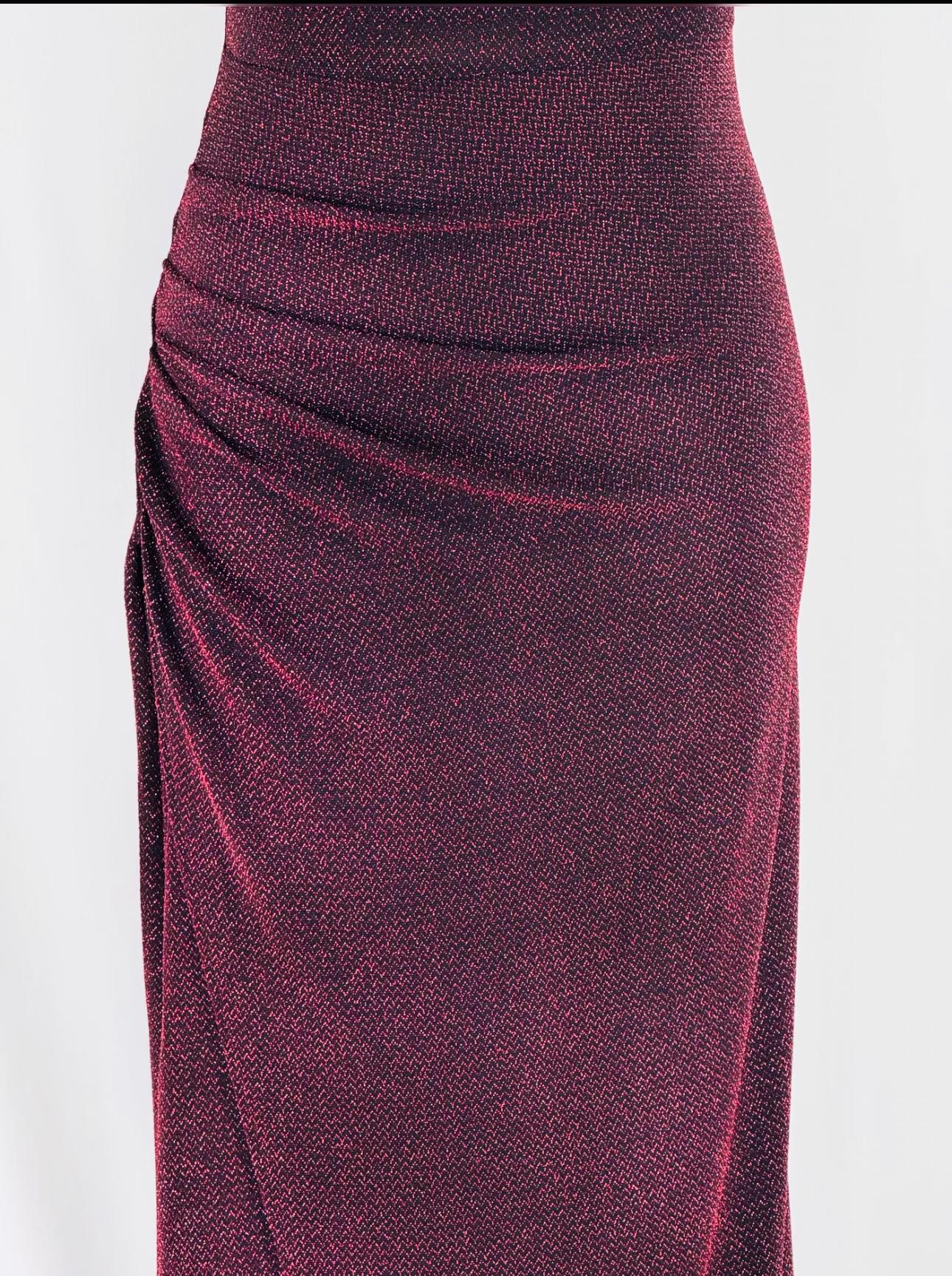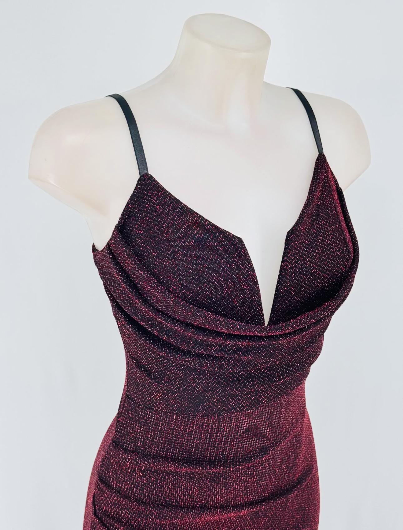 Espectacular vestido largo de lurex en rojo, con escote corazón, drapeado y abertura lateral en una pierna. El vestido ideal para un look de noche.