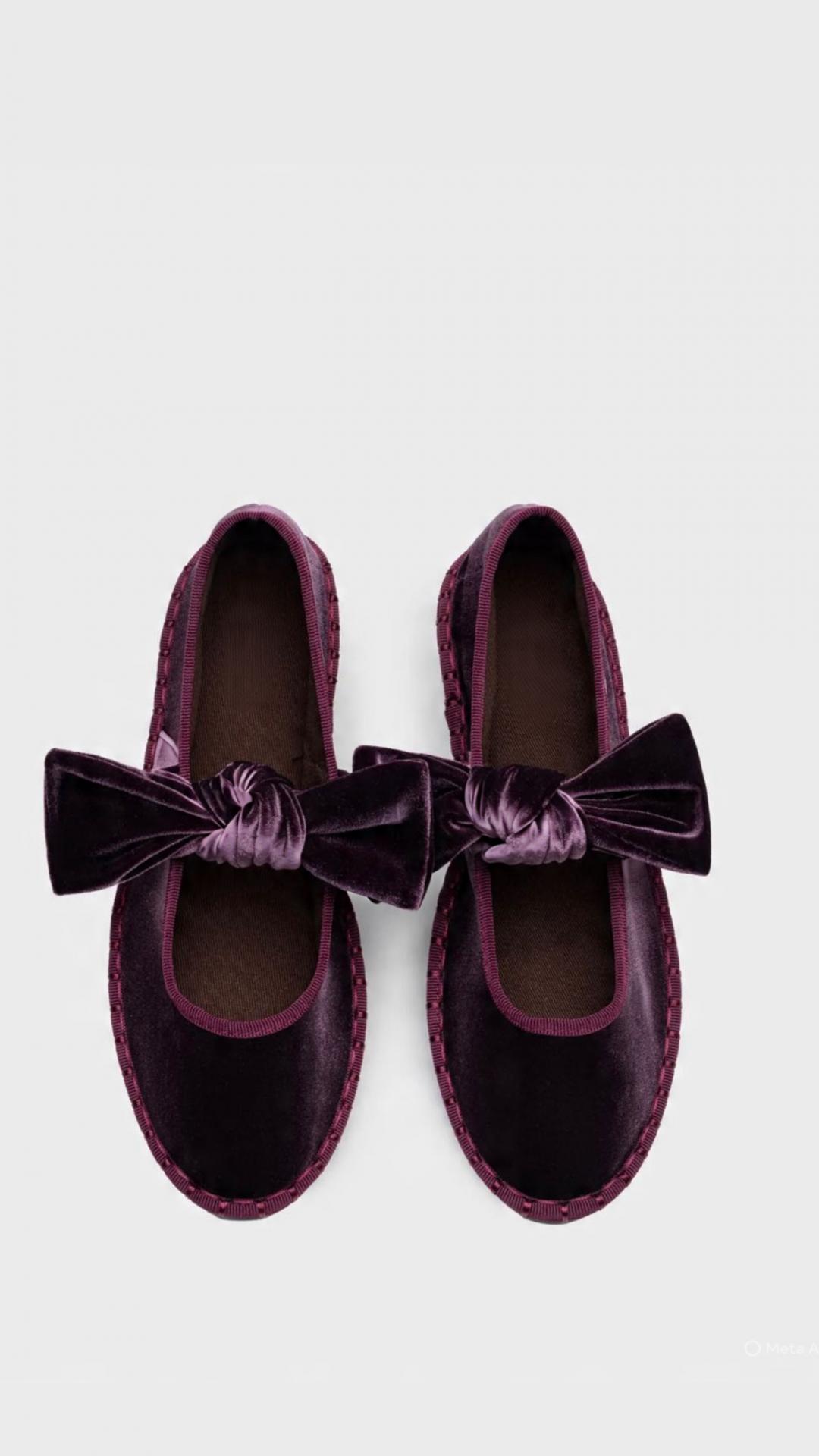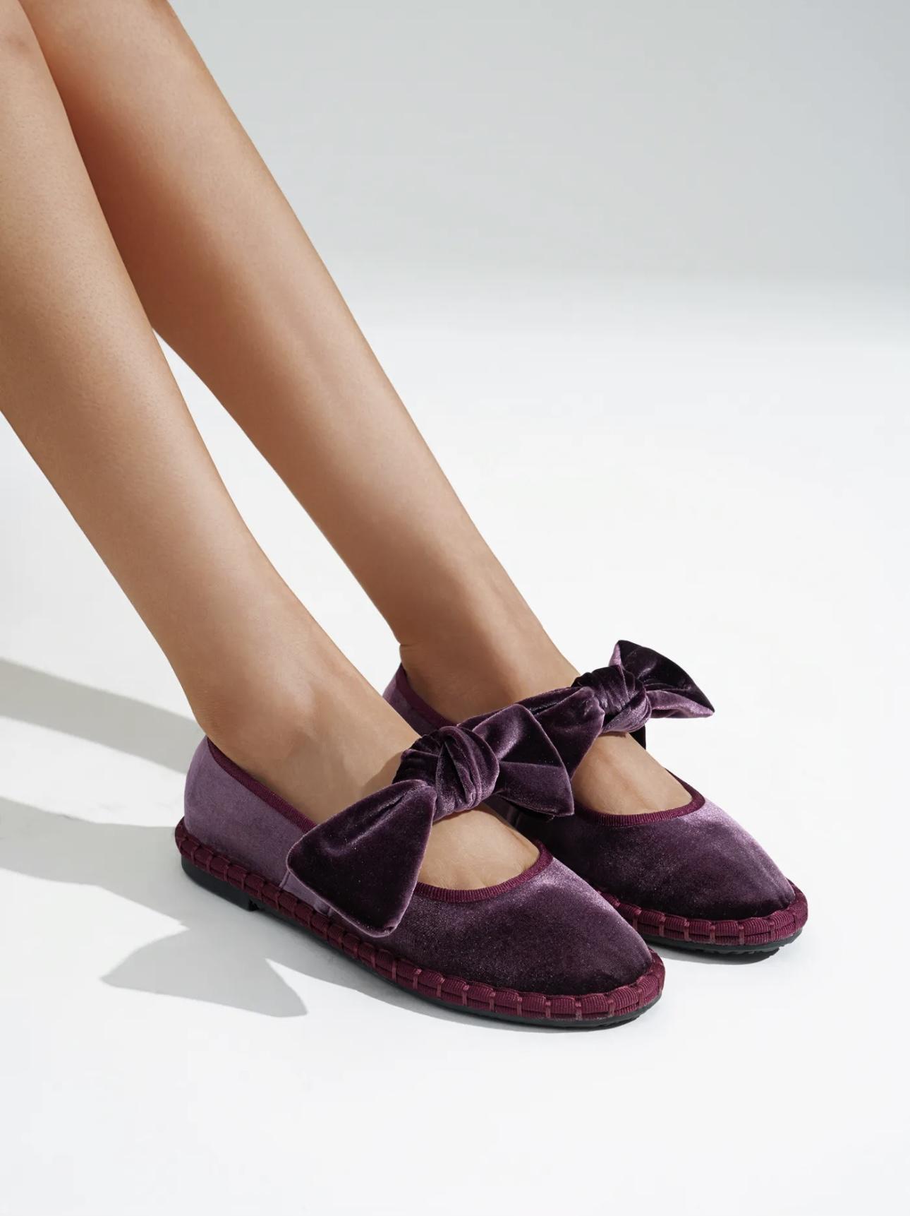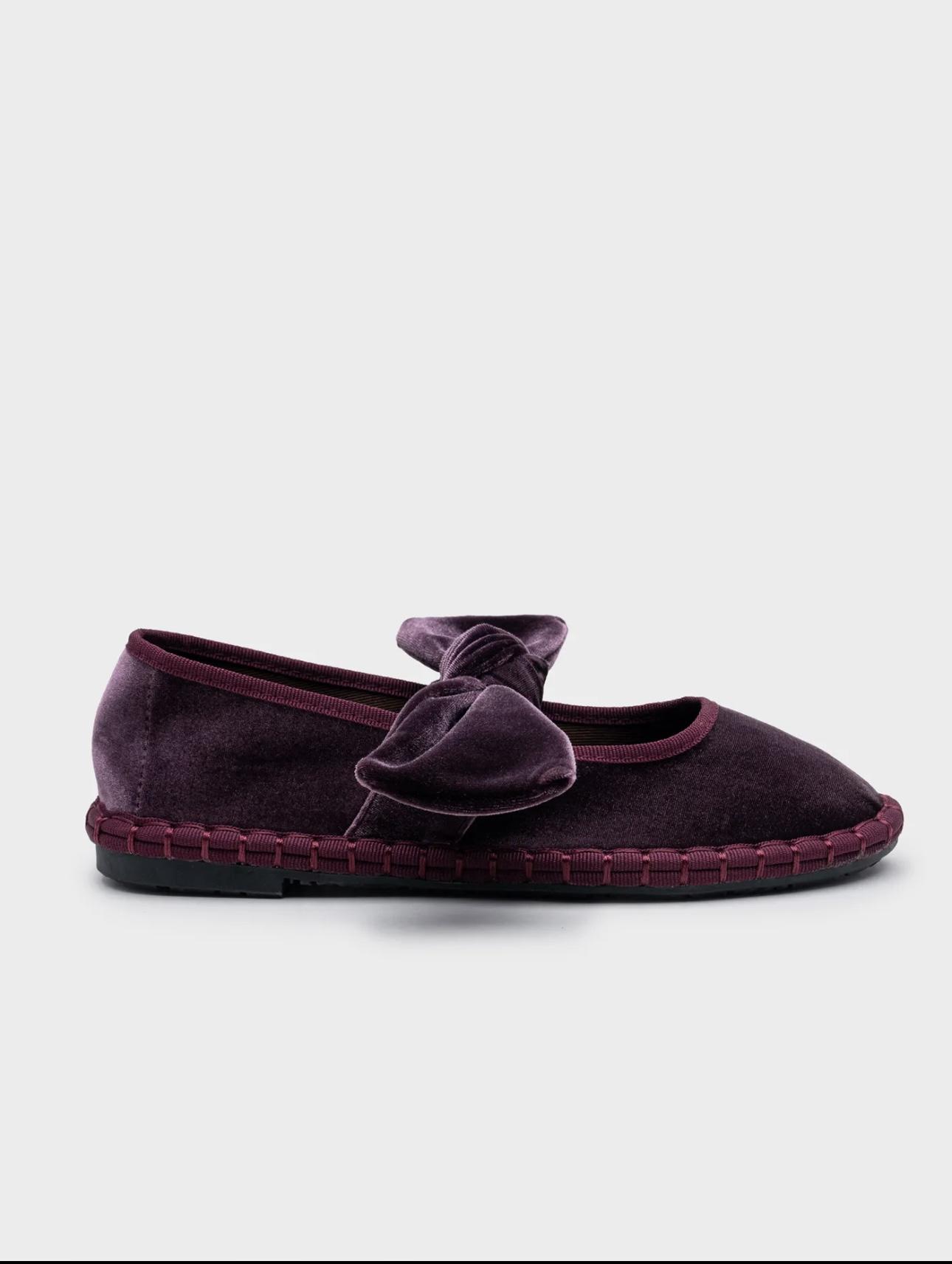 Bailarinas cerradas de terciopelo en color burdeos con lazo a tono de quita y oon. Ideales para ir cómodas con la tendencia de esta temporada.