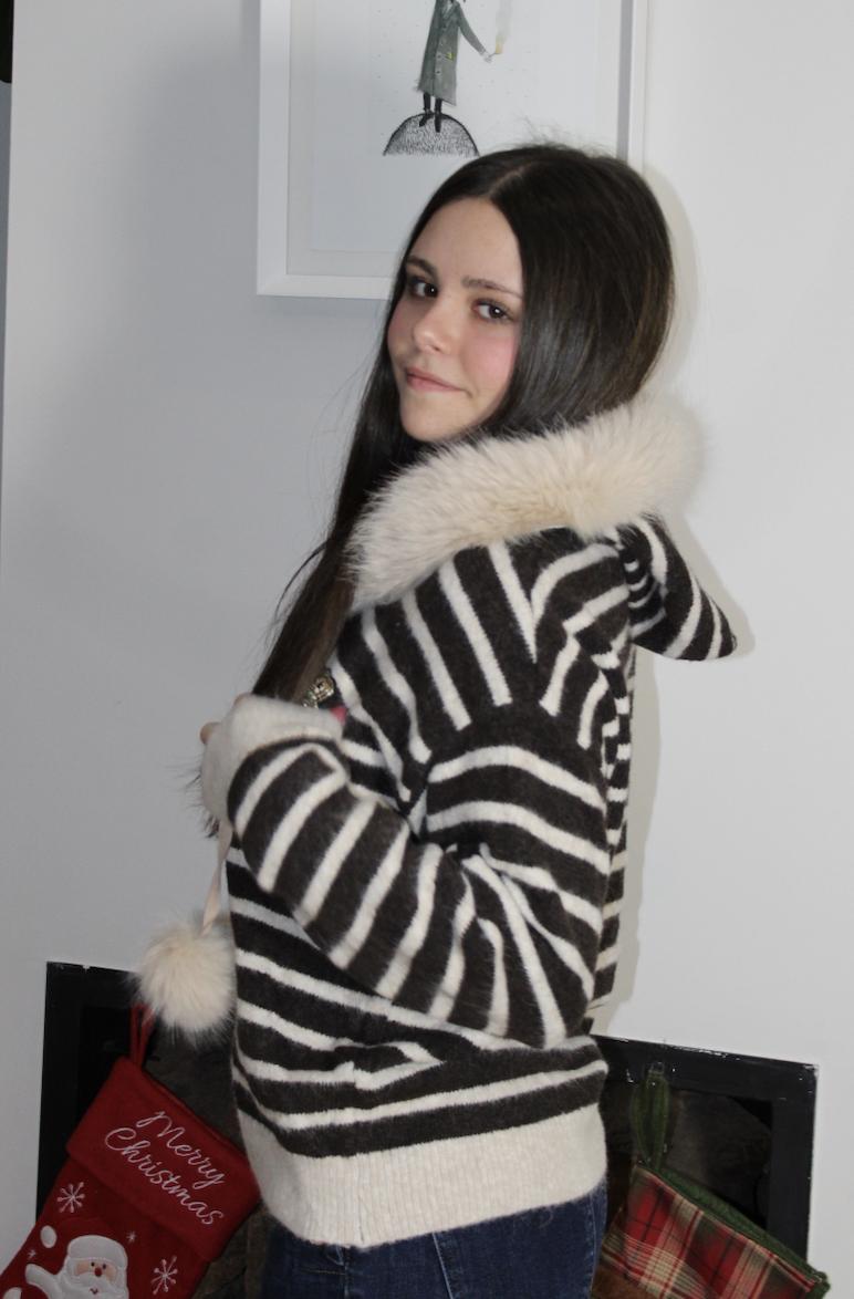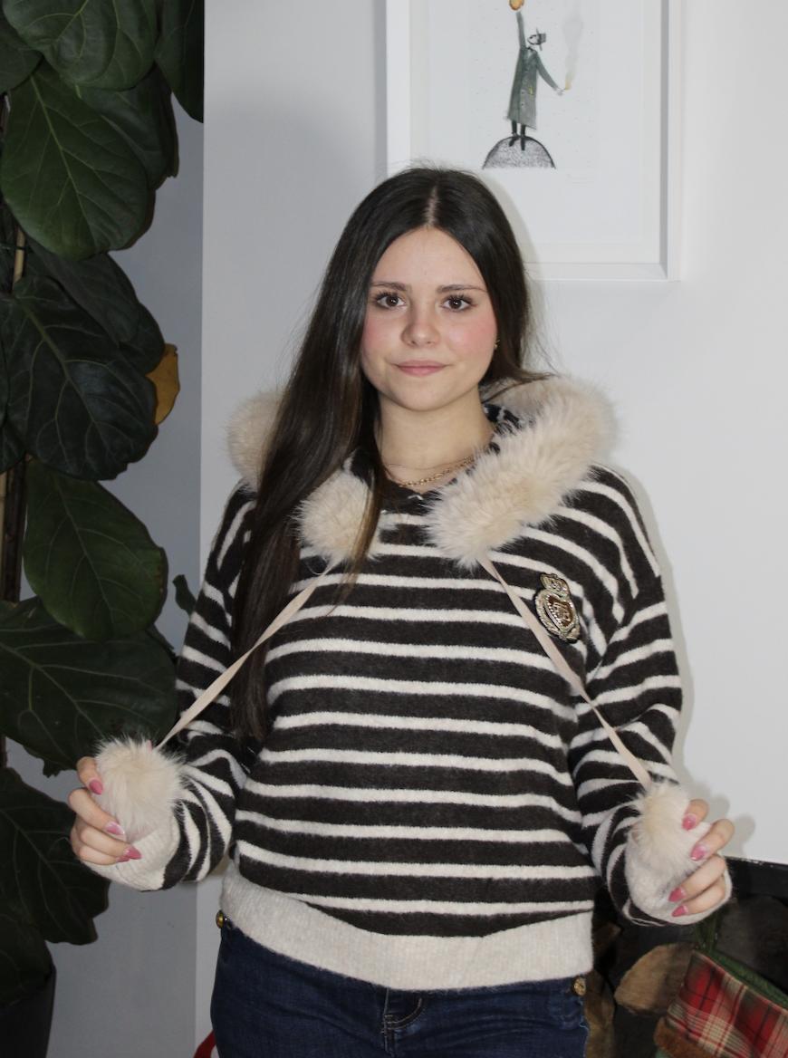 Ideal jersey de punto super agradable, de rayitas en color beige y marrón chocolate, detalle de escudo cosido con hilos en dorado y pequeños strass y capucha con pompones de pelo que se puede quitar y poner.