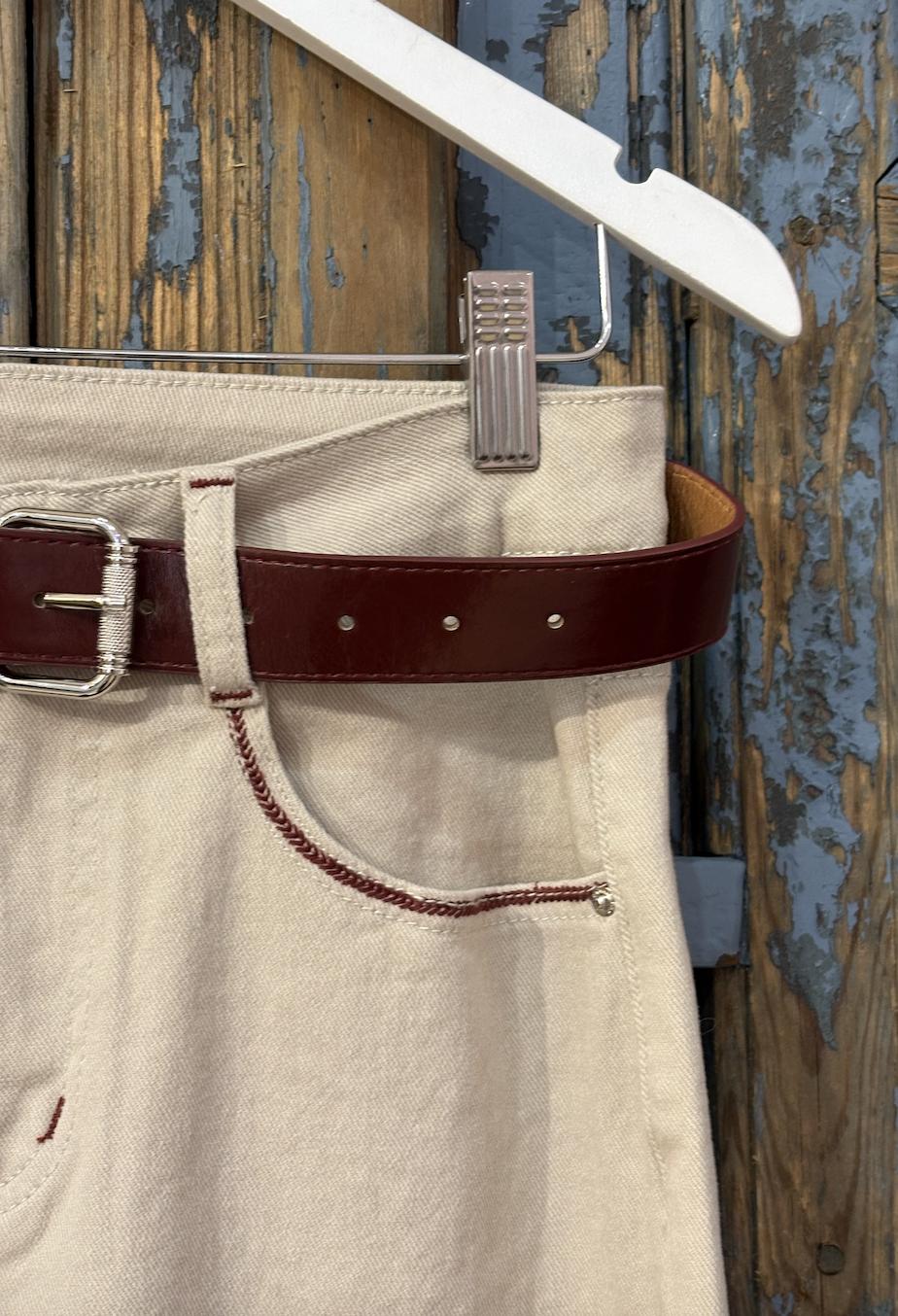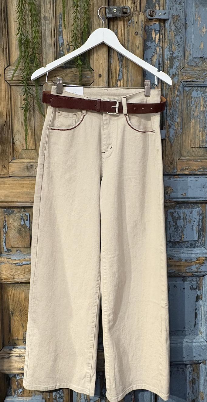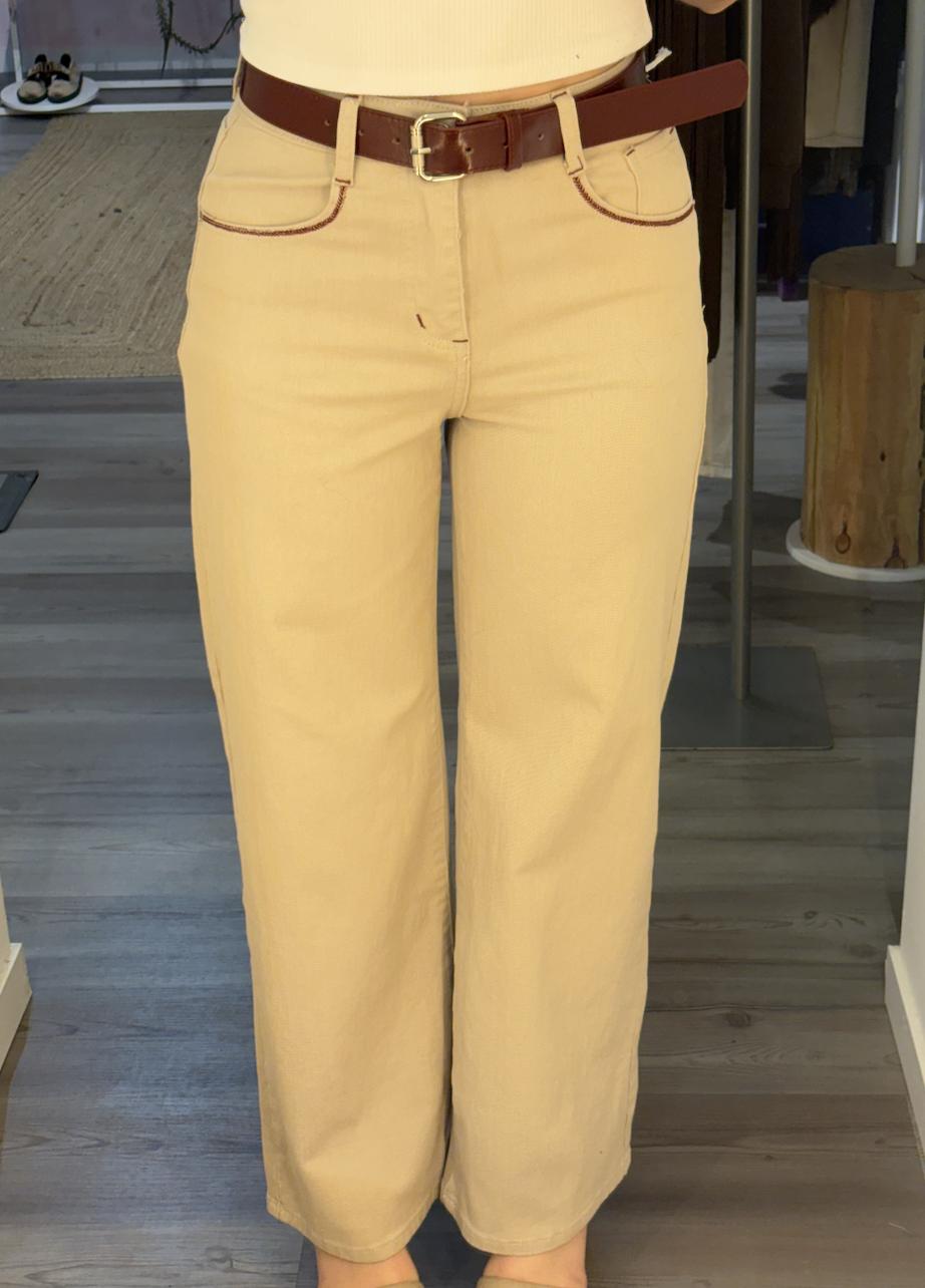 Pantalón wide leg beige con cinturón burdeos. Presenta bolsillos con bordado decorativo en color burdeos alrededor y un corte ancho en la parte inferior, que le da un estilo cómodo y elegante.