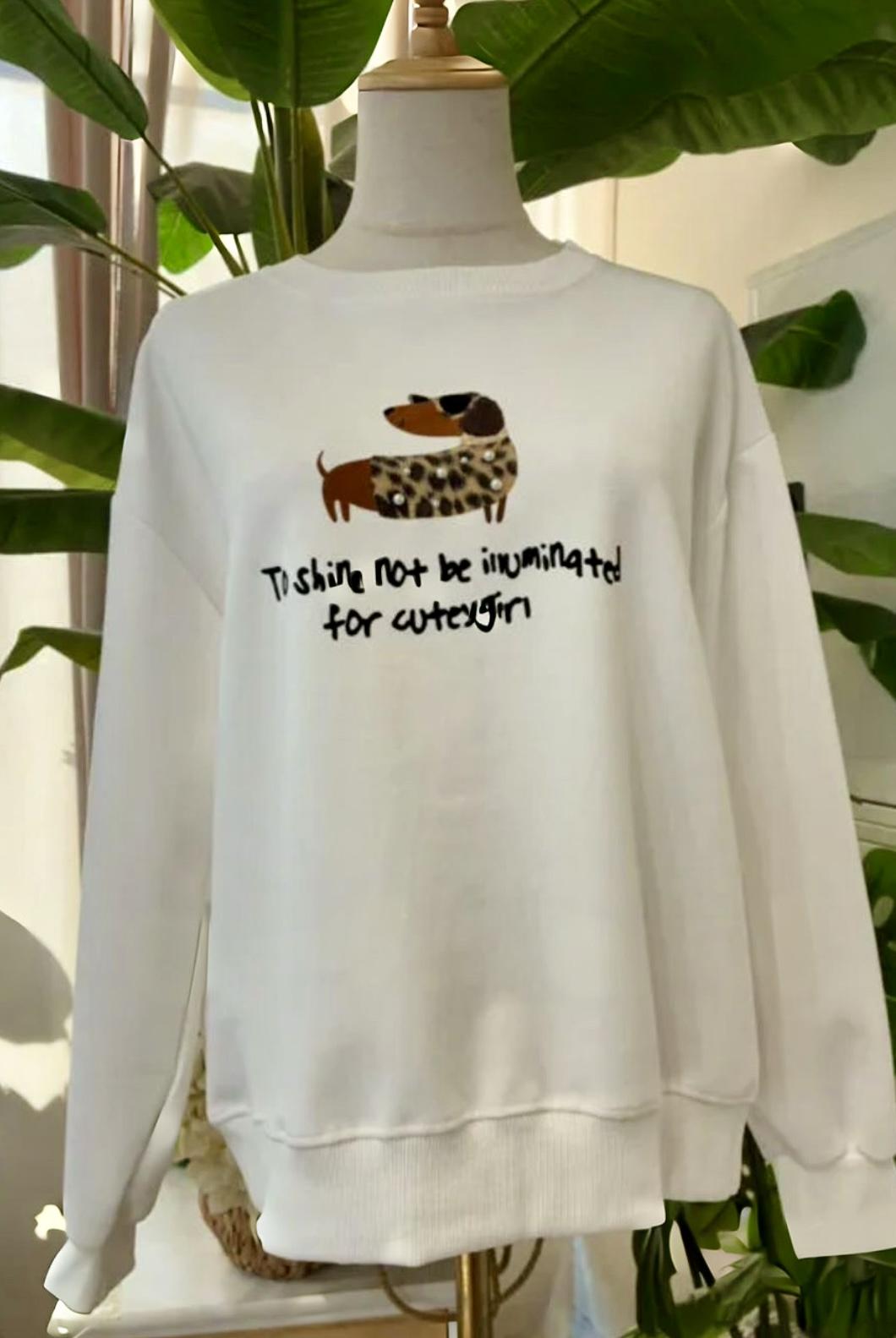 Sudadera estilo neopreno, con un diseño de perro salchicha, el cuerpo estampado de leopardo y con detalles de perlas. Disponibles en blanco y negro.