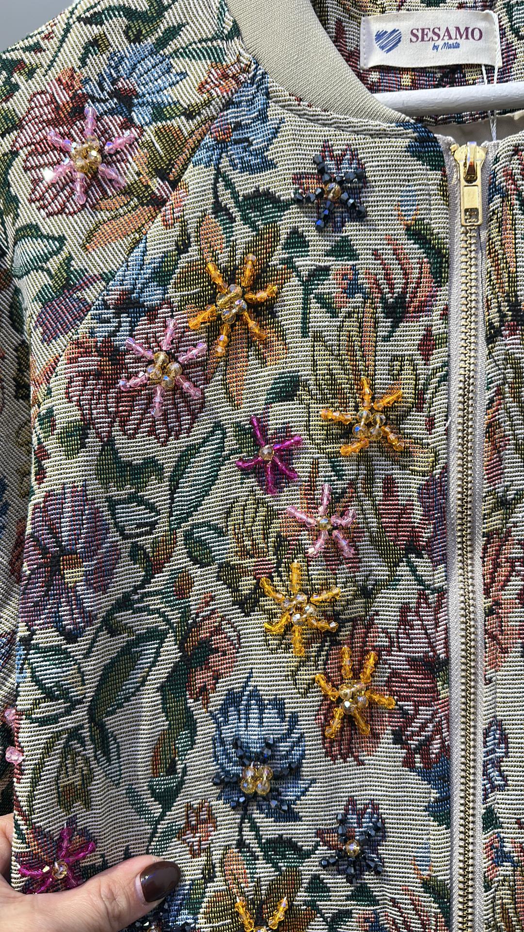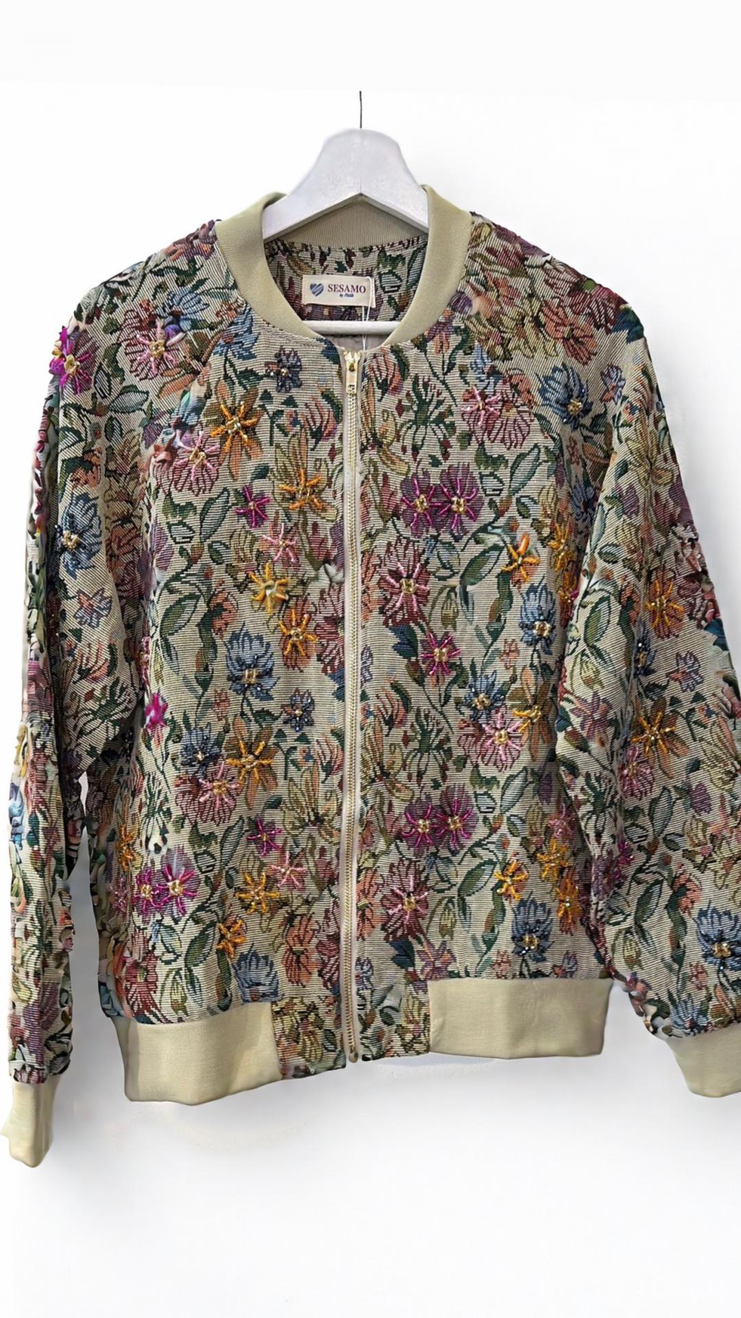 Chaqueta estilo bomber con cremallera. En color beige con estampados de flores bordadas y pequeñas cuentas de colores. Una pieza super original para lucir esta primavera.