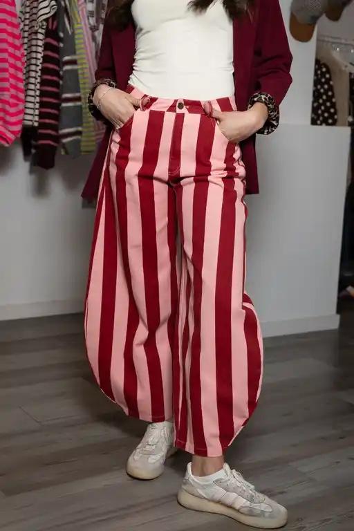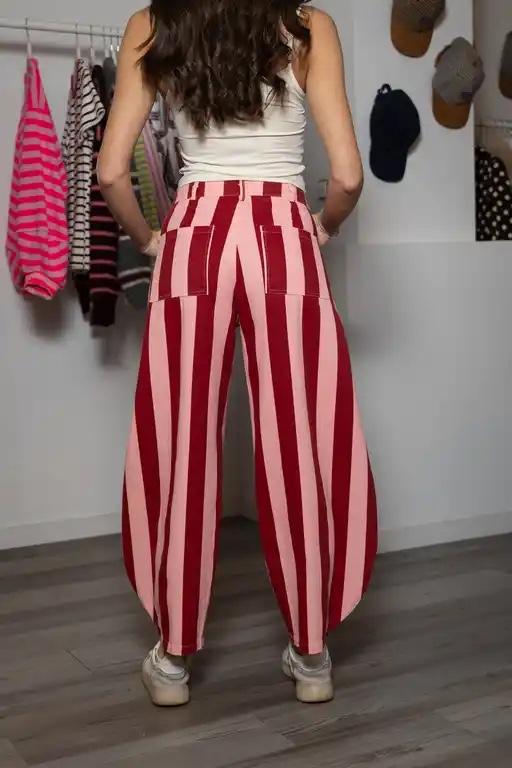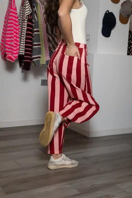 Pantalones denim en color rosa con rayas en rojo y corte en globo.