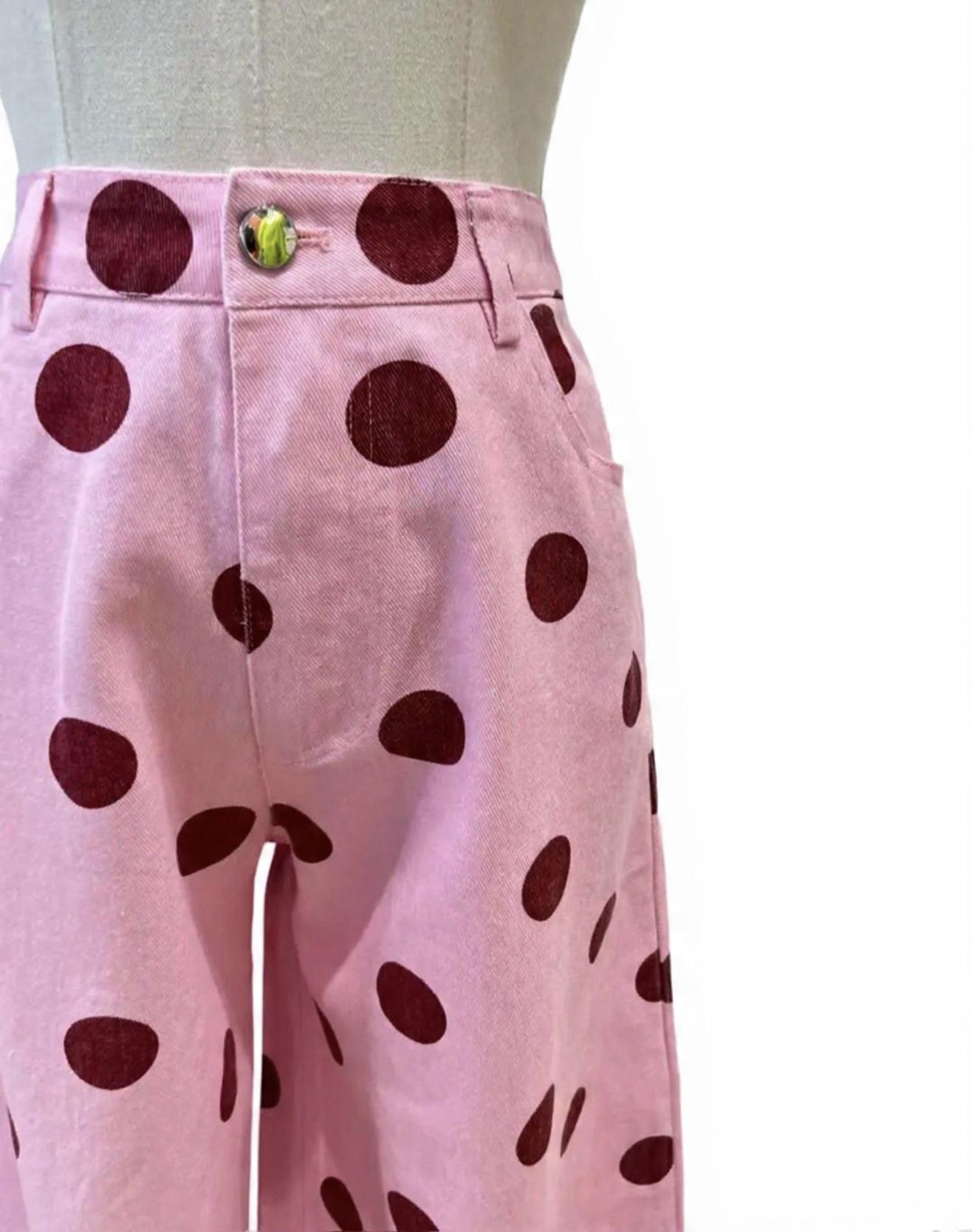 Pantalón denim en color rosa con topos en color rojo y corte en globo.