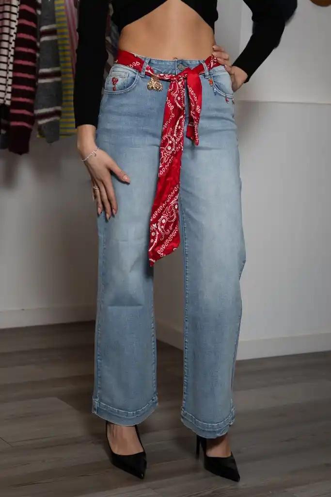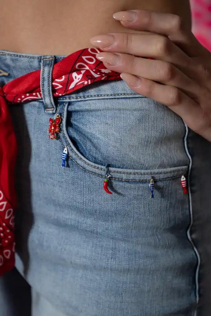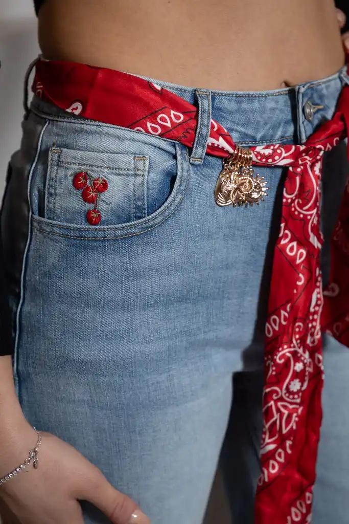 Denim de pata ancha y acampanado, con pañuelo y charms incluidos.