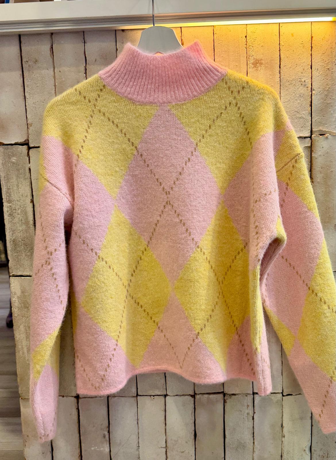 Jersey de punto ligeramente anchito, de cuello alto y estampado de rombos en color rosita y amarillo vainilla.