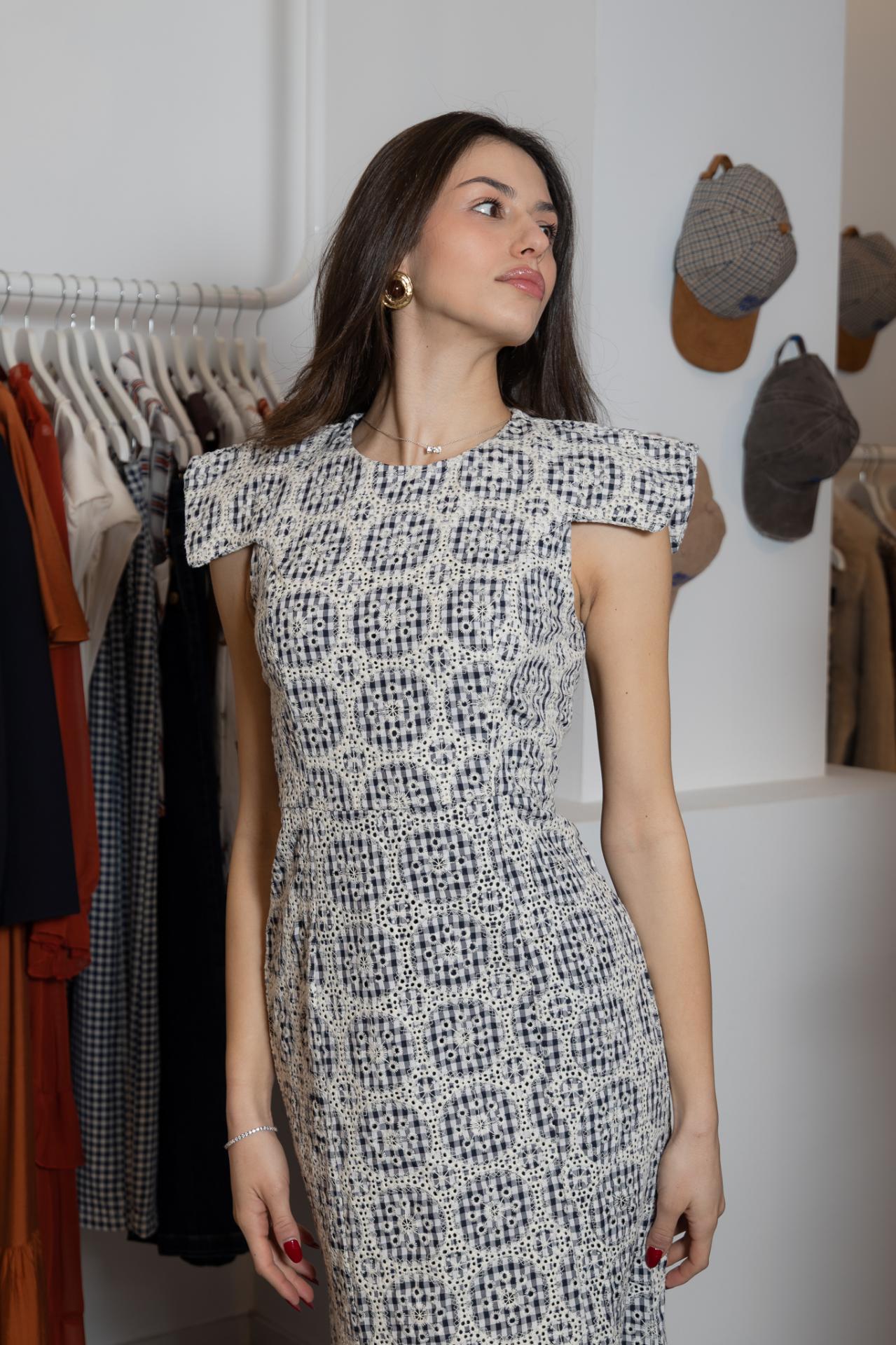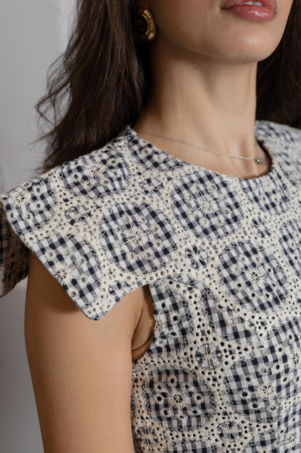 Vestido largo sin mangas, efecto capa sobre los hombros, fondo estampado en cuadro vichy azul marino y con bordados y troquelados en blanco.