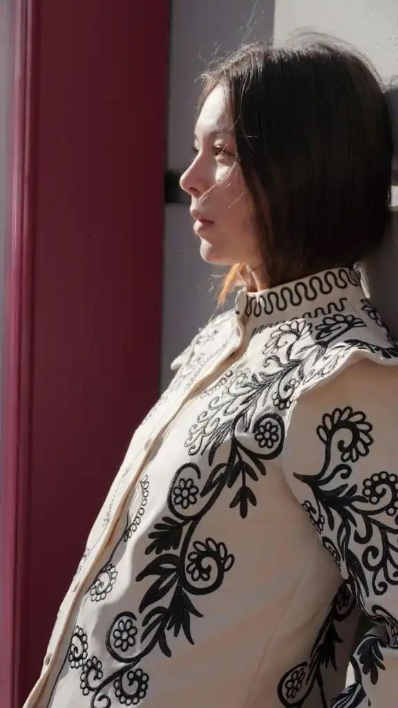 Chaqueta de corte a la cadera, de color blanco roto con bordados en negro, abotonada y con pequeñas solapas sobre los hombros. Va forrada. Una pieza muy original.