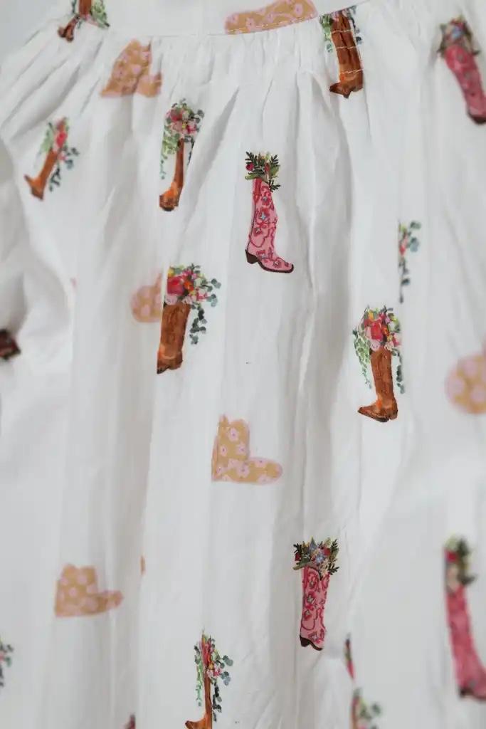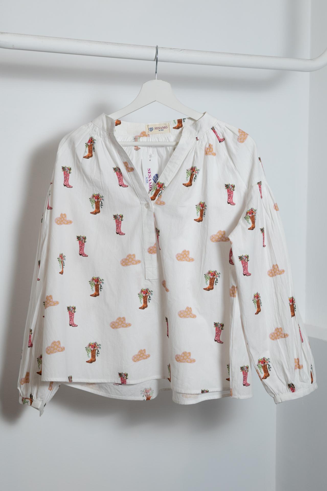 Camisa manga larga, con cuello mao, escote en V y mangas abullonadas. Estampado cowgirl.