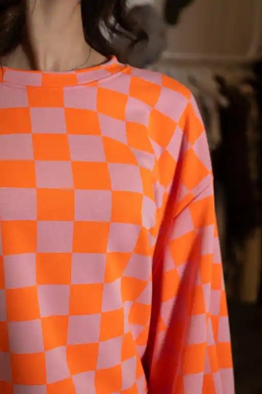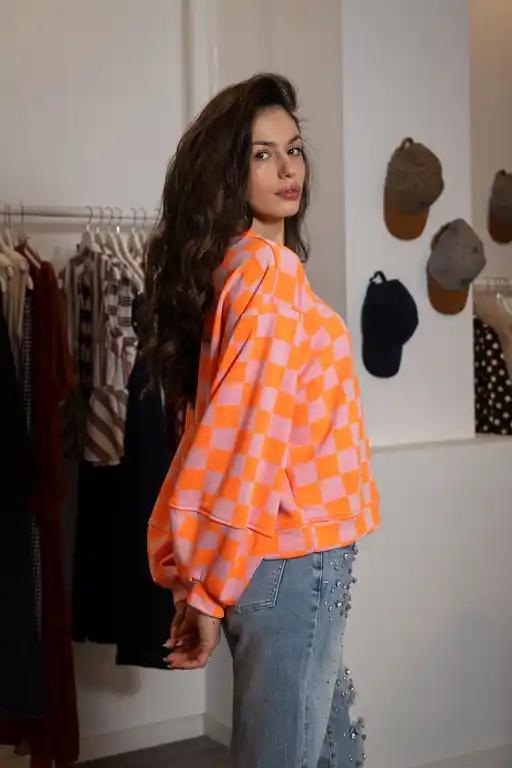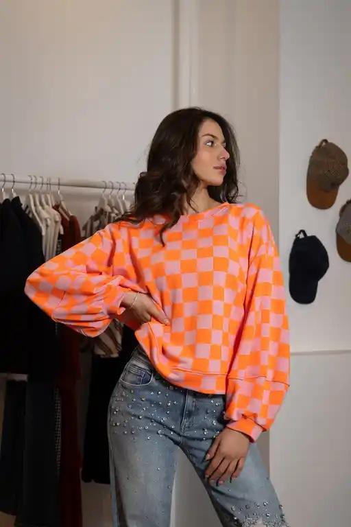 Sudadera de manga larga, ligeramente ancha, con estampado de cuadros en colores flúor.