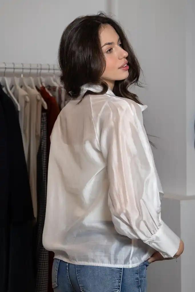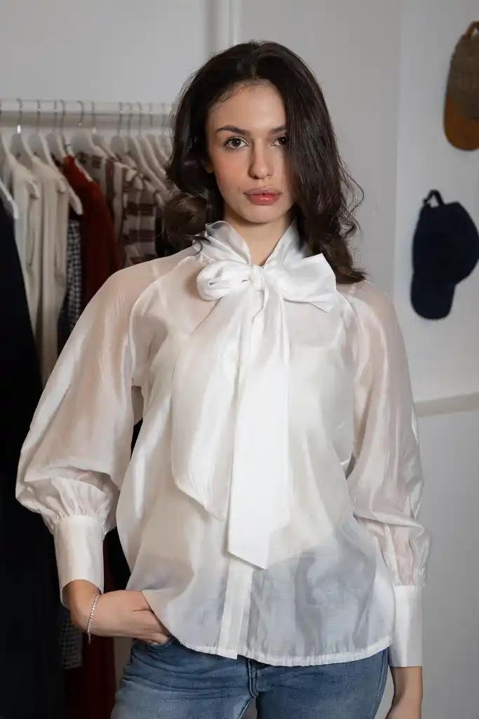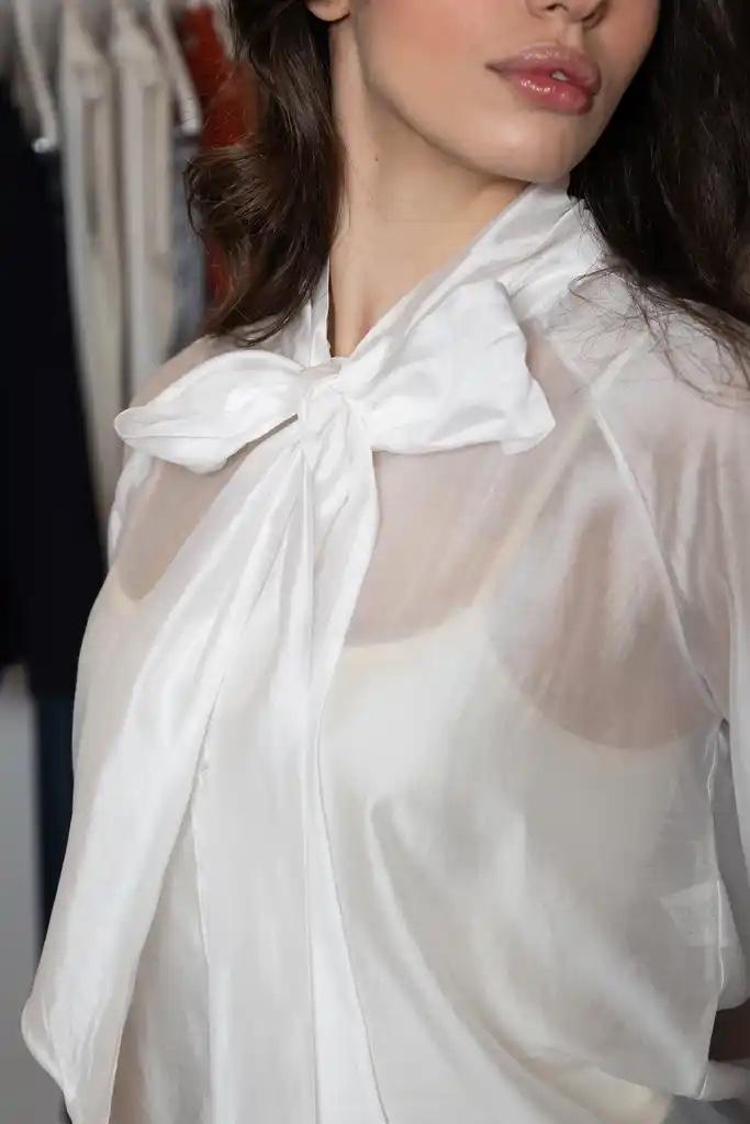Camisa en blanco de manga larga, cuello con lazo y abotonada.