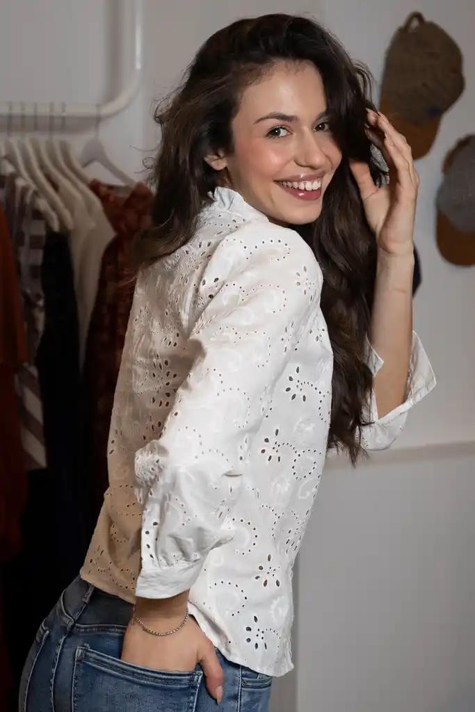 Blusa de manga larga, escote en V, con pequeño volante en el cuello, bordada y troquelada.