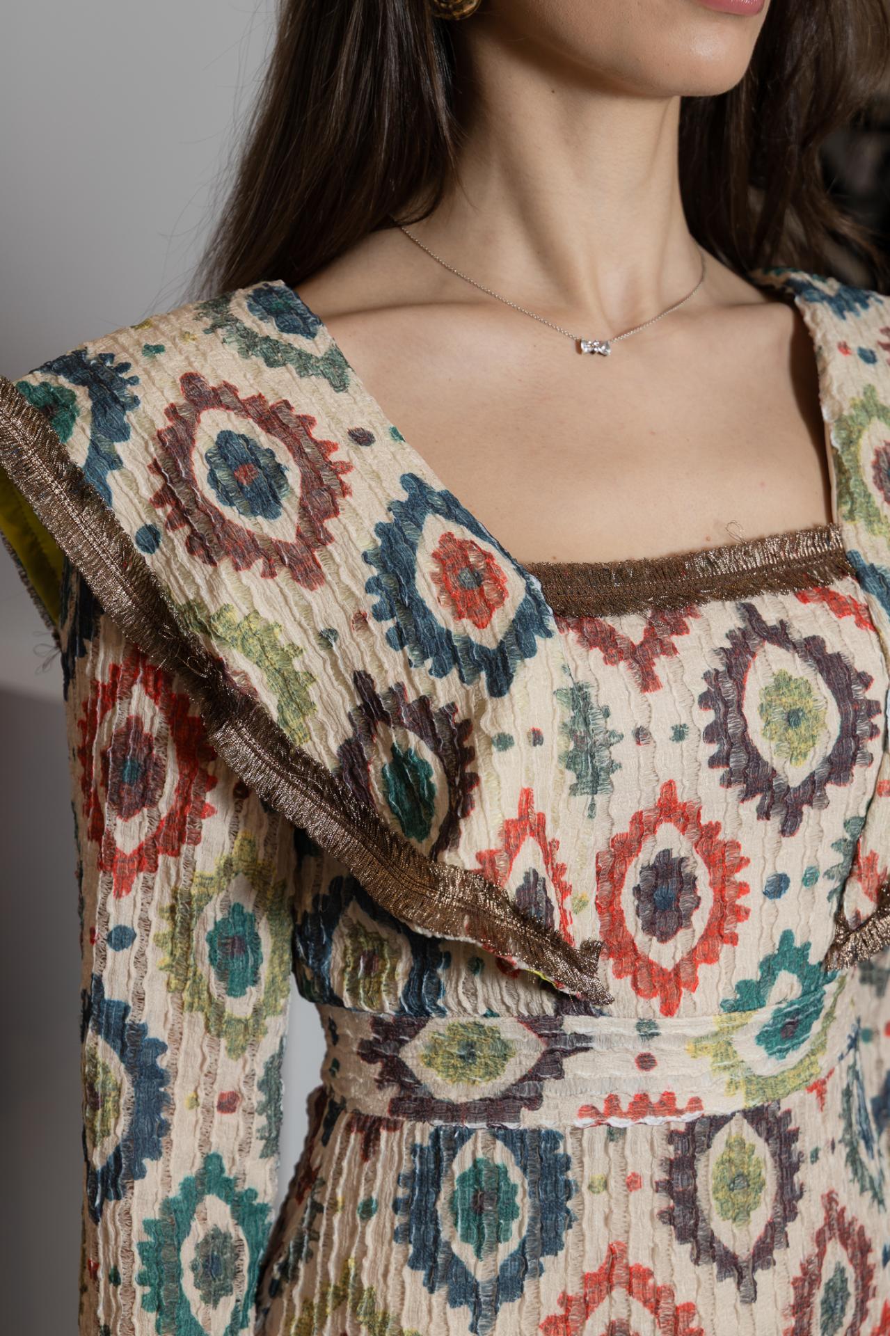 Vestido largo, de manga francesa, con estampados circulares en tonos tierra y solapas por encima de los hombros y con pequeñas tiras de hilos cosidos en dorado, dándole un toque super especial. Lleva forro.