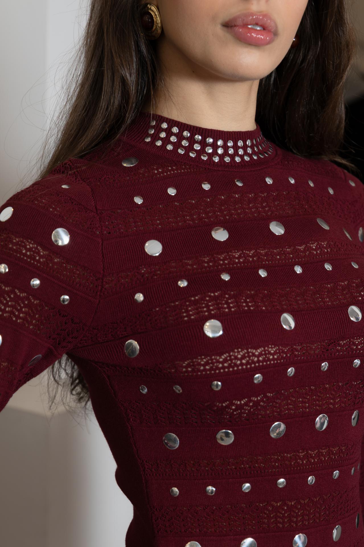 Vestido corto de punto, con manga larga, cuello cerrado y tachuelas en plateado.